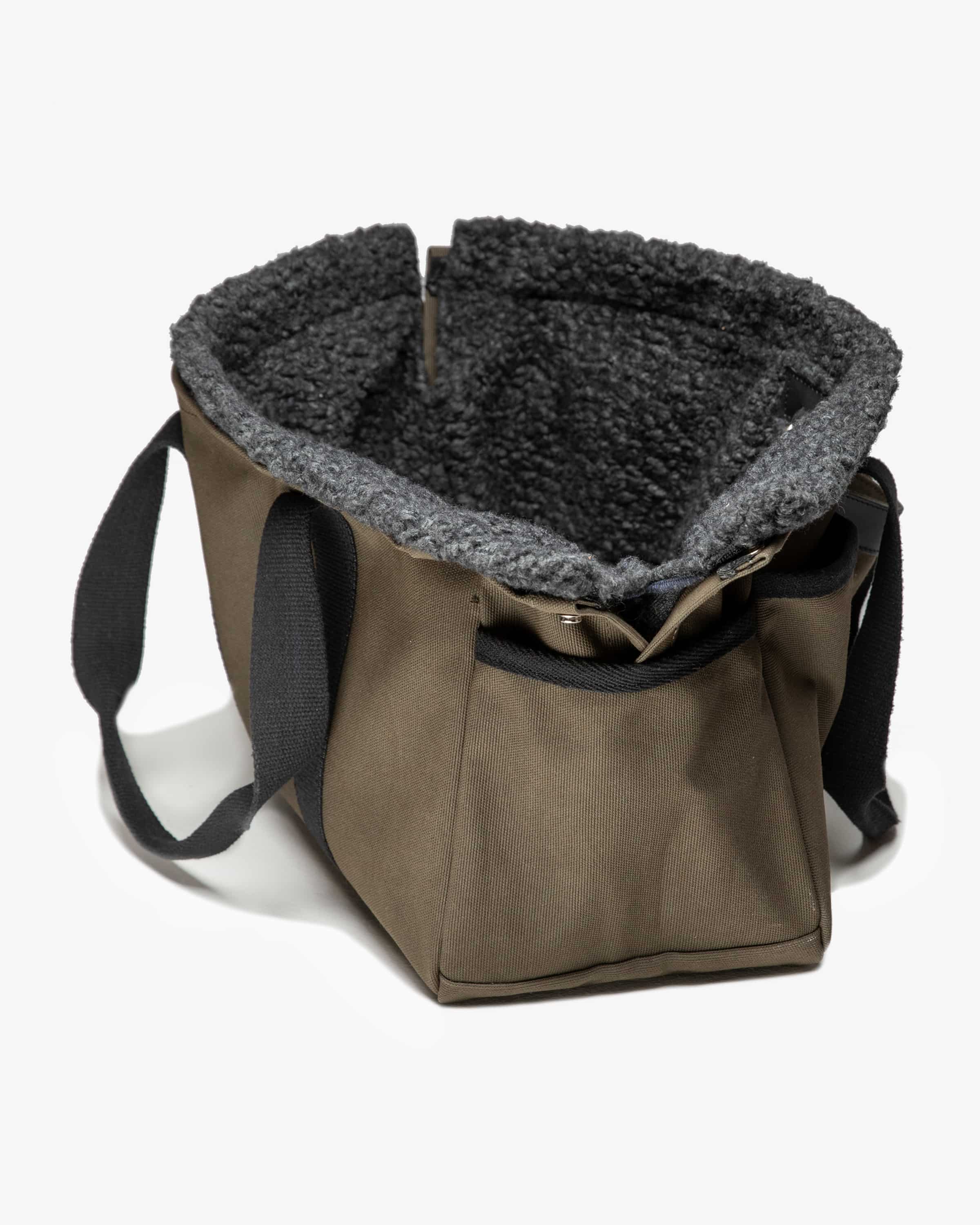 Diane Hundetasche von 2.8 Duepuntootto in Oliv und Schwarz. Dank des geräumigen Hauptfachs besticht das Modell als perfektes Accessoire für stilbewusste Hundebesitzer. Das herausnehmbare Innenfutter sorgt für eine kuschelige Atmosphäre für Ihren Vierbeiner, während diverse Taschen genug Stauraum für Spielzeug und Leckerlis bieten.