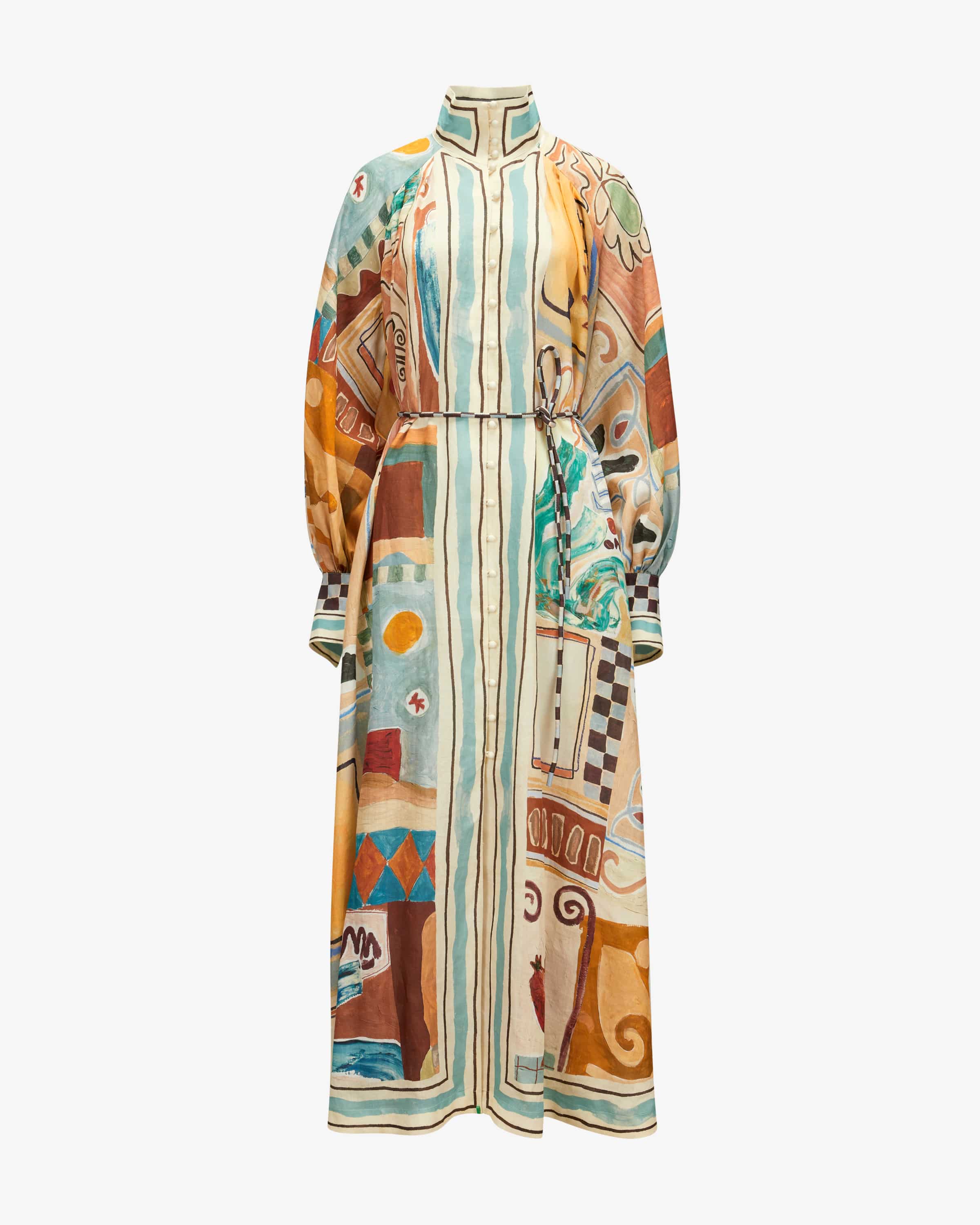 in modischer Malerei-Optik, während die weite Silhouette mit seitlich geknöpften