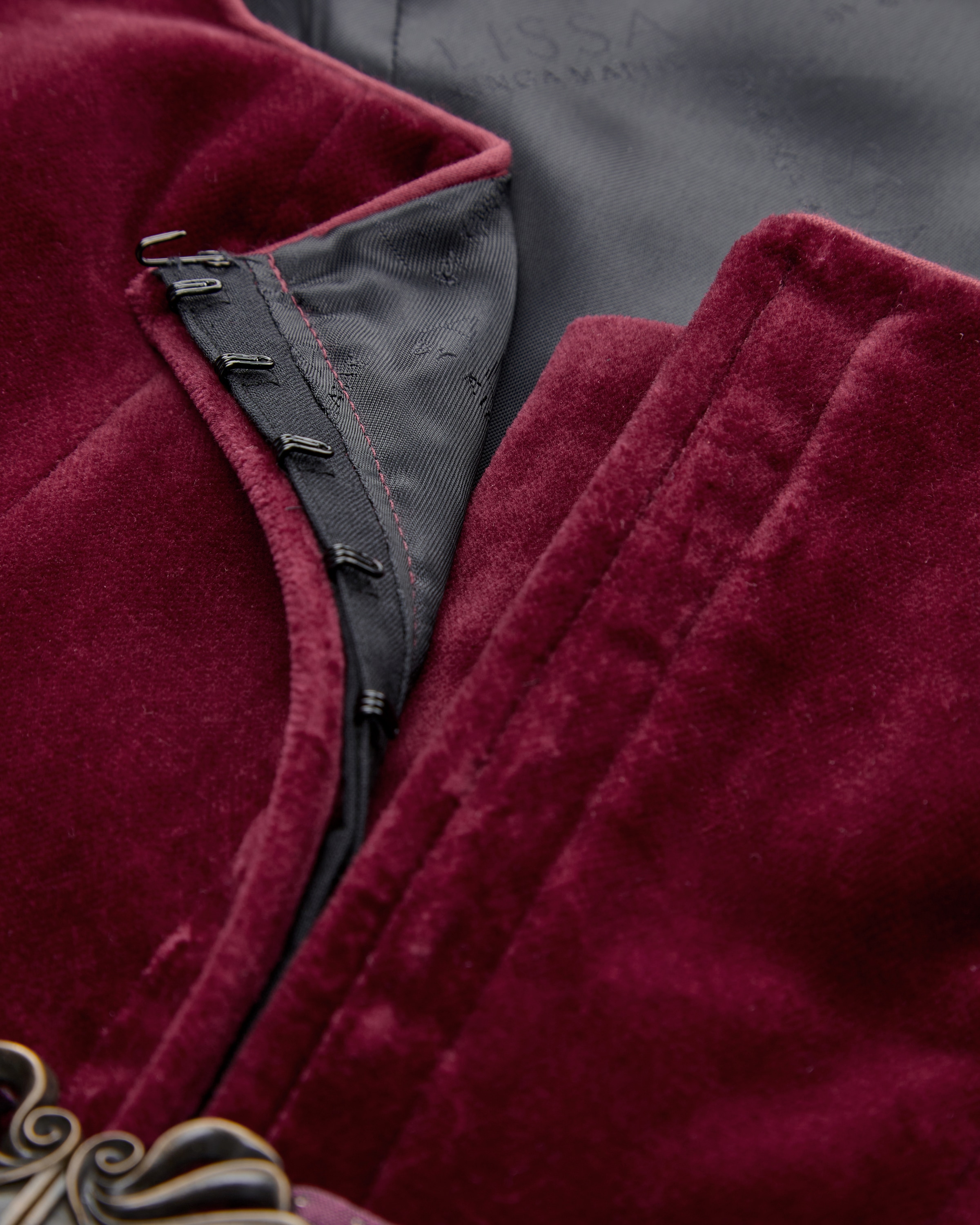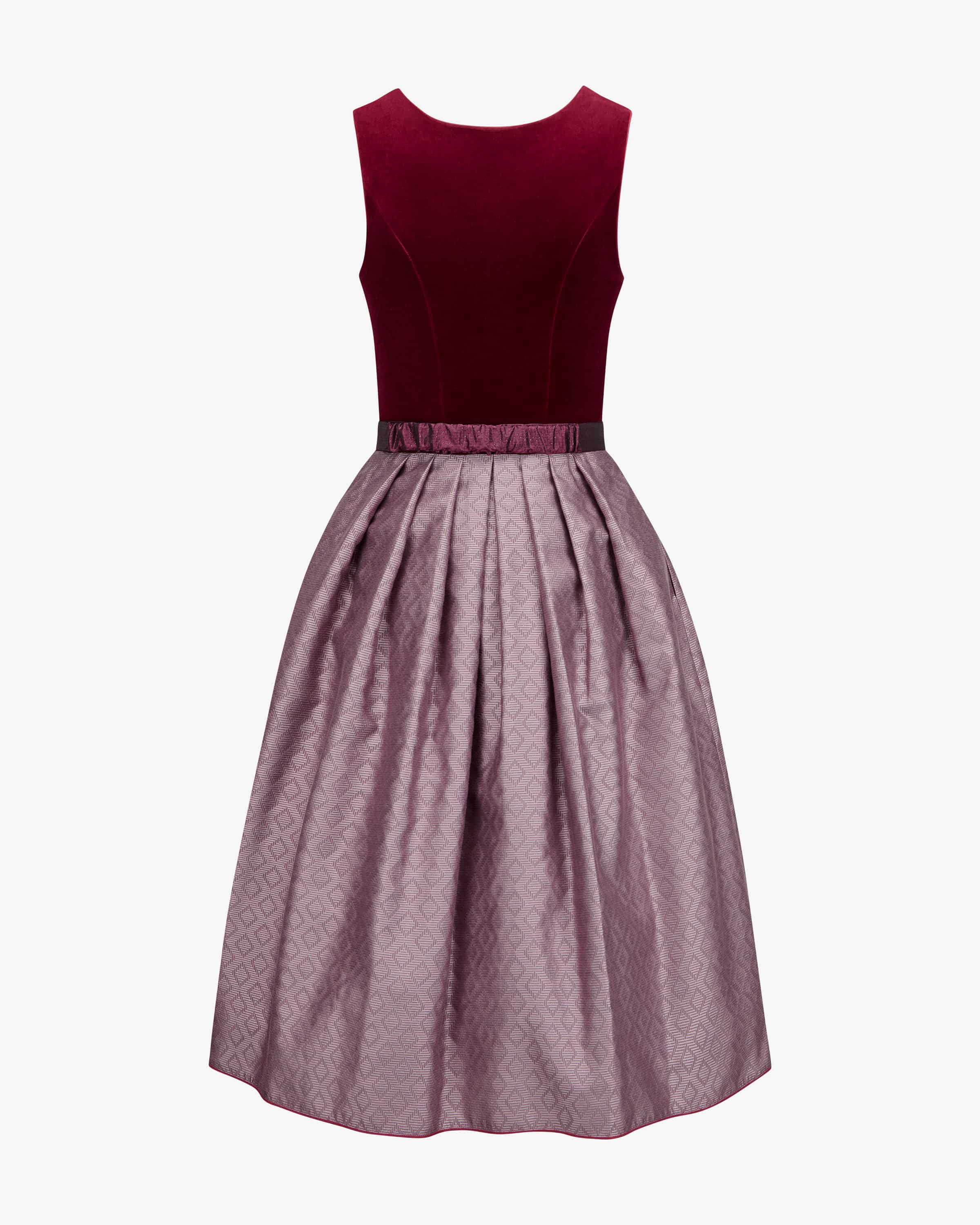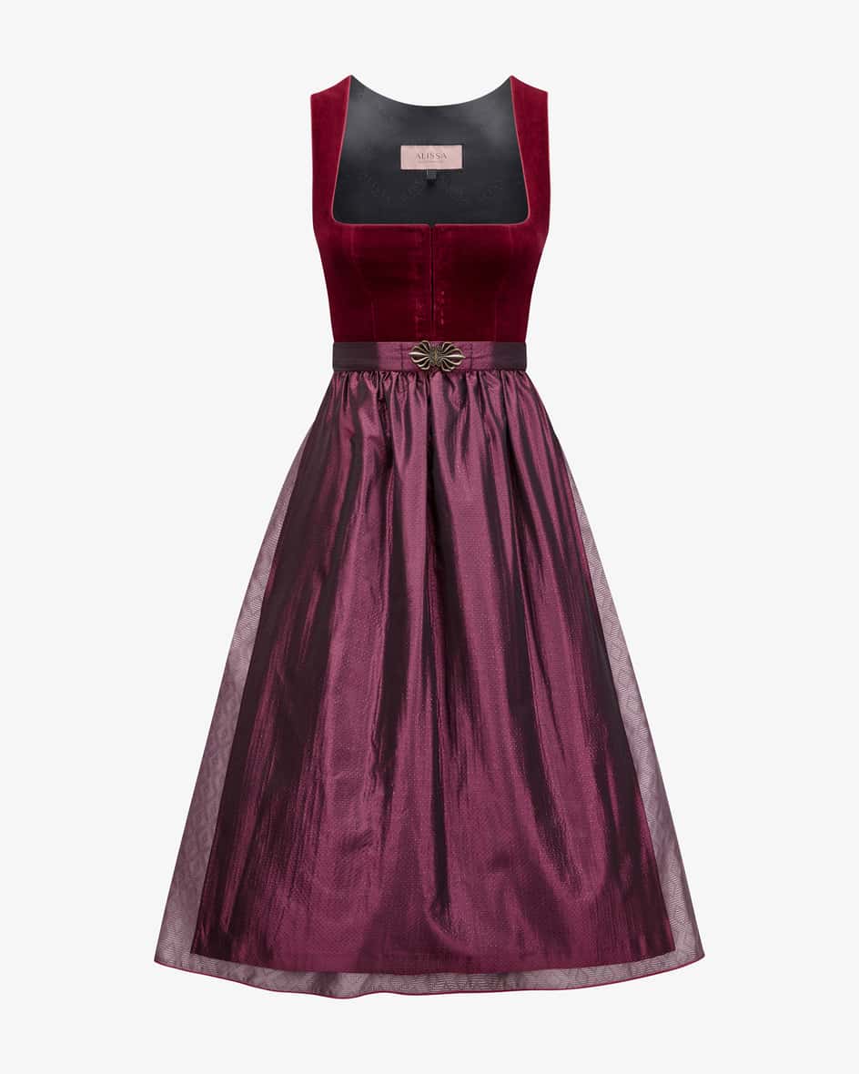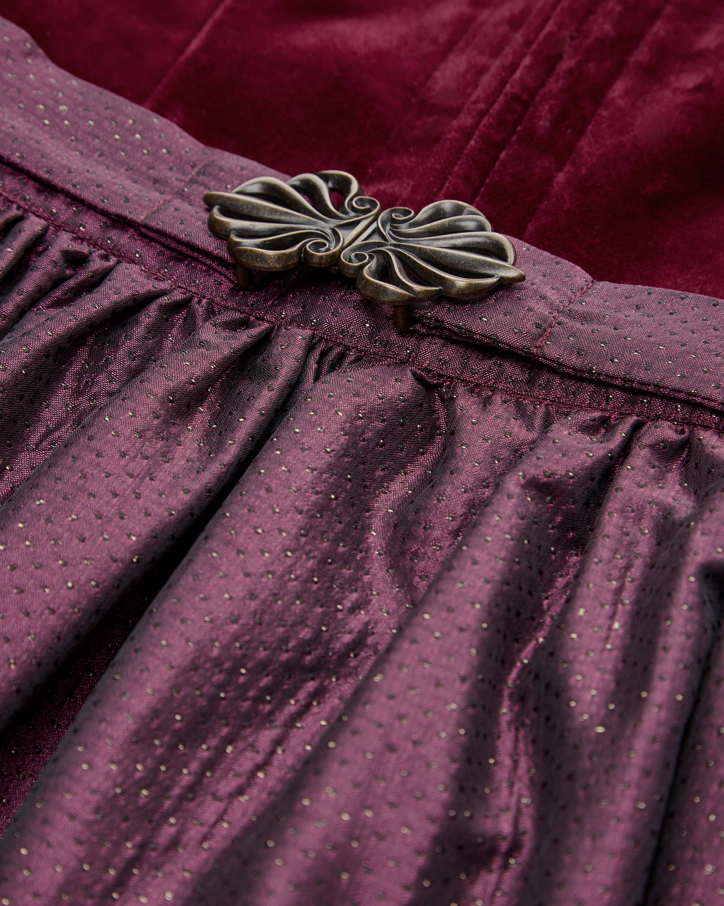 Lumi Dirndl lang mit Schürze für Damen von Alissa by Kinga Mathe in Wine und Rosa. Mit Liebe zum Detail entwirft das deutsche Label aufwendige Trachten- Kreationen mit dem gewissen Etwas und überzeugt mit erlesener Stoffauswahl sowie kreative Designs. Das Modell überzeugt mit Samt-Mieder und changierendem Jaquard-Rock, während der Unterrock mit Volants-Saum eine feminine Passform verleiht. Die gepunktete und zugleich changierende Schürze komplettiert den traditionellen Look harmonisch.