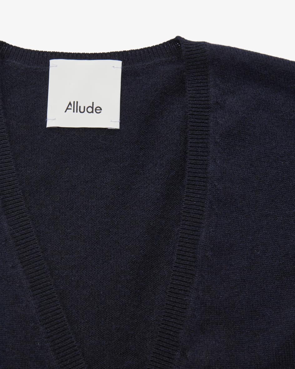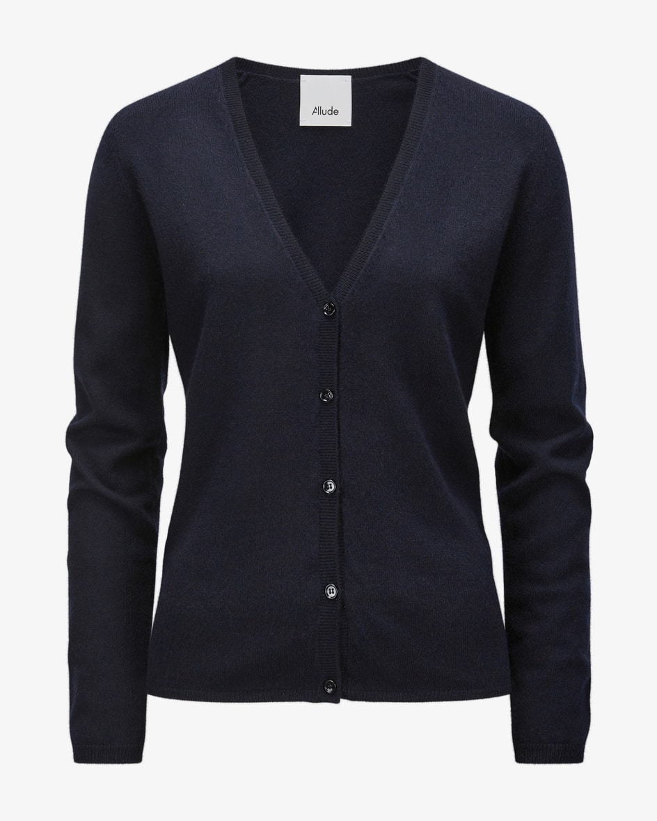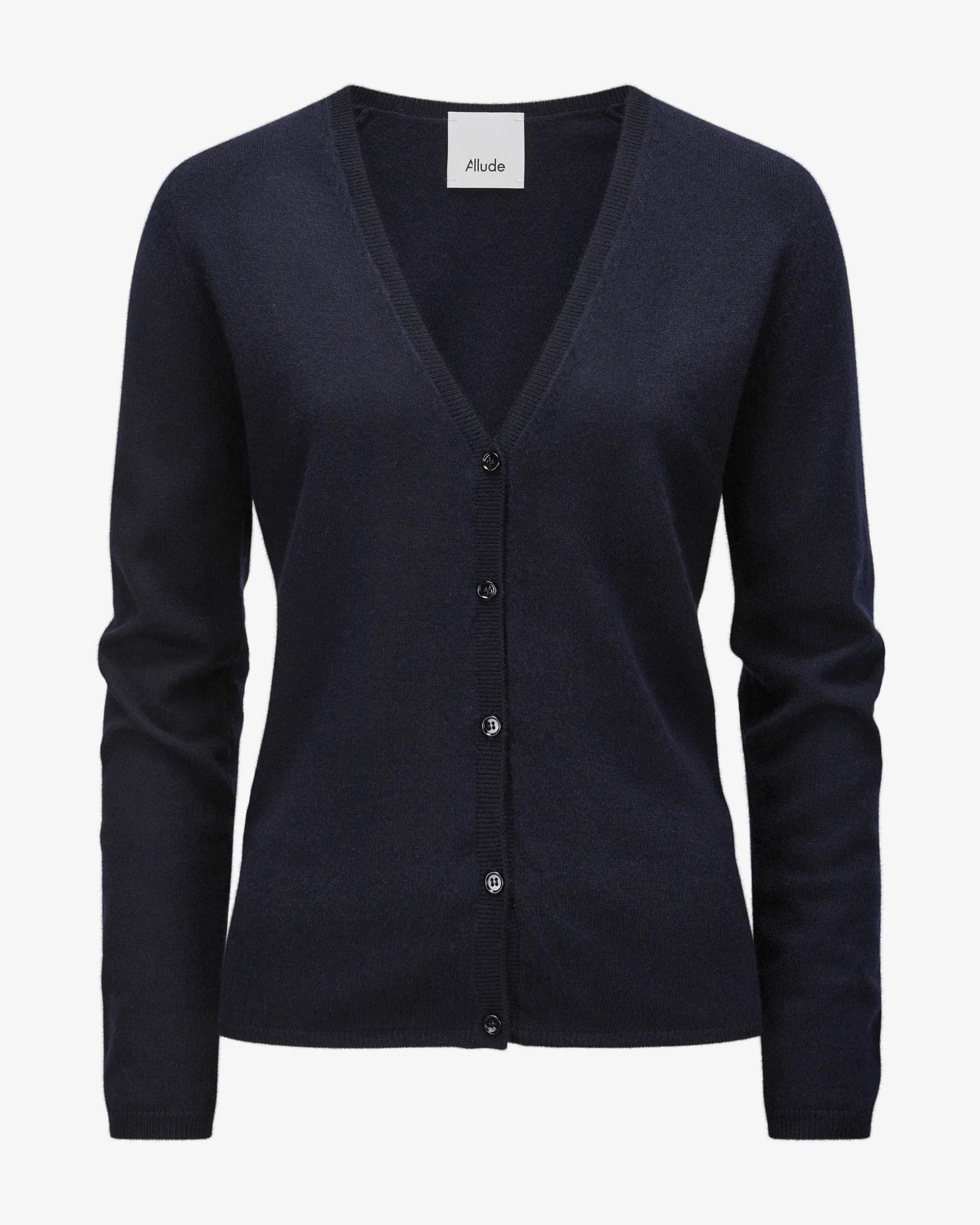 Cashmere-Strickjacke für Damen von Allude in Navy. Das Münchner Unternehmen Allude steht für Mode, die Selbstbewusstsein und zeitlose Individualität ausstrahlt. Gefertigt aus hochwertiger Cashmere-Wolle, besticht das schlichte Modell mit besonders weichem Griff und leichter Strick-Haptik, wodurch ein zeitloses Essential entsteht.