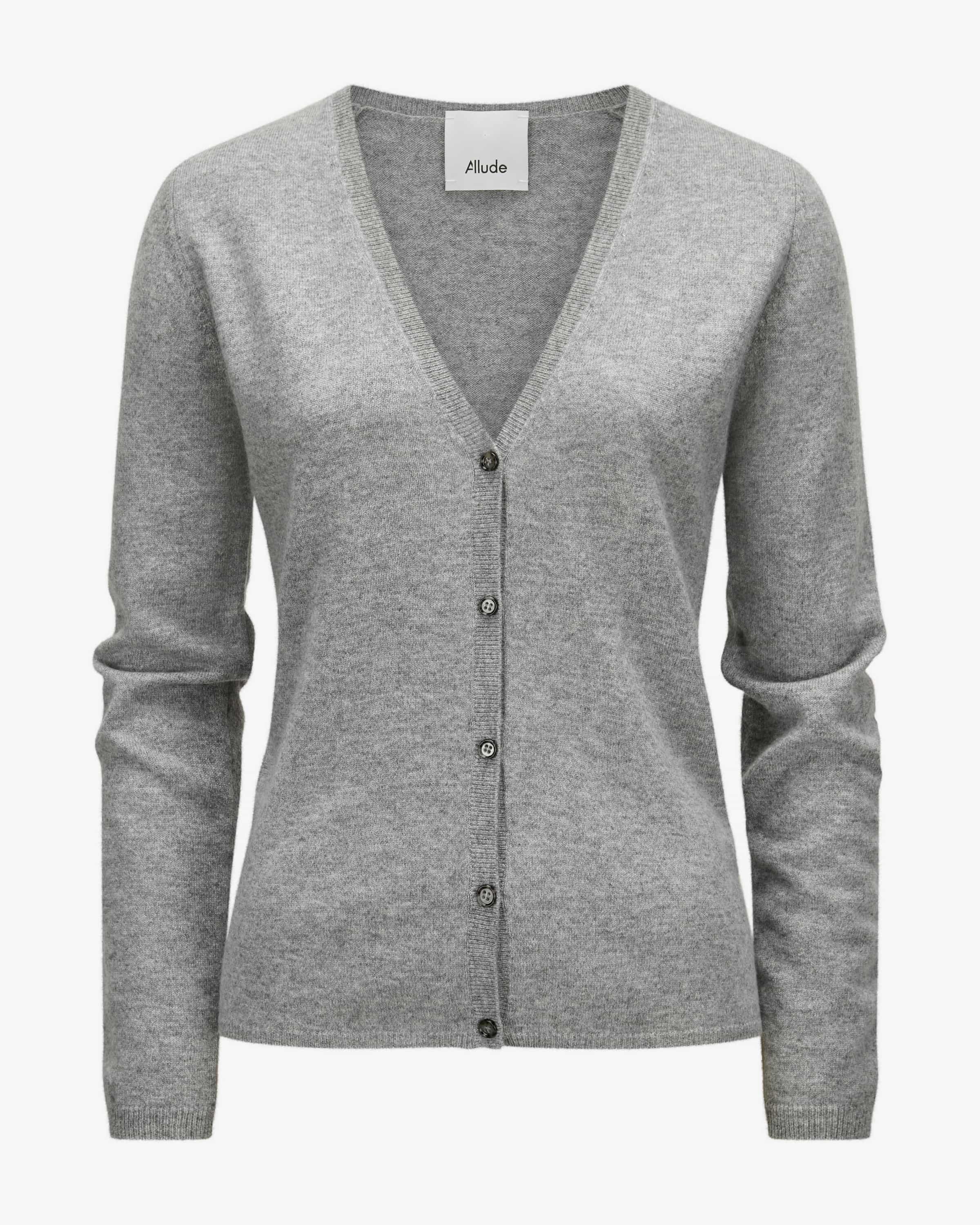 Cashmere-Strickjacke für Damen von Allude in Grau. Das Münchner Unternehmen Allude steht für Mode, die Selbstbewusstsein und zeitlose Individualität ausstrahlt. Gefertigt aus hochwertiger Cashmere-Wolle, besticht das schlichte Modell mit besonders weichem Griff und leichter Strick-Haptik, wodurch ein zeitloses Essential entsteht.
