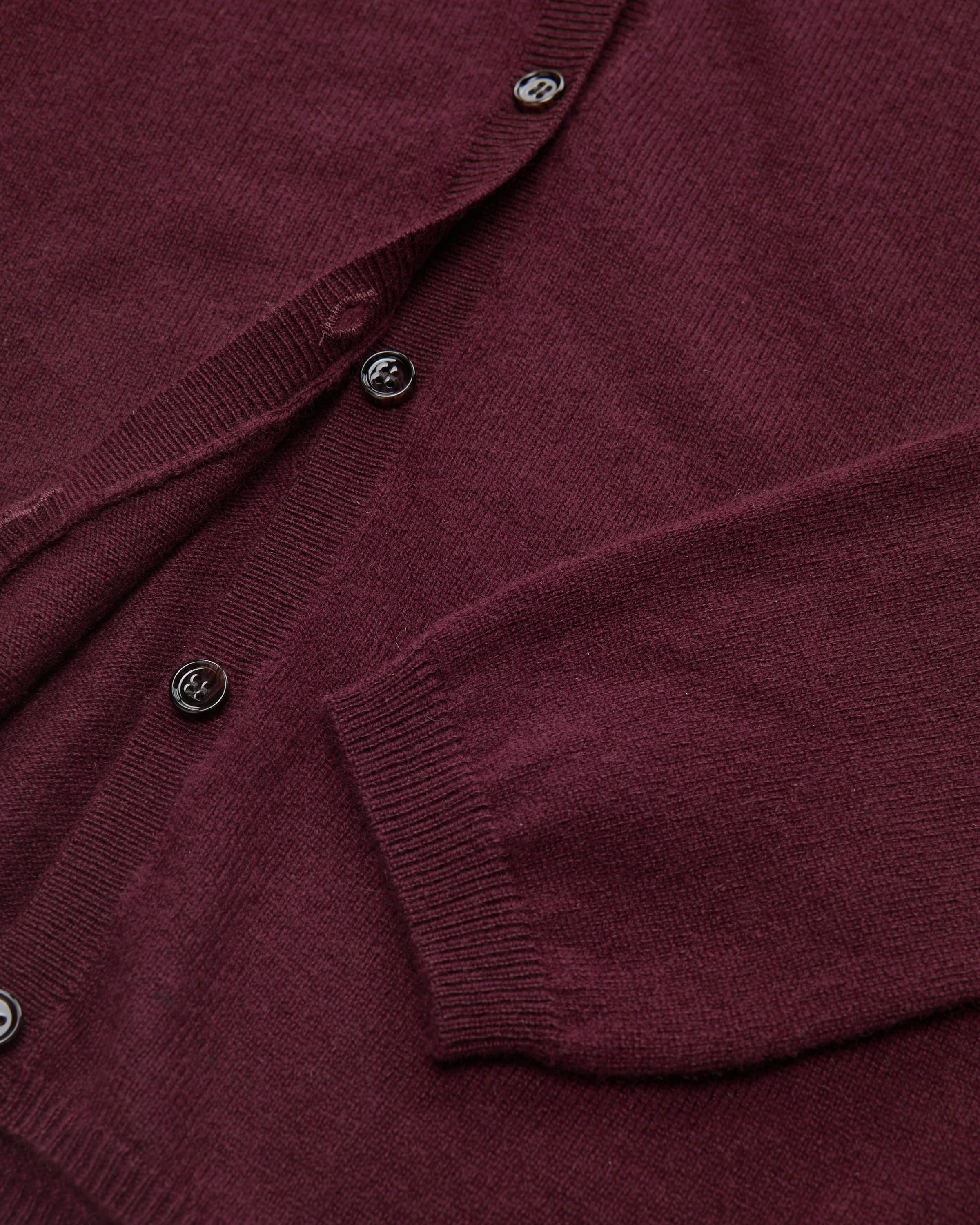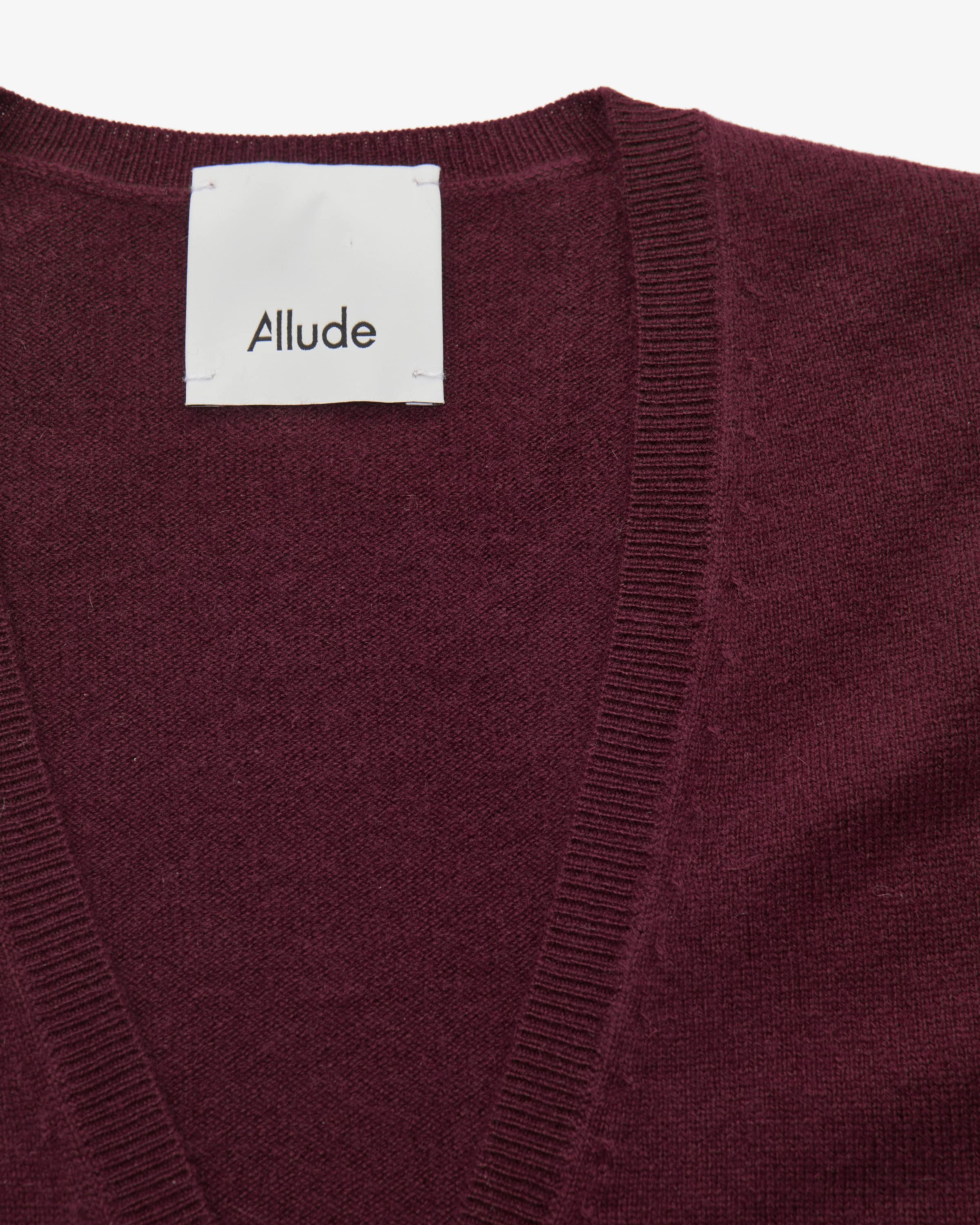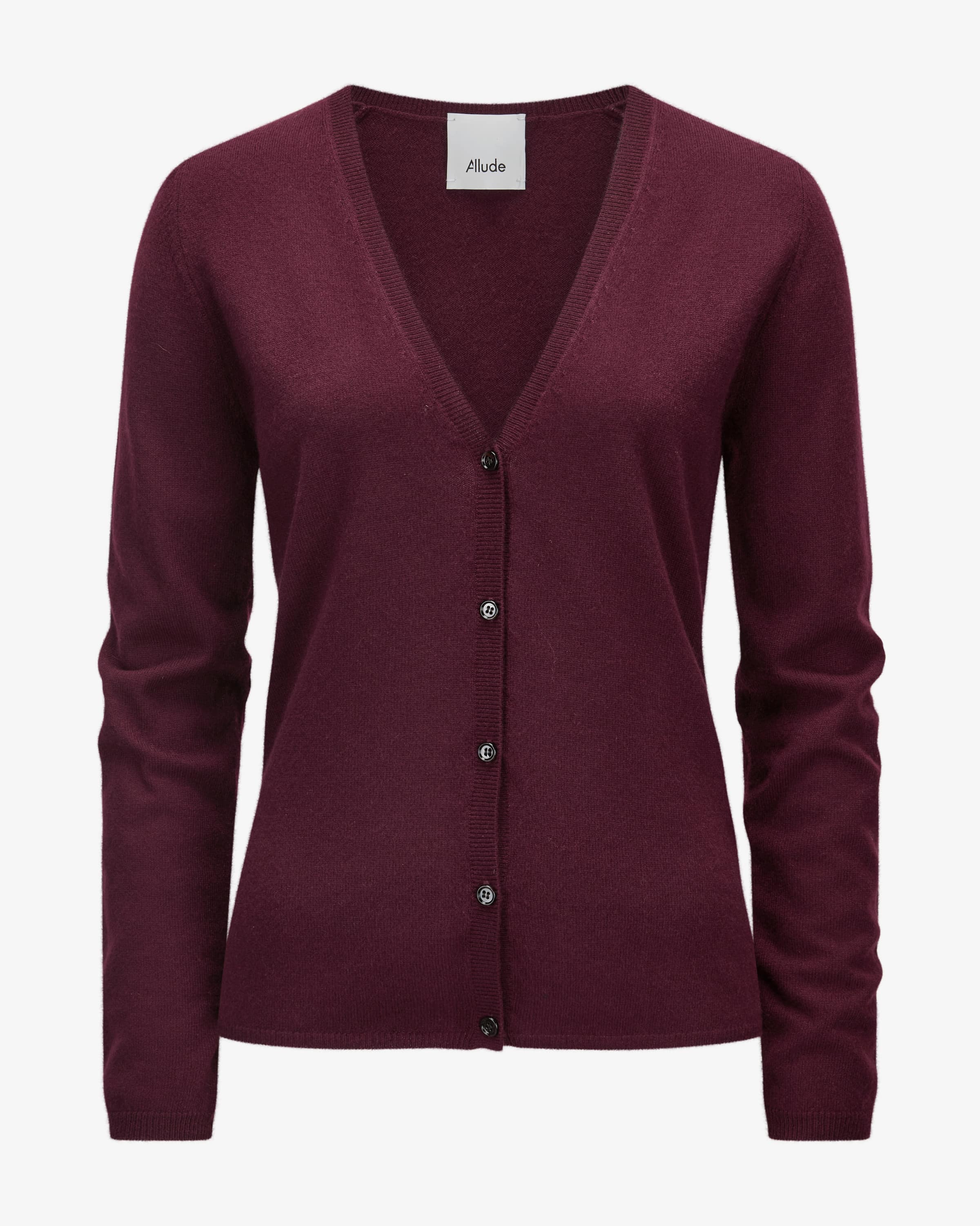 Cashmere-Strickjacke für Damen von Allude in Bordeaux. Das Münchner Unternehmen Allude steht für Mode, die Selbstbewusstsein und zeitlose Individualität ausstrahlt. Gefertigt aus hochwertiger Cashmere-Wolle, besticht das schlichte Modell mit besonders weichem Griff und leichter Strick-Haptik, wodurch ein zeitloses Essential entsteht.