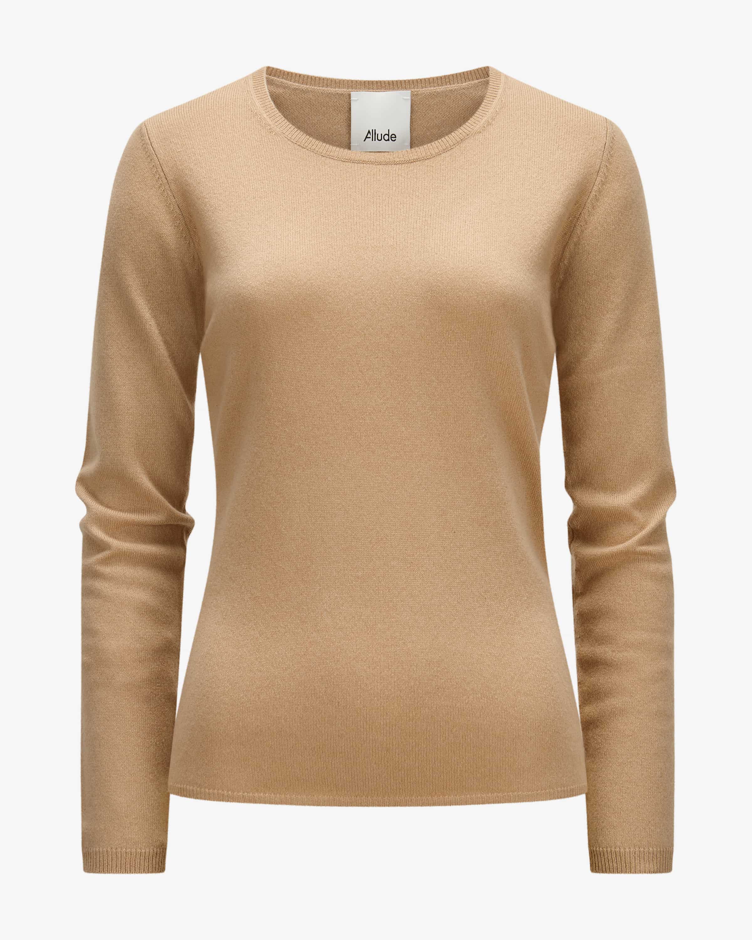 Pullover für Damen von Allude in Camel. Das Münchner Unternehmen Allude steht für Mode, die Selbstbewusstsein und zeitlose Individualität ausstrahlt. Gefertigt aus hochwertiger Cashmere-Wolle, besticht das Modell mit weicher Haptik, während das klassische Design ein zeitloses wie auch kombistarkes Strick-Essential kreiert.