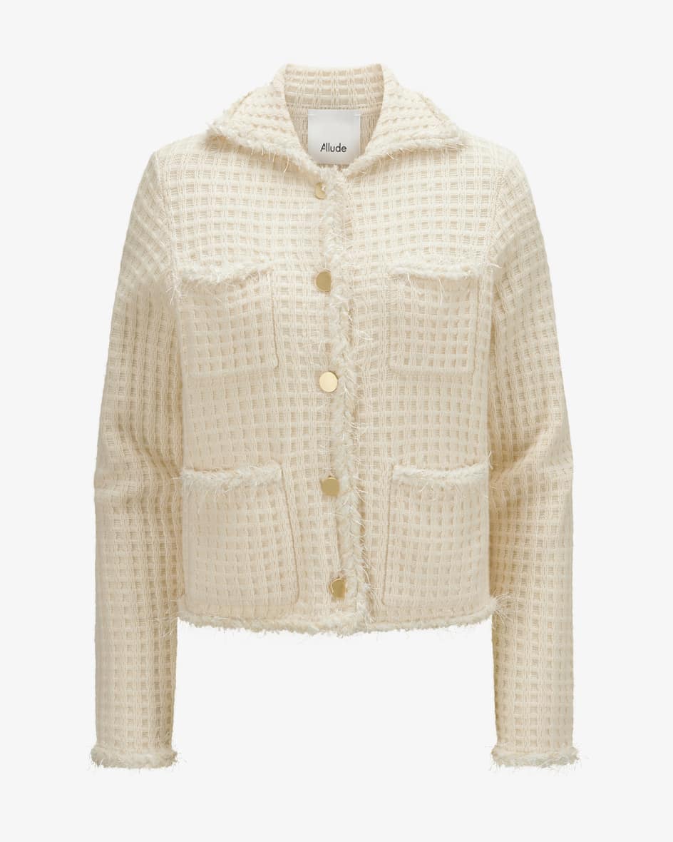 Strickjacke für Damen von Allude in Creme. Das Münchner Label wurde 1993 von Andrea Karg gegründet und ist bekannt für luxuriöse Strickmode aus edlem Cashmere. Auch dieses Modell überzeugt mit weichem Schurwolle-Cashmere-Mix in feiner Karo-Strick-Qualität, während die goldfarbenen Knöpfe den femininen Look gekonnt ergänze und einen edlen Begleiter kreieren.