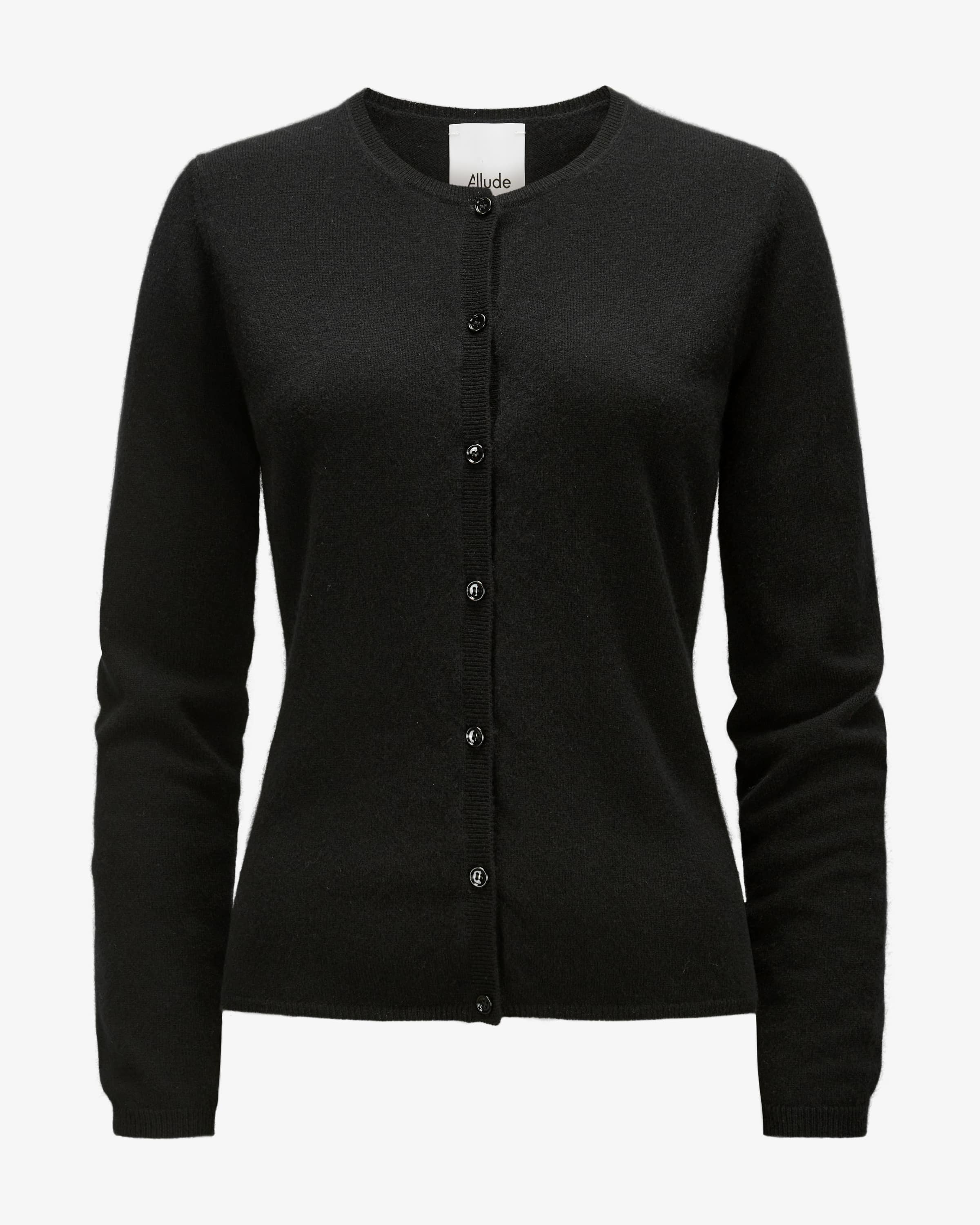 Strickjacke für Damen von Allude in Schwarz. Das Münchner Unternehmen Allude steht für Mode, die Selbstbewusstsein und zeitlose Individualität ausstrahlt. Gefertigt aus hochwertiger Cashmere-Wolle, besticht das Modell mit weicher und leichter Haptik, während das feine Strick-Design ein hochwertiges Essential schafft.