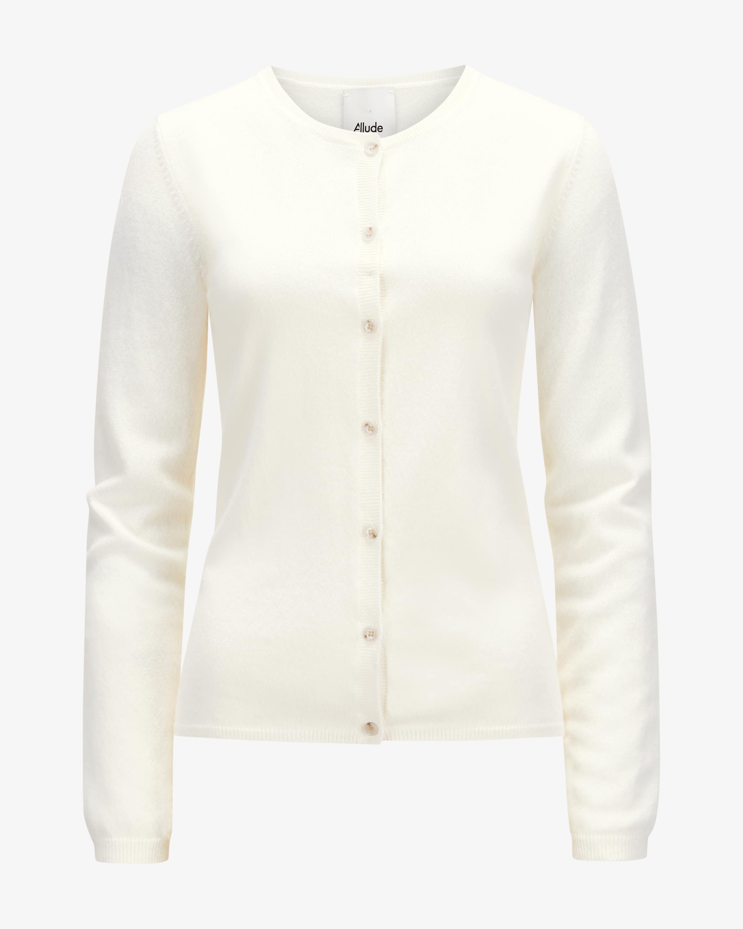 Strickjacke für Damen von Allude in Off-White. Das Münchner Unternehmen Allude steht für Mode, die Selbstbewusstsein und zeitlose Individualität ausstrahlt. Gefertigt aus hochwertiger Cashmere-Wolle, besticht das Modell mit weicher und leichter Haptik, während das feine Strick-Design ein hochwertiges Essential schafft.