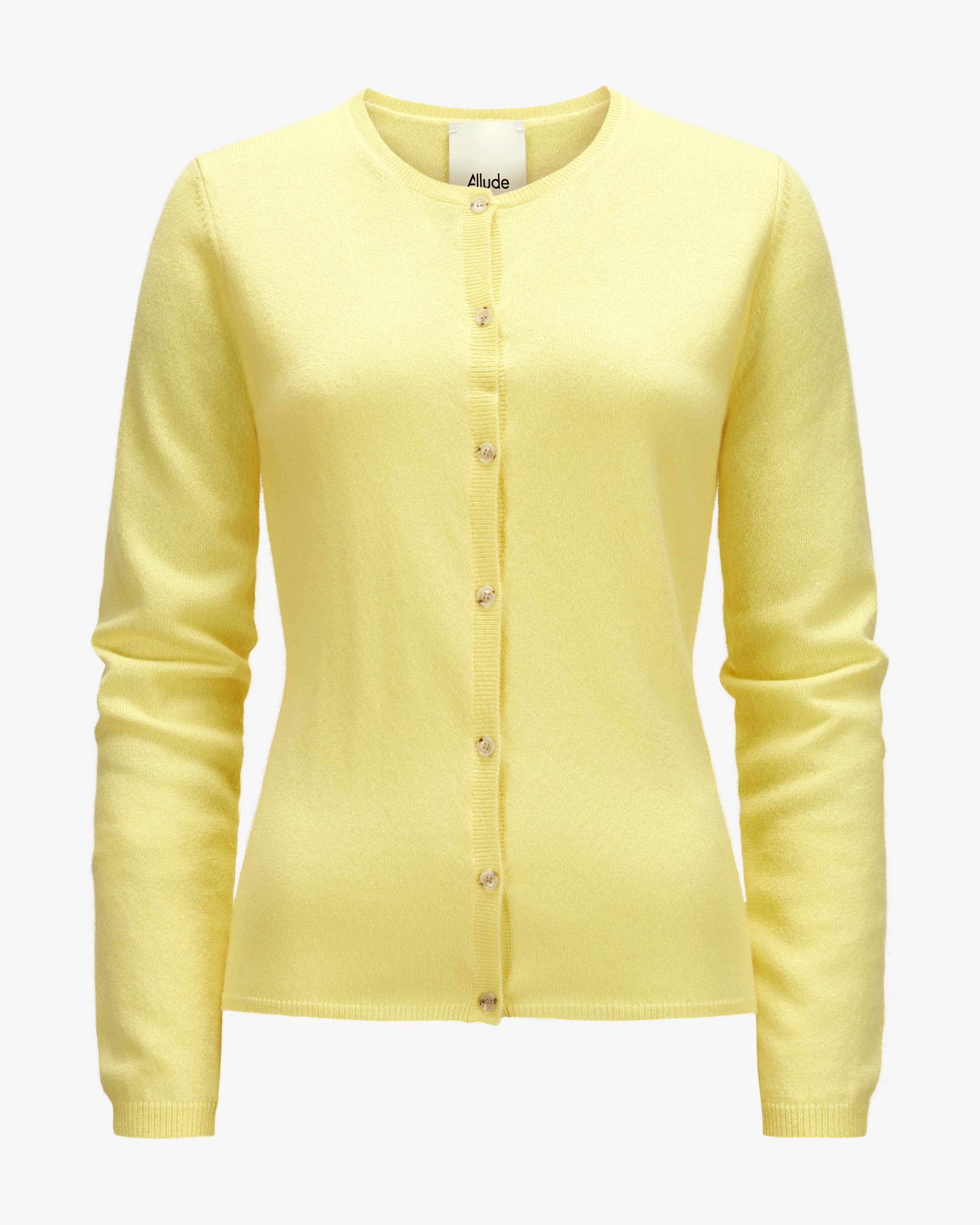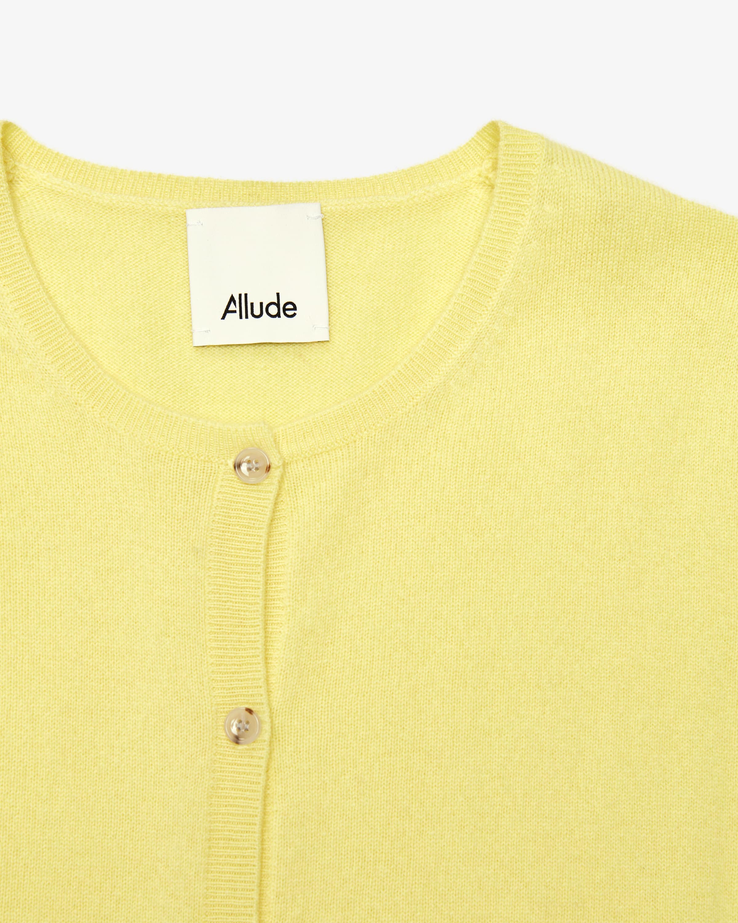 Strickjacke für Damen von Allude in Zitrone. Das Münchner Unternehmen Allude steht für Mode, die Selbstbewusstsein und zeitlose Individualität ausstrahlt. Gefertigt aus hochwertiger Cashmere-Wolle, besticht das Modell mit weicher und leichter Haptik, während das feine Strick-Design ein hochwertiges Essential schafft.