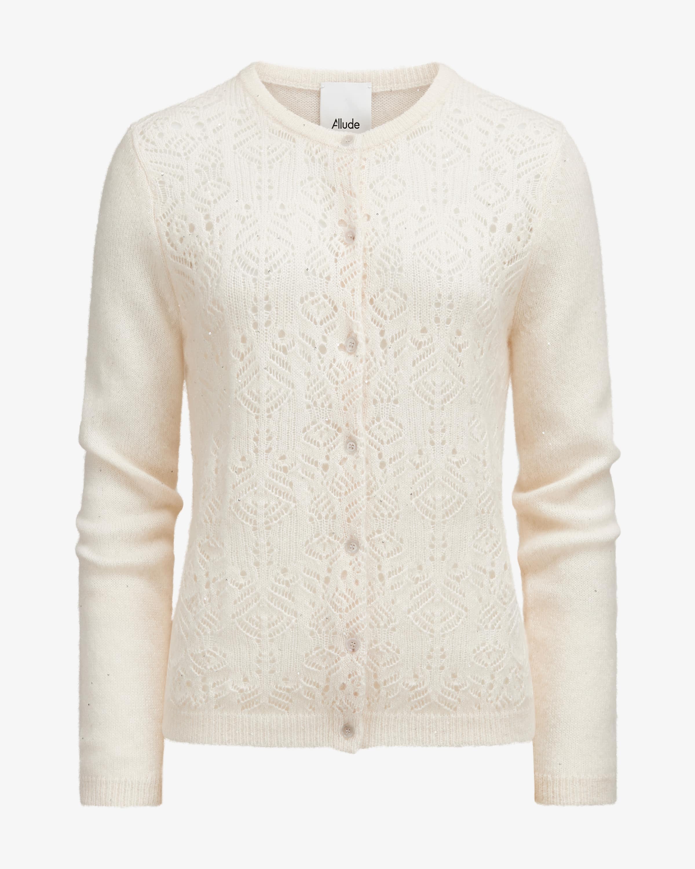 Strickjacke für Damen von Allude in Creme. Das Münchner Unternehmen Allude steht für Mode, die Selbstbewusstsein und zeitlose Individualität ausstrahlt. Gefertigt aus hochwertigem Cashmere-Seiden-Mix, besticht das Modell mit angenehmer Haptik, während das modische Lochstrick-Muster sowie changierende Pailletten-Applikationen ein stilvolles Gesamtbild kreieren.