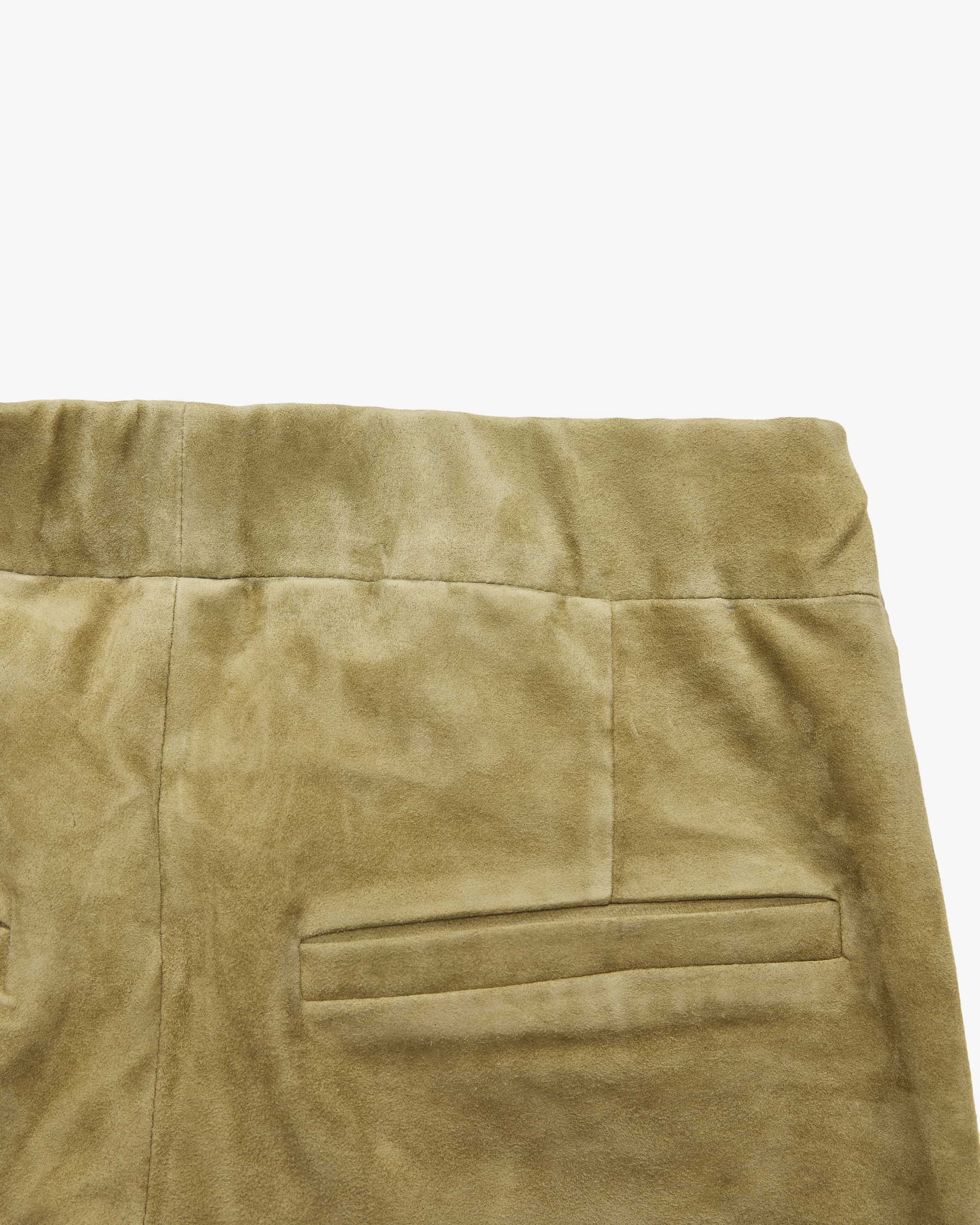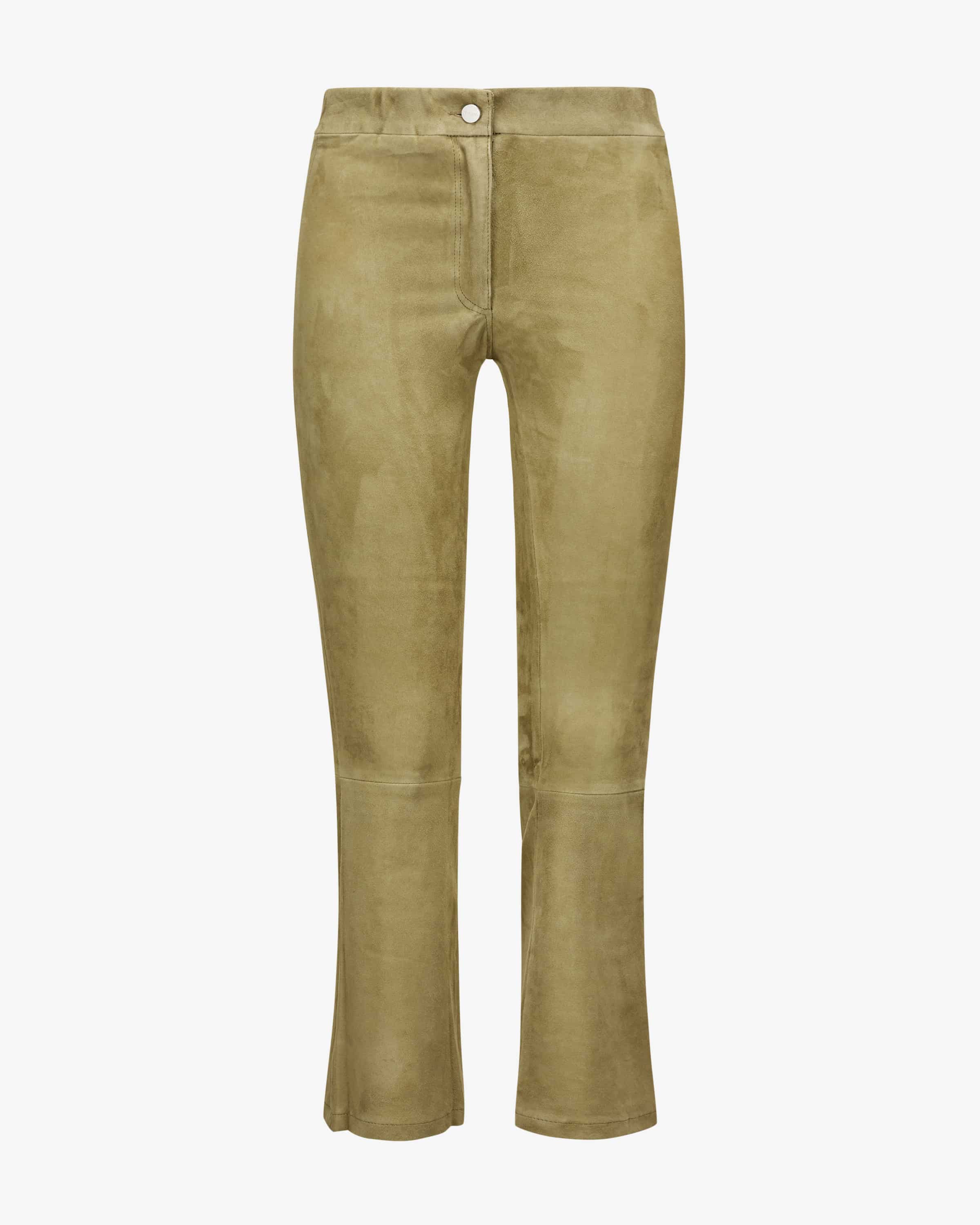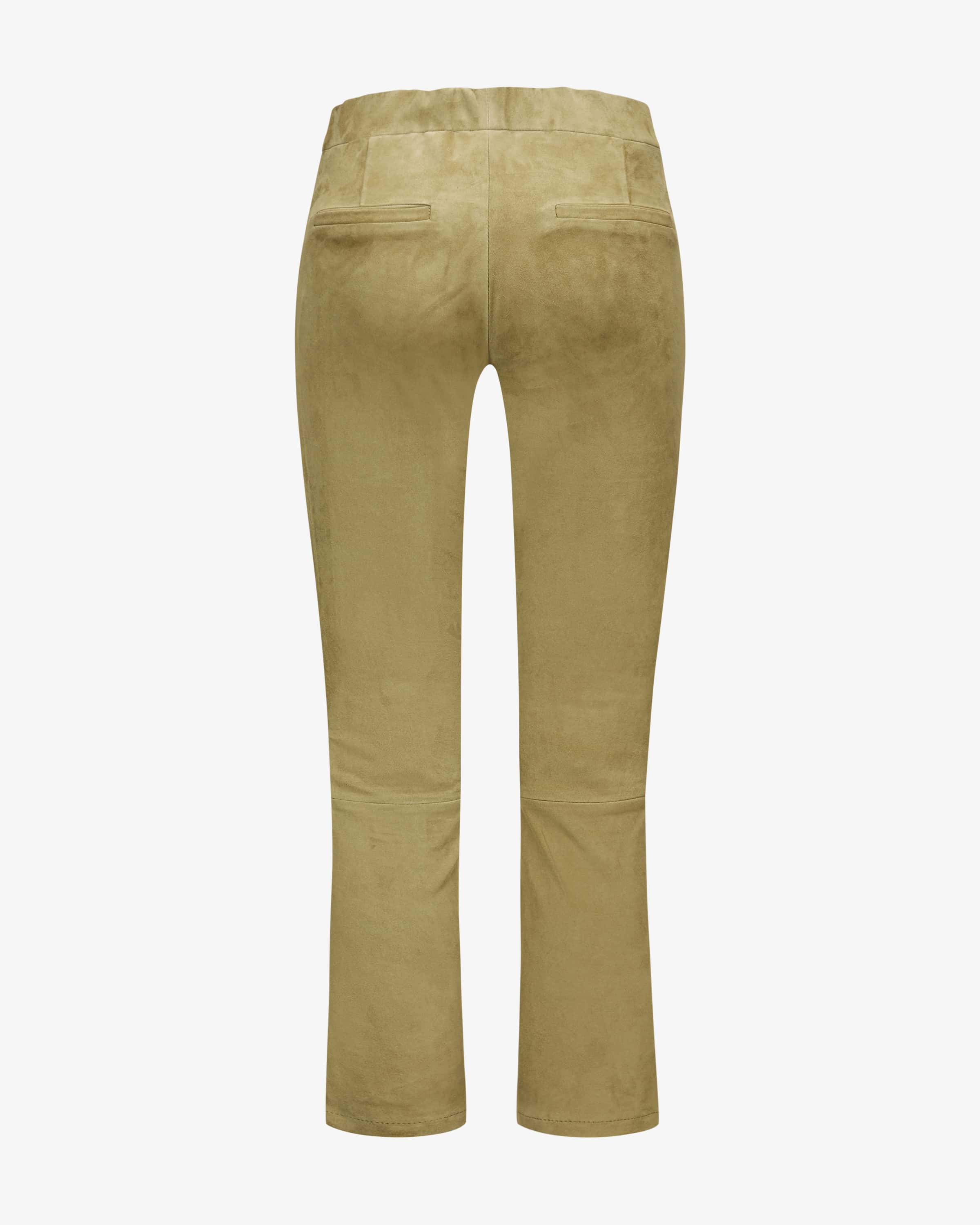 7/8-Lederhose Lively für Damen von Arma in Oliv. Perfektionieren Sie Ihre Freizeit-Garderobe mit diesem vielseitig kombinierbaren Piece aus Lammvelours. Der elastische Bund und der dezente Flared-Schnitt sorgen für eine feminine Silhouette.