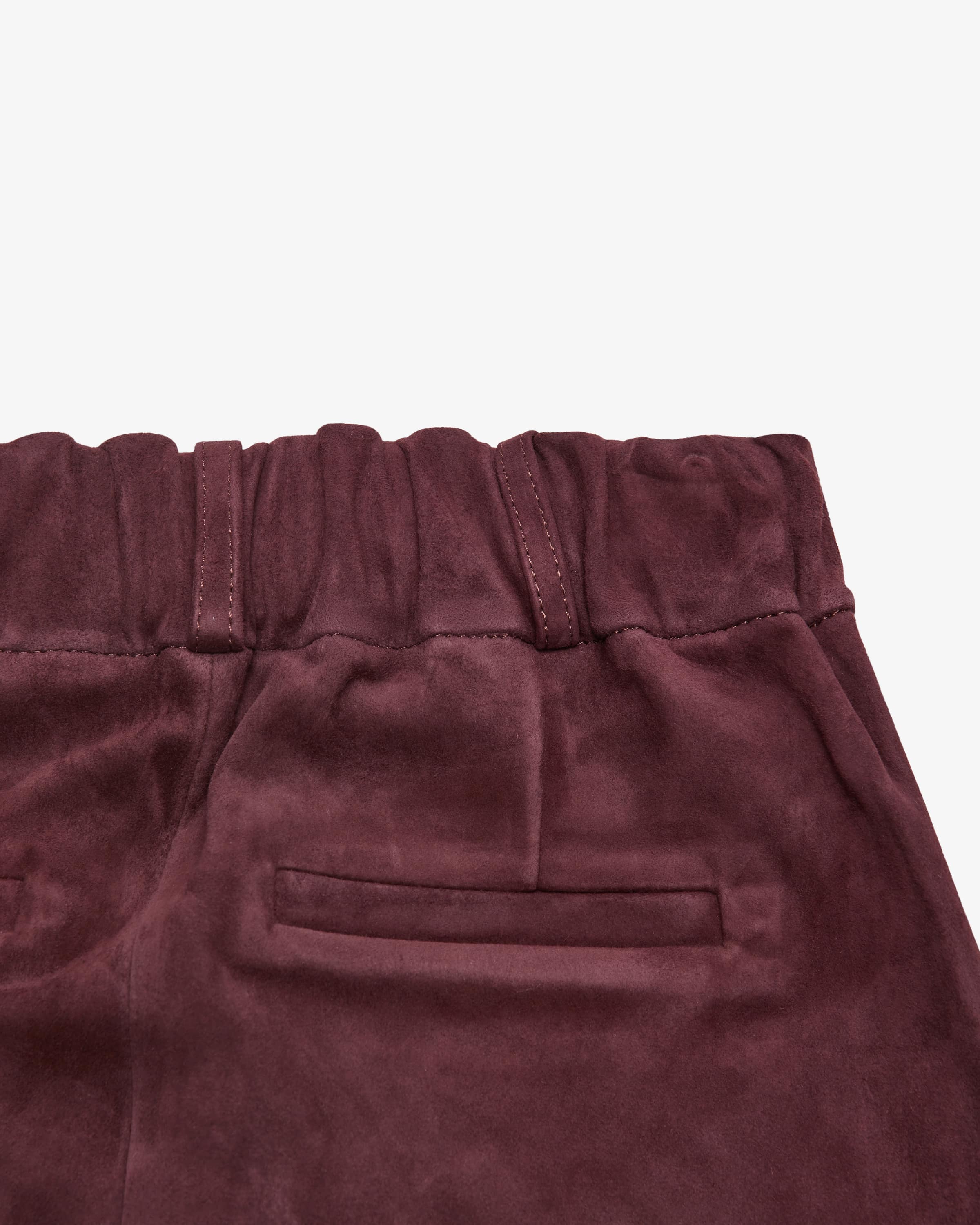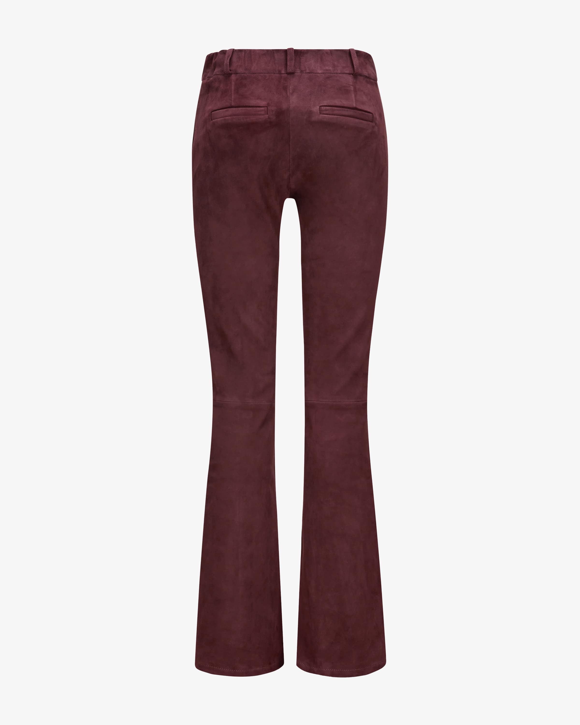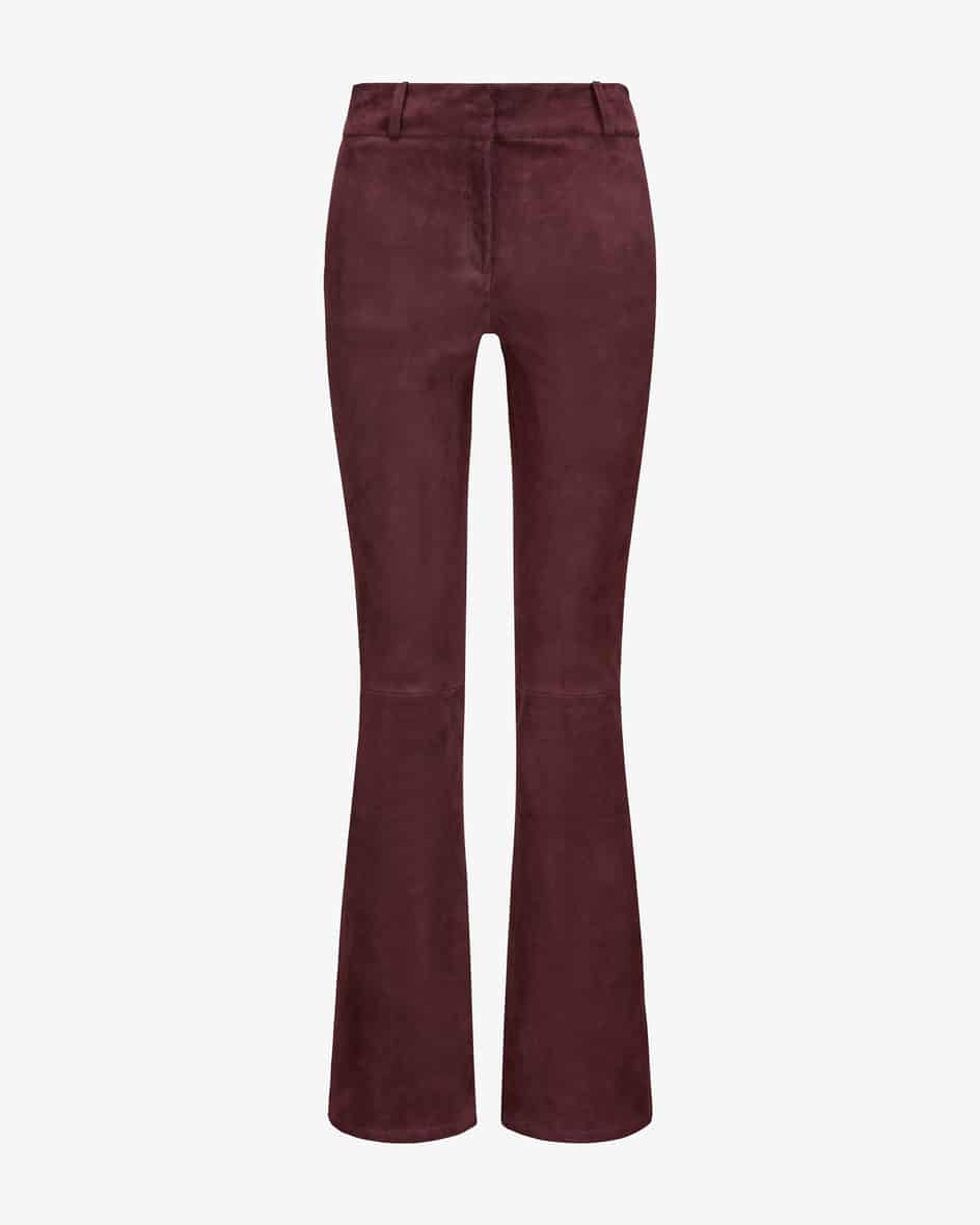 Lucia Lederhose für Damen von ARMA in Bordeaux. Aus edlem Lammvelours besticht dieses ausgestellte Modell sowohl optisch als auch haptisch, während die Teilungsnähte und klassische Details den Look gekonnt vollenden.