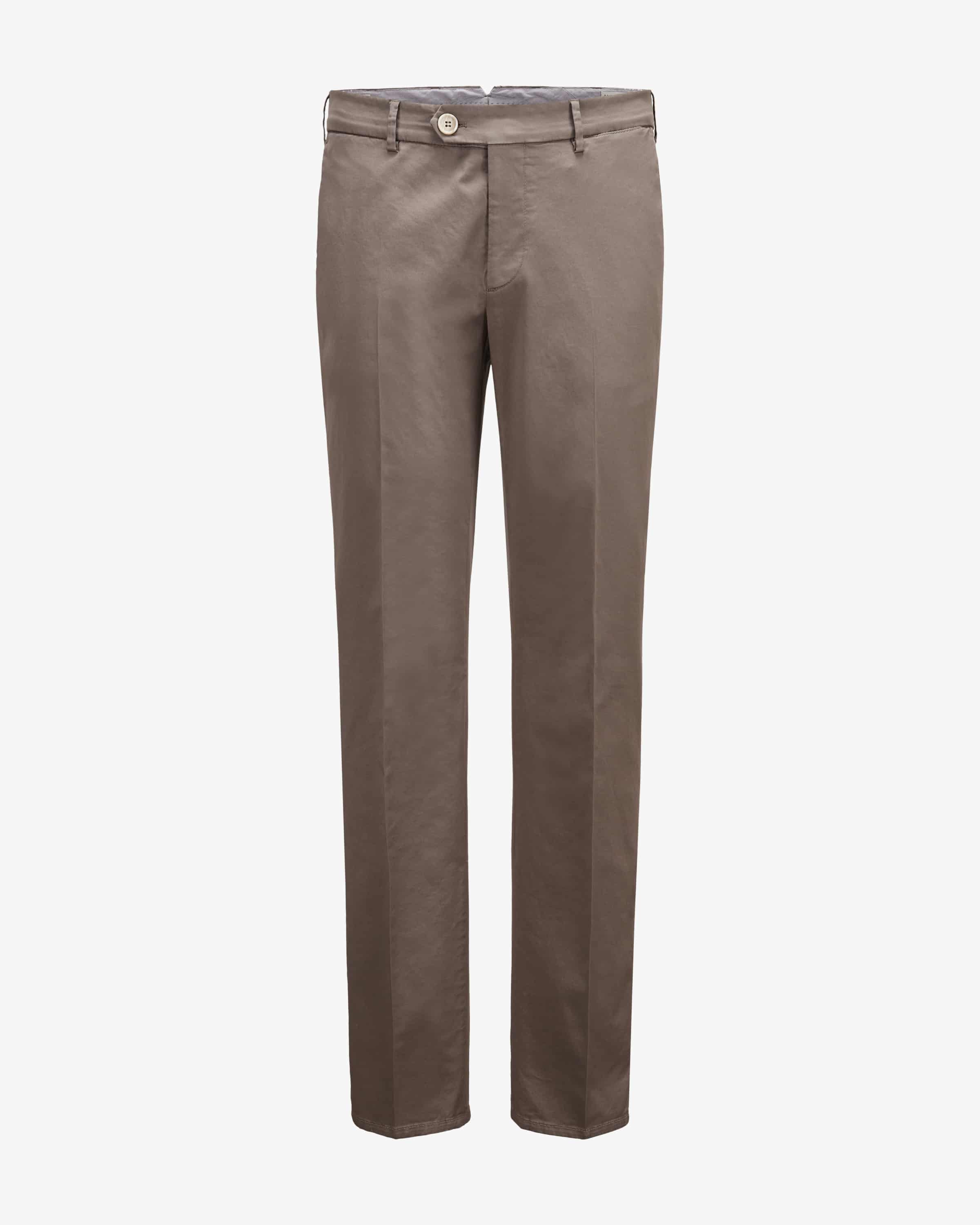 Chino Italian Fit für Herren von Brunello Cucinelli in Graubraun. Das Modell präsentiert sich in charakteristischer Chino-Aufmachung, welche dank klassischer Details und elastischer Baumwoll-Qualität einen vielseitig kombinierbaren Freizeit- wie auch Office-Favoriten mit hohem Tragekomfort schafft.