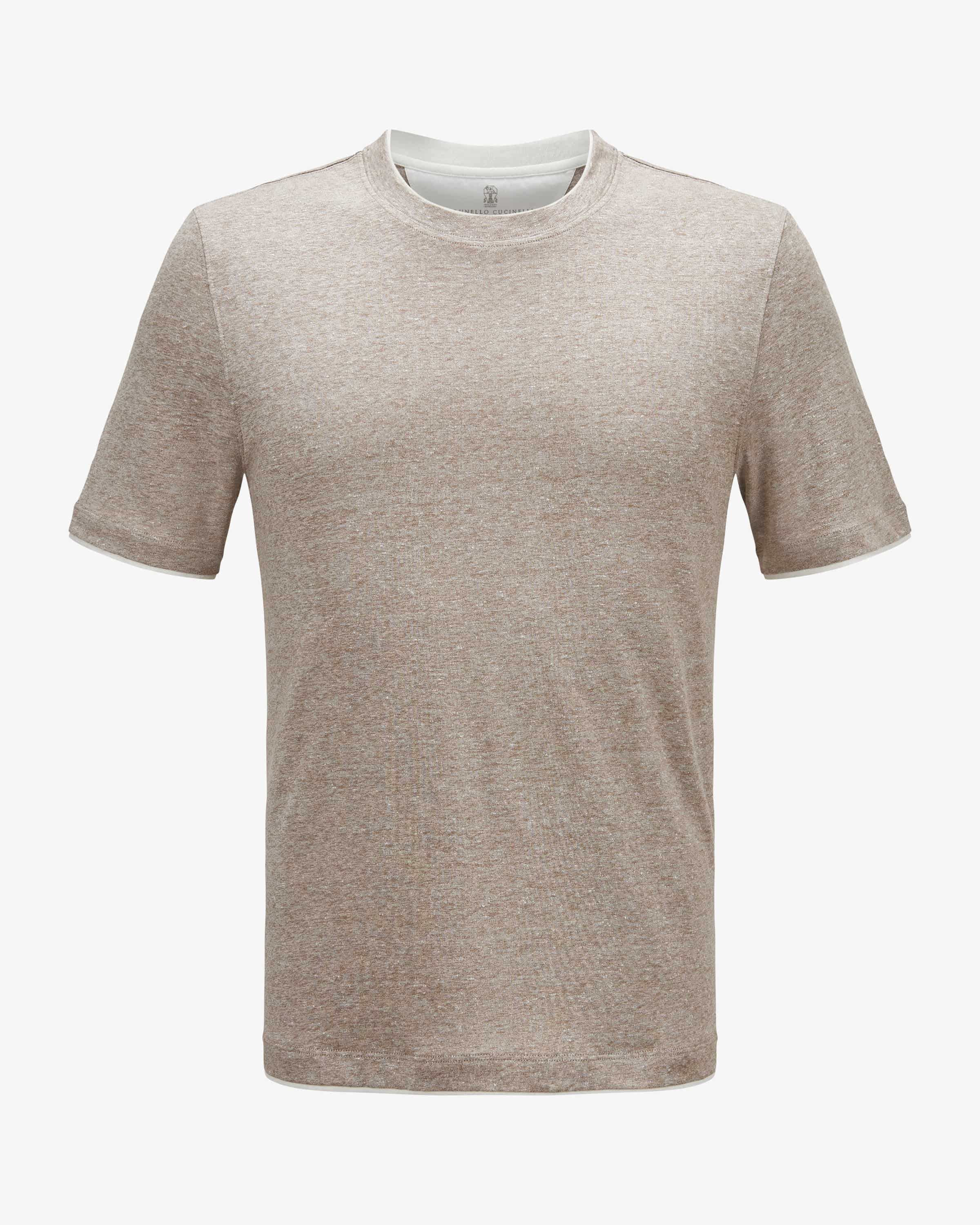 T-Shirt für Herren von Brunello Cucinelli in Sand und Creme. Italienisches Luxuslabel mit Sitz in Solomeo, bekannt für feinste Cashmere-Verarbeitung. Auch dieses Modell in Leinen-Baumwoll-Mix überzeugt mit angenehmer Haptik, während die Layering-Aufmachung sportive Akzente setzt, runden klassische Details den Gesamtlook harmonisch ab. Ein Basic-Essential das sich vielseitig kombinieren lässt.