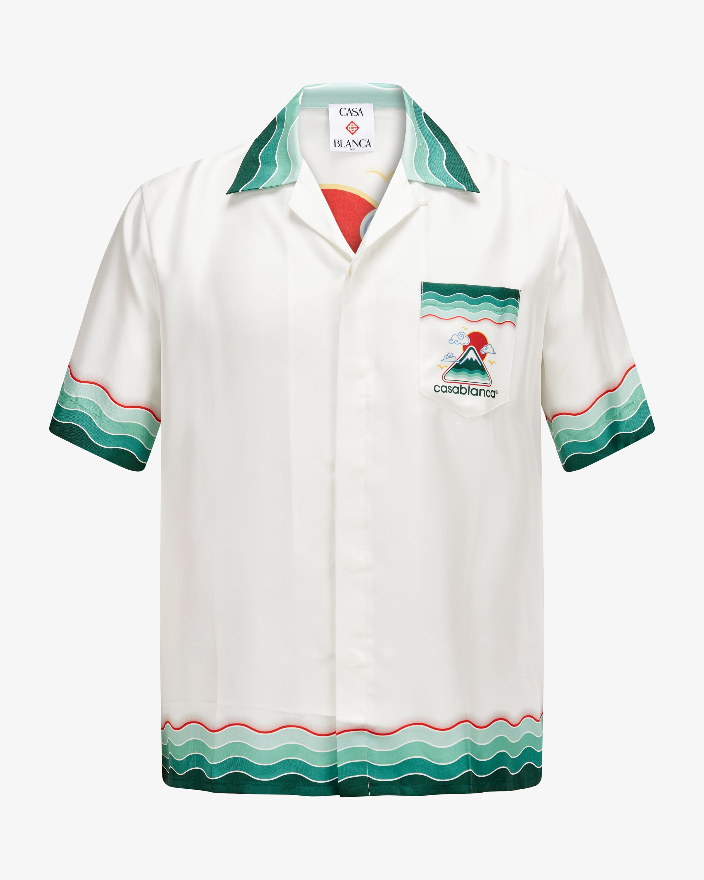 Montagne Ondulee Seidenhemd für Herren von Casablanca in Weiß, Grün und Rot. Die Pariser Marke kombiniert Retro-Sportswear mit Luxusmode – inspiriert von Tenniskultur und Reiselust. Mit edlem Seiden-Twill gefertigt, begeistert auch dieses Modell durch luxuriösen Glanz und geschmeidigen Griff. Die entspannte Passform unterstreicht den legeren Charakter, während der ausdrucksstarke Logo- Print mit dynamischem Wellenmuster stilvolle Akzente setzt.