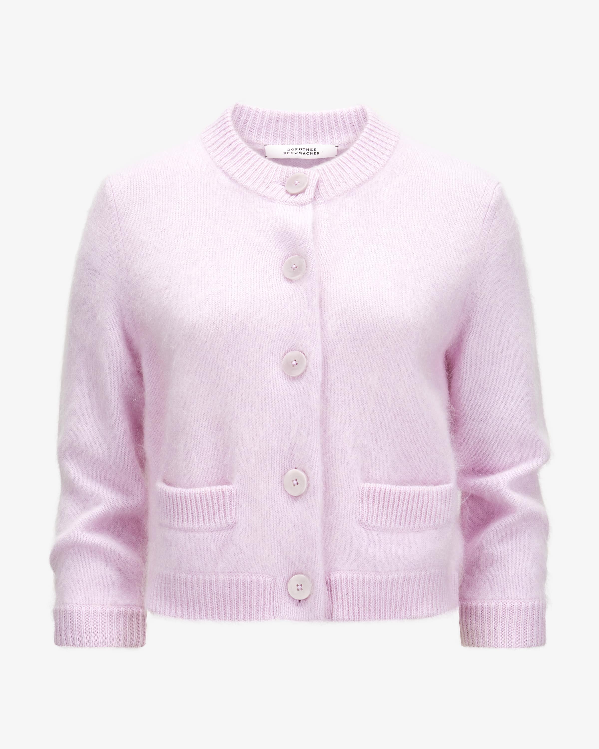 Fluffy Statements Strickjacke für Damen von Dorothee Schumacher in Rosa. Feminine Power aus Deutschland – Dorothees Looks verbinden Stärke mit verspielter Eleganz. Dieses Modell erhält dank hochwertigem Schurwoll-Cashmere- Mix in Brushed-Aufmachung eine besonders weiche Haptik und modische Optik – Ein vielseitig kombinierbarer Strick-Liebling.
