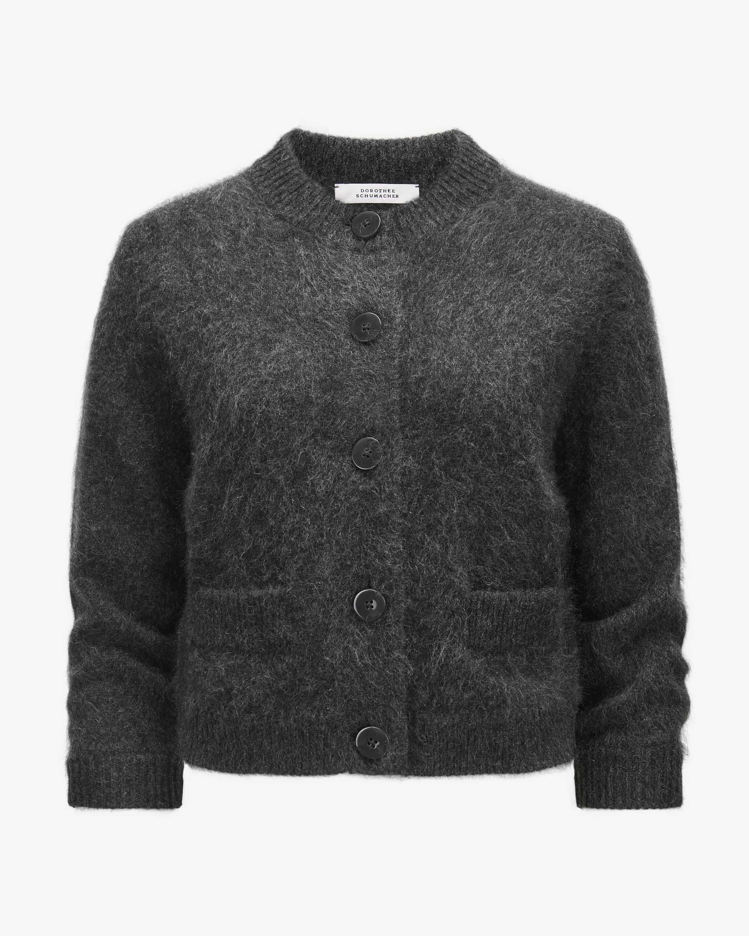Fluffy Statements Strickjacke für Damen von Dorothee Schumacher in Anthrazit. Feminine Power aus Deutschland – Dorothees Looks verbinden Stärke mit verspielter Eleganz. Dieses Modell erhält dank hochwertigem Schurwoll-Cashmere- Mix in Brushed-Aufmachung eine besonders weiche Haptik und modische Optik – Ein vielseitig kombinierbarer Strick-Liebling.