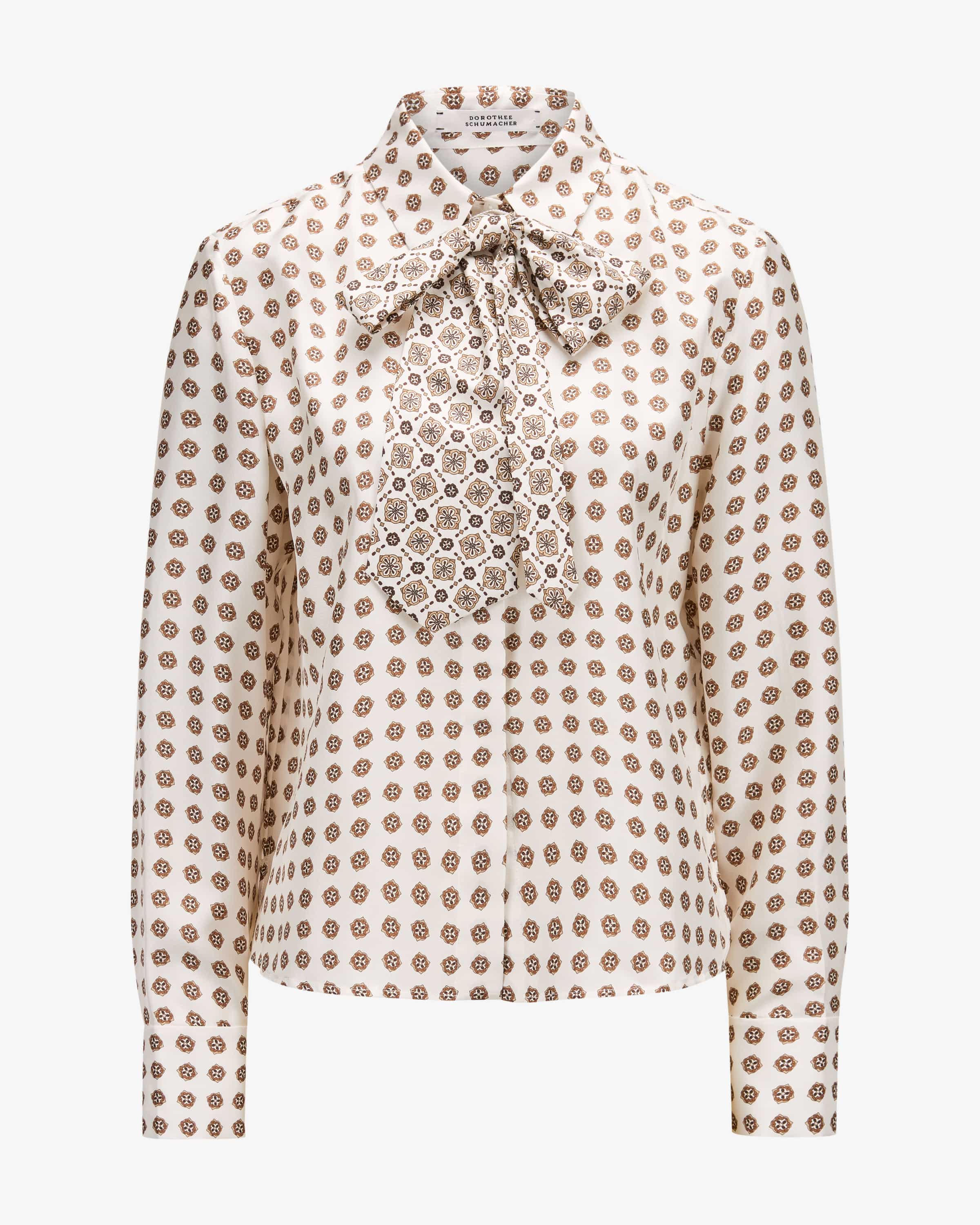 Graphic Dreams Seidenbluse für Damen von Dorothee Schuhmacher in Creme und Braun. Feminine Power aus Deutschland – Dorothees Looks verbinden Stärke mit verspielter Eleganz. Dieses weit geschnittene Modell besticht dank der feinen Seidentwill-Qualität sowohl als haptisches als auch als optisches Highlight, während der charakteristische Allover-Print zusammen mit der abnehmbaren Krawattenschleifen einen modischen Twist verleiht.