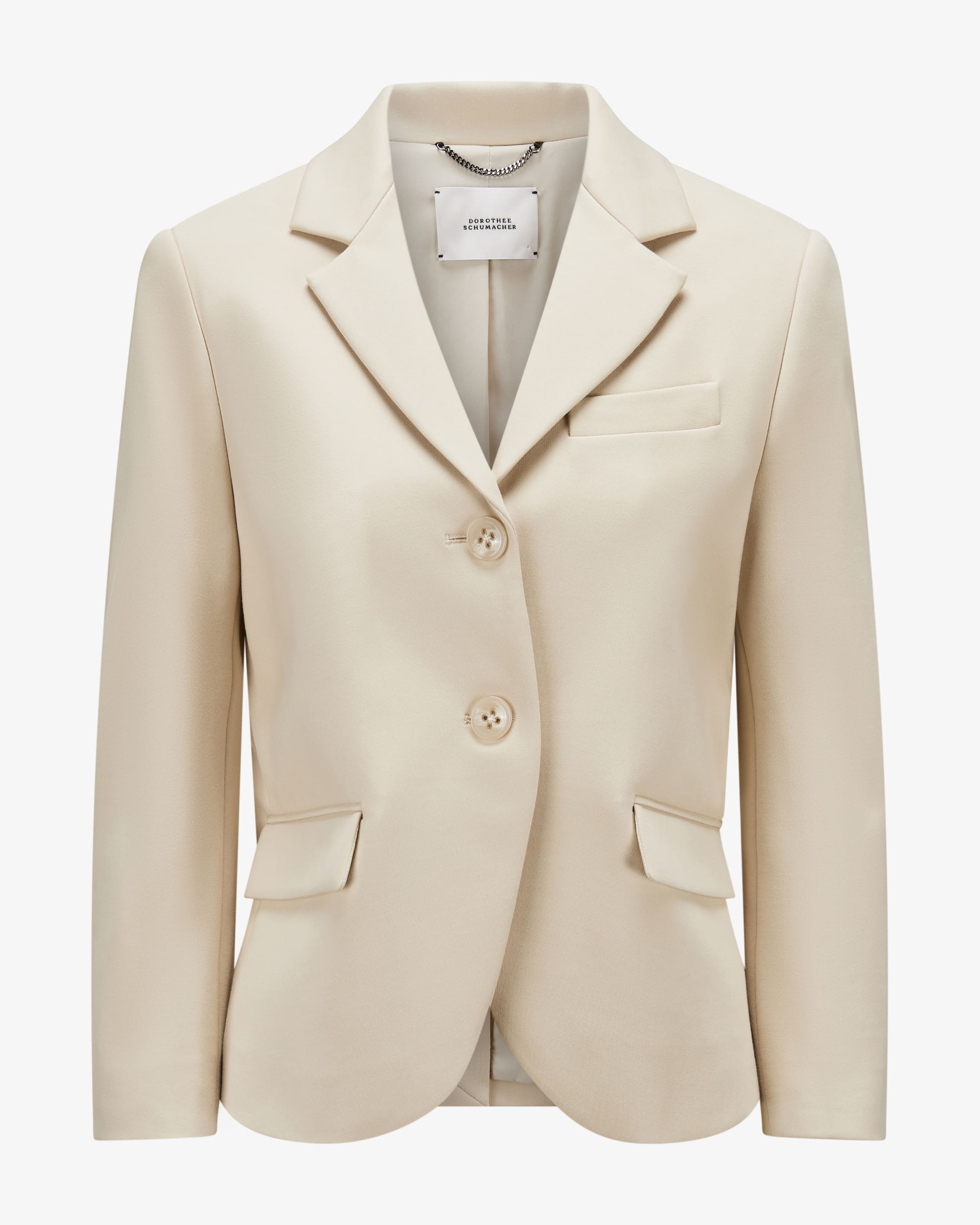Jerseyblazer Emotional Essence für Damen von Dorothee Schumacher in Sand. Feminine Power aus Deutschland – Dorothees Looks verbinden Stärke mit verspielter Eleganz. Auch dieses Modell überzeugt in dezent elastischer Material-Qualität, während klassische Details und die verkürzte Passform einen femininen Begleiter kreieren. In Kombination mit der passenden Hose, schaffen sie einen edlen Allover-Look.