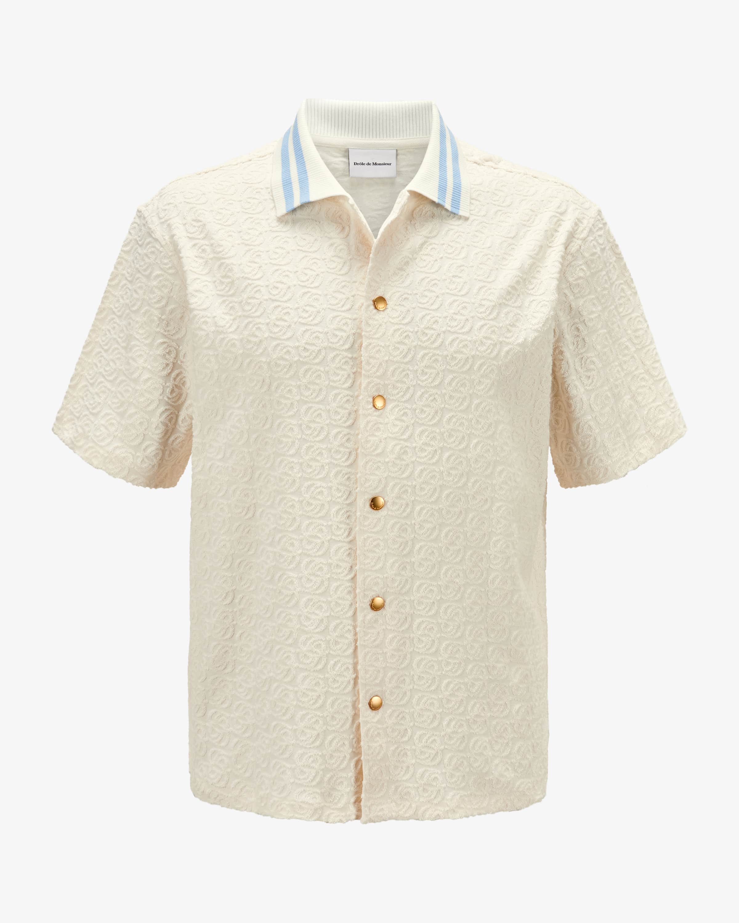 Frottee-Bowlinghemd für Herren von Drole de Monsieur in Off-White und Hellblau. Das Label wurde 2014 in Dijon gegründet und steht für einzigartige, tragbare Designs mit retro-inspirierter Ästhetik. Das Kurzarm-Modell avanciert dank der weichen Frottee-Qualität mit tonigem Monogramm-Muster zum Hingucker für sommerliche Outfits, während der gestreifte Polokragen den sportiv-legeren Style gekonnt unterstreicht. Das Modell kann zudem mit den passenden Shorts als Set getragen werden.