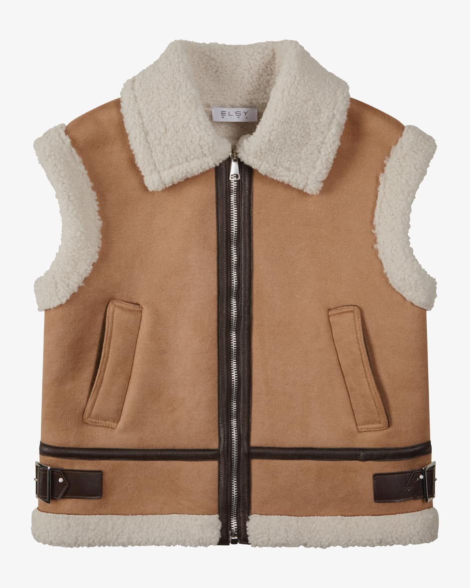 Yoko Weste für Mädchen von Elsy in Camel und Weiß. Italienisches Label für exklusive Kindermode – stilvoll und detailverliebt. Dieses Modell überzeugt mit weichem Teddyfell und Details in Leder-Optik, während klassische Details einen modernen Begleiter fürs Layering kreieren.