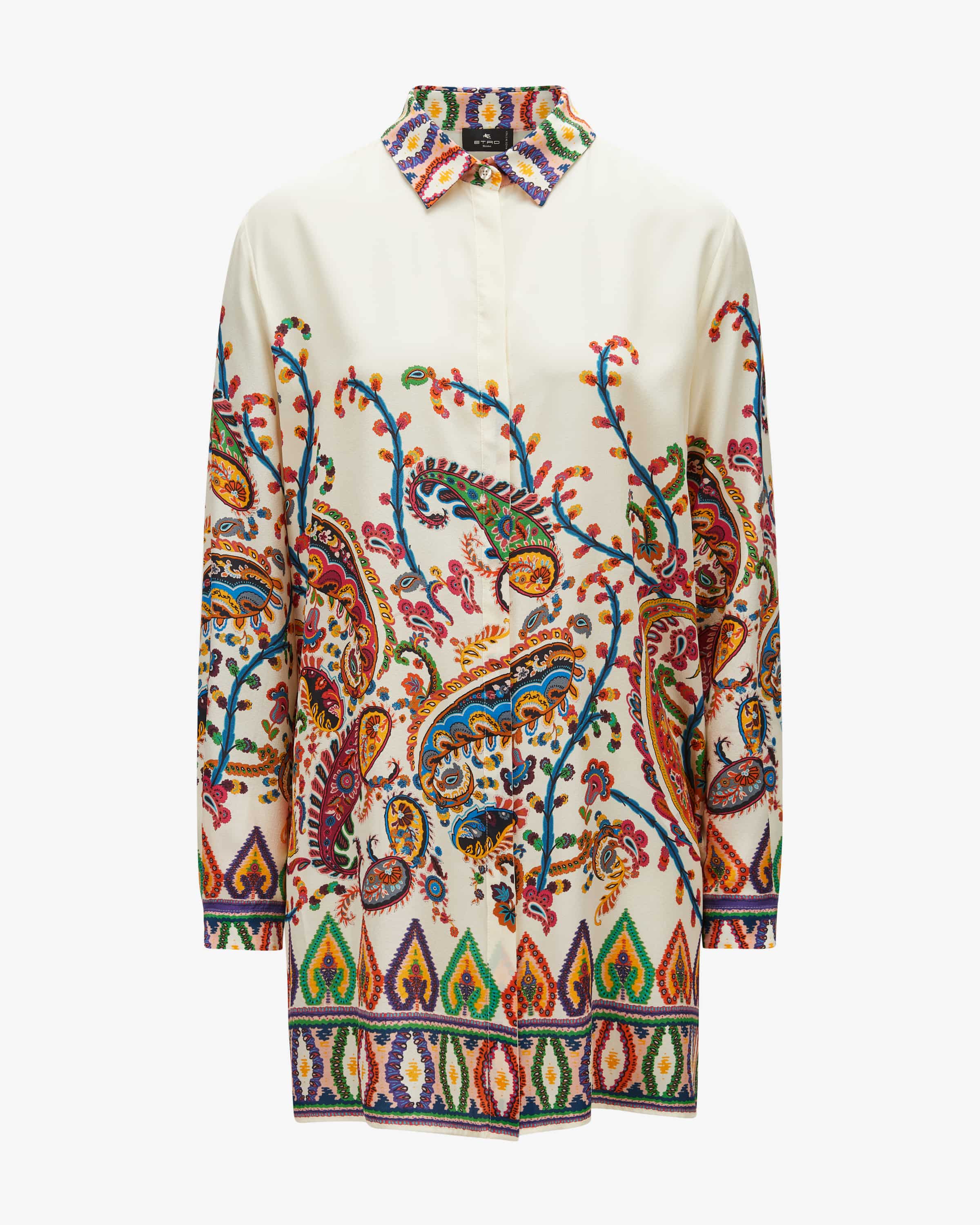 Seiden-Hemdbluse für Damen von Etro in Creme und Bunt. Die italienische Traditionsmarke ist bekannt für ihre opulenten Paisley-Muster und ethnischen Prints. Auch dieses Modell überzeugt mit farbenfrohem Paisley-Dessin, während die luxuriöse Seiden-Qualität in semitransparenter Optik angenehme Tragemomente garantiert. Zugleich können Sie die Bluse dank des extralangen Oversize-Schnitts auch als Überzieh-Kleid tragen.