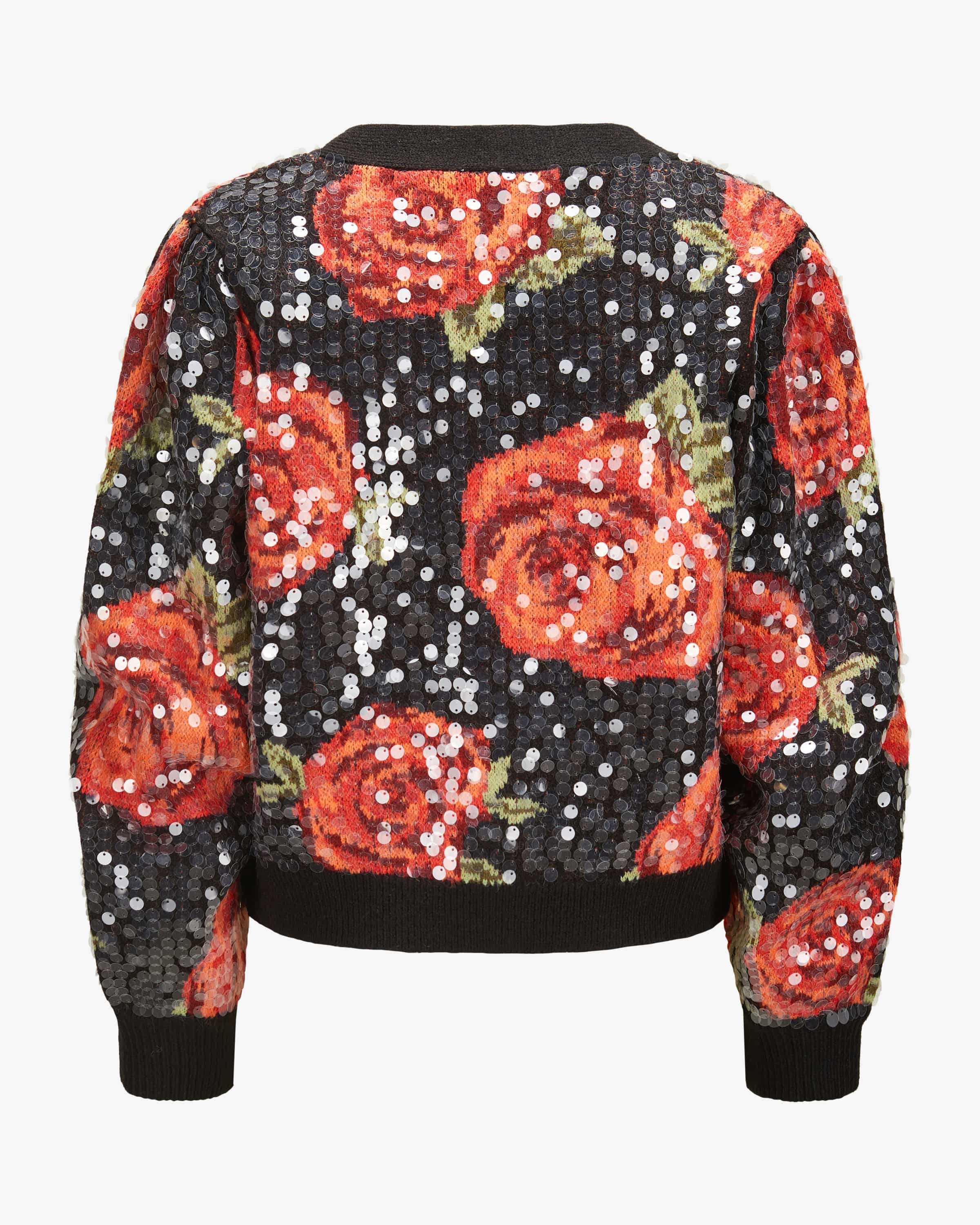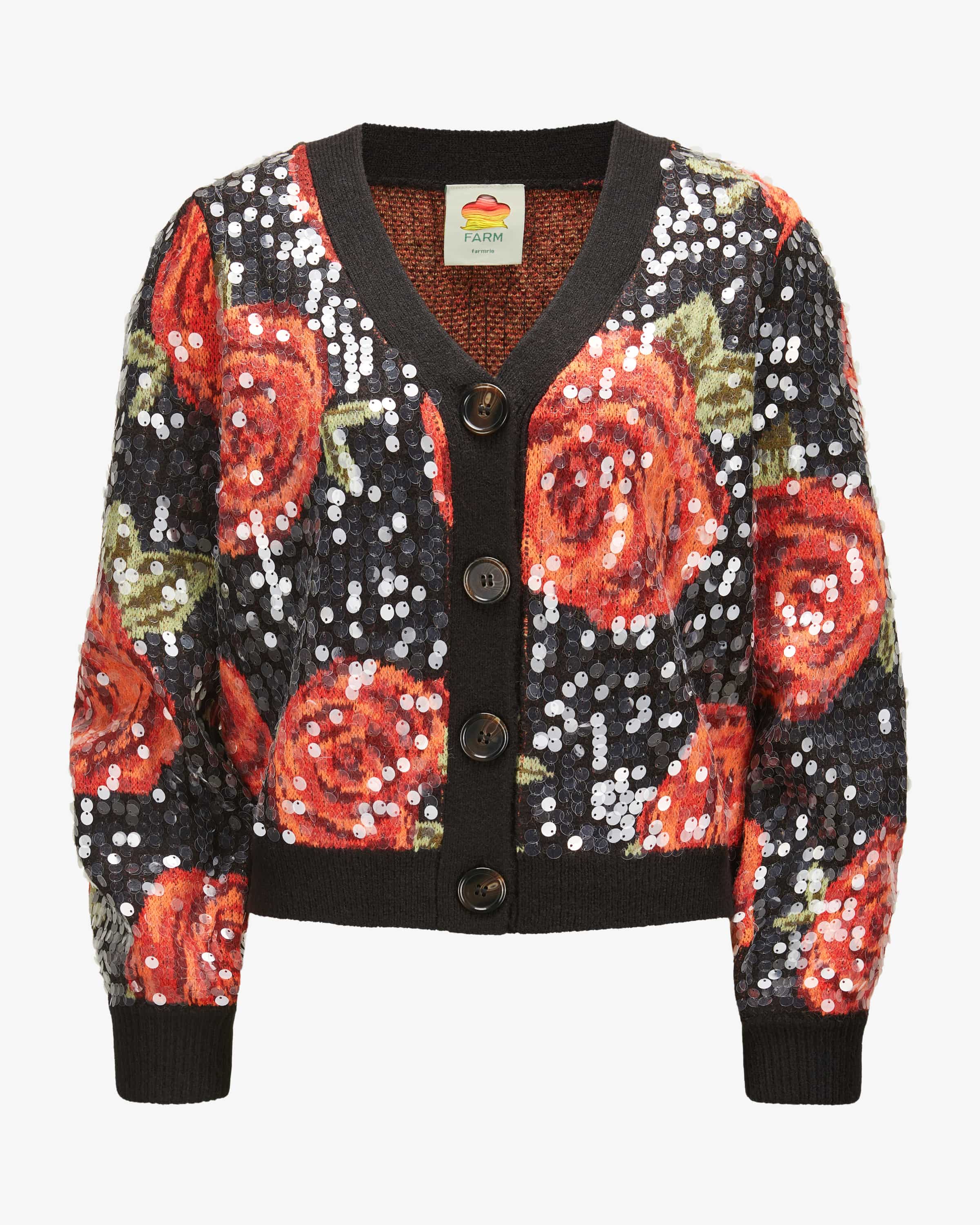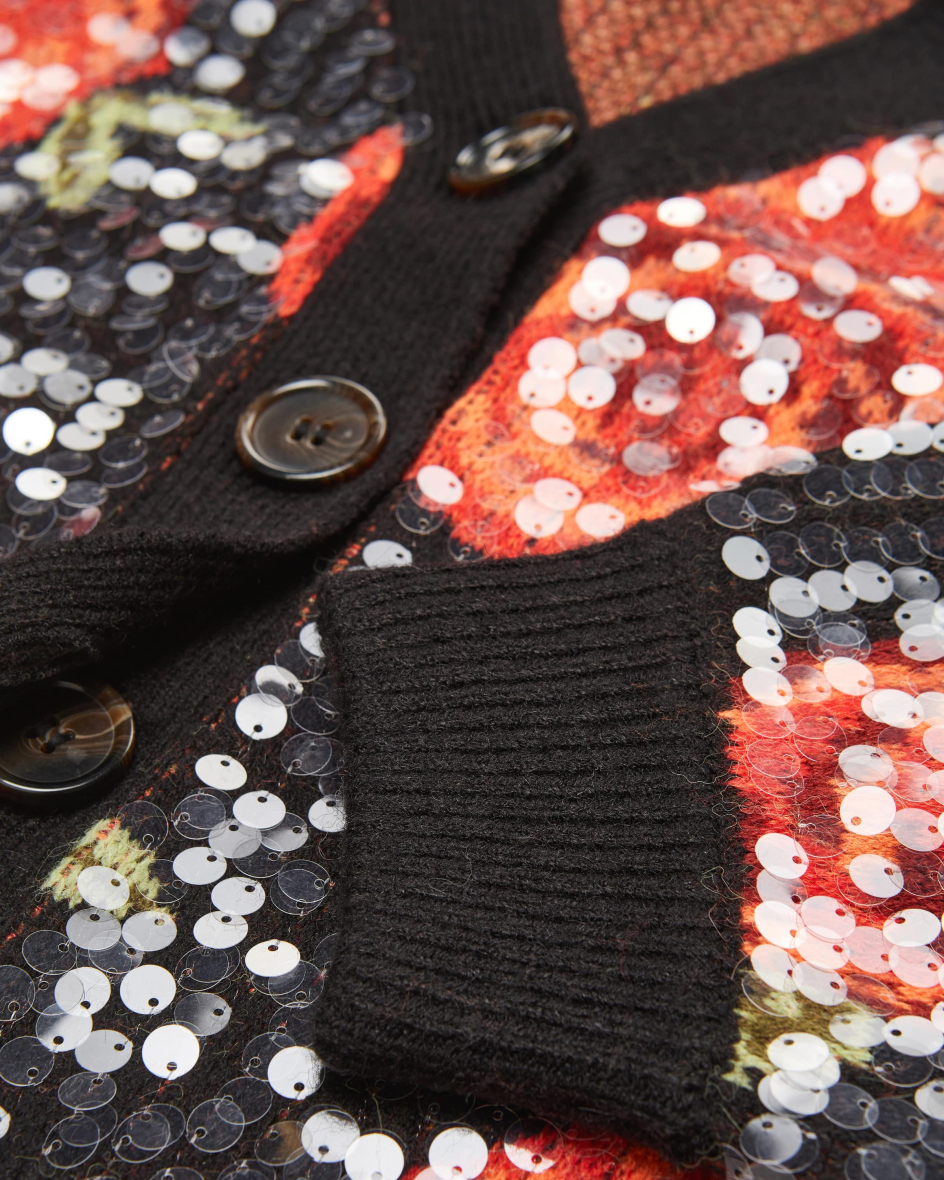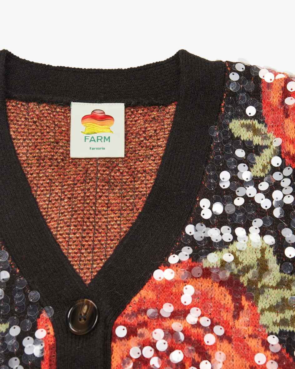 Strickjacke für Damen von Farm Rio in Schwarz und Orange. Das Modell präsentiert sich in floralem Allover-Dessin, welches dank der semitransparenten Pailletten einen modischen Touch erhält. Zugleich schafft die weite Passform ein legeres Gesamtbild.