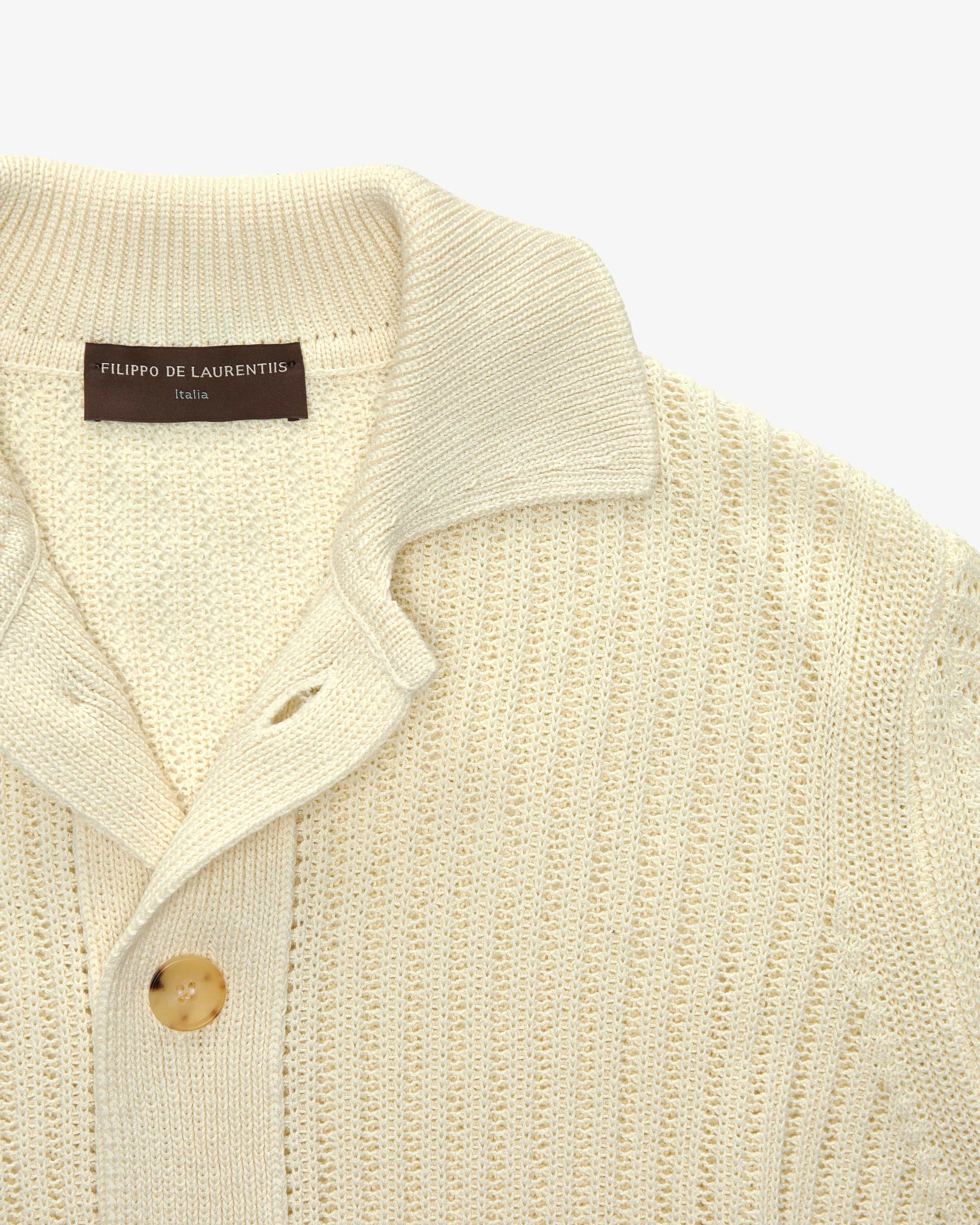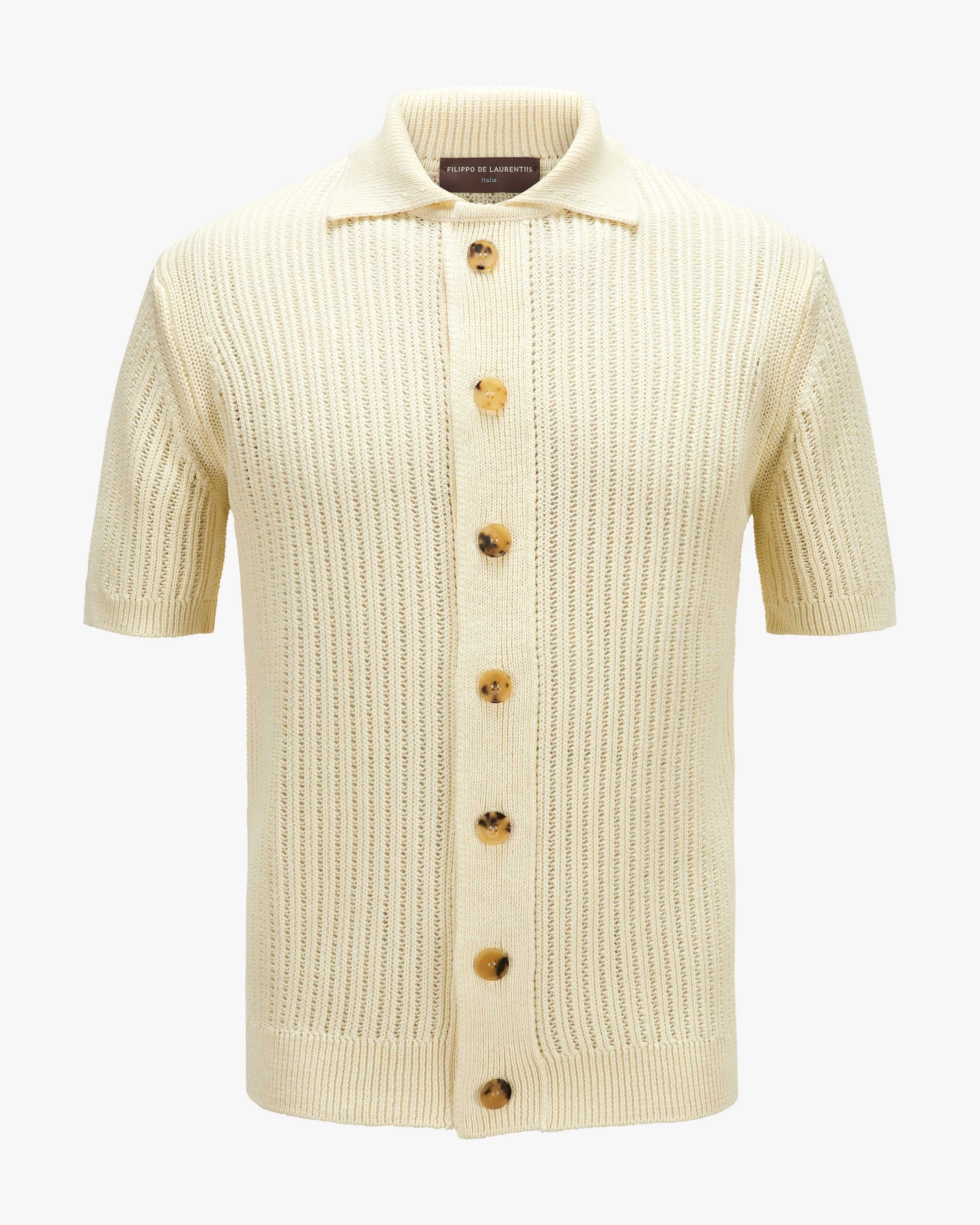 Strickhemd für Herren von Filippo de Laurentiis in Off-White. Das Modell präsentiert sich dank des Lochstrickmusters in modischer Aufmachung, während die klassische Schnittführung einen zeitlosen Begleiter mit vielseitigen Kombinationsmöglichkeiten schafft.