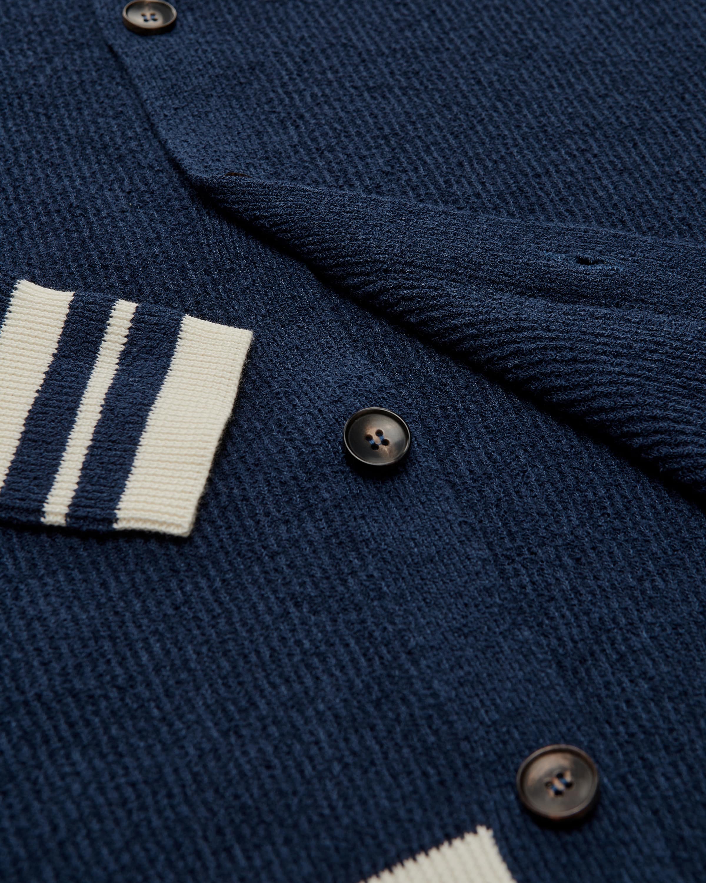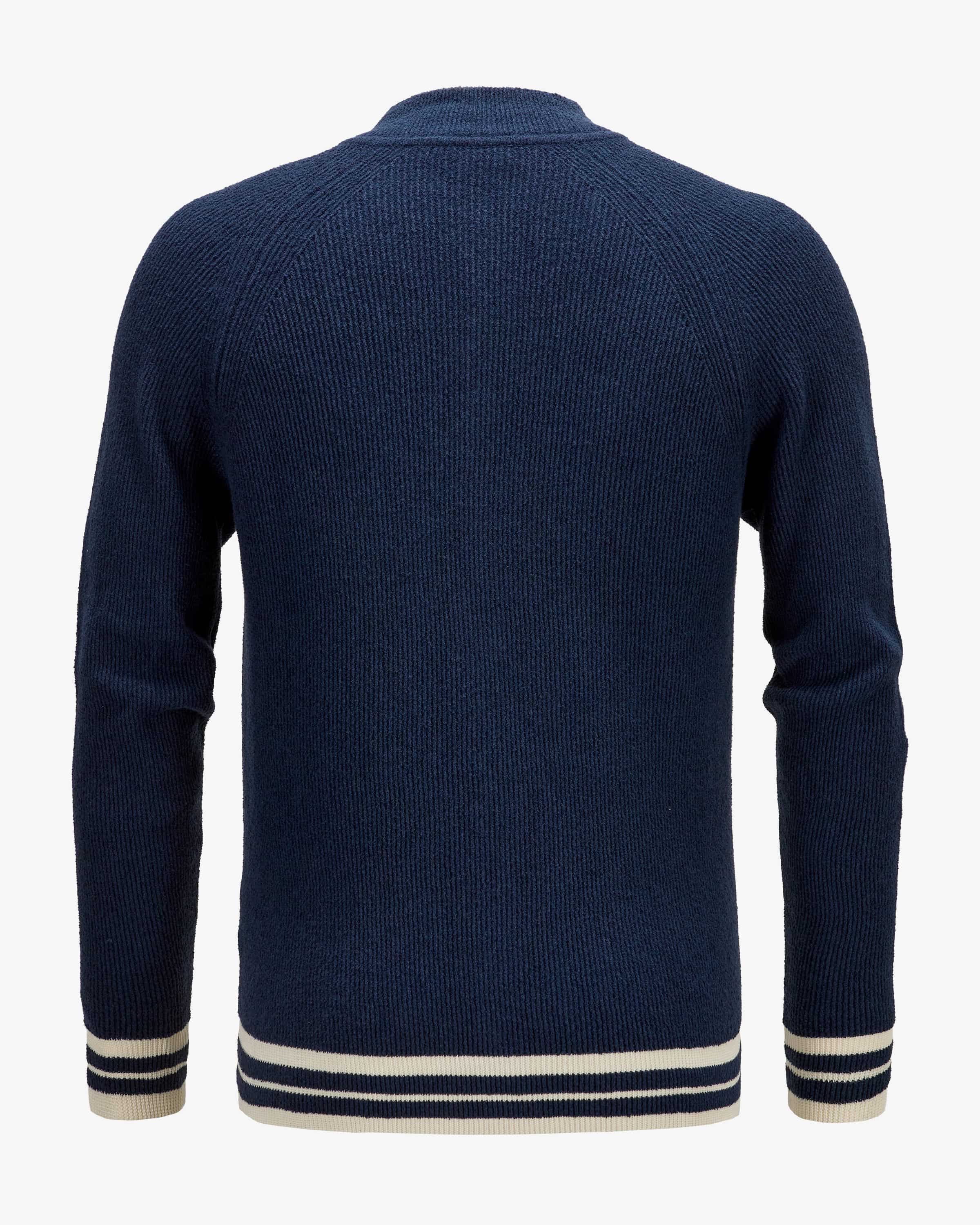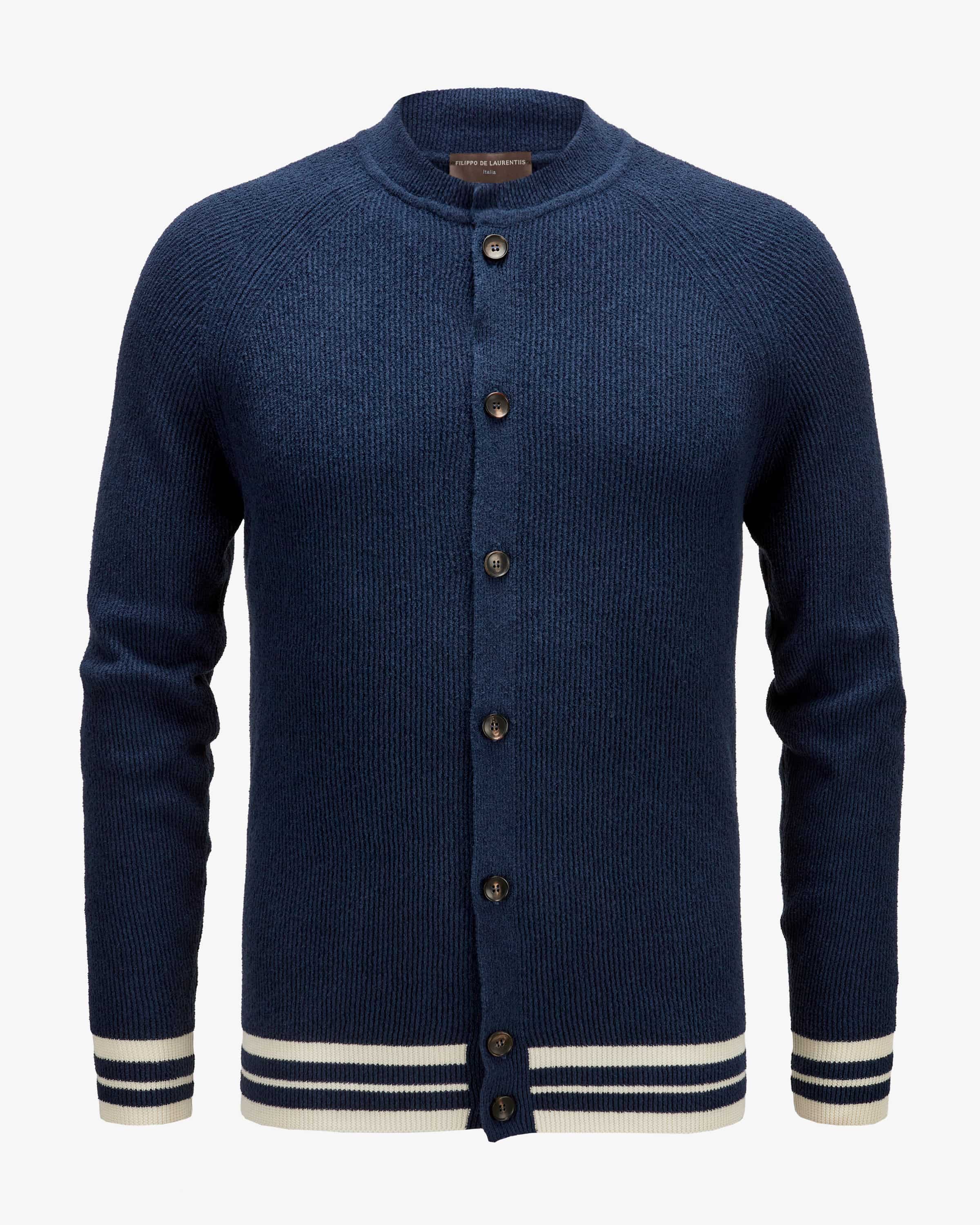 Strickjacke für Herren von Filippo de Laurentiis in Dunkelblau und Weiß. Die italienische Marke für moderne Strickmode spezialisiert sich auf leichte, fein verarbeitete Pullover & Polos. Dank dem Baumwoll-Mix im Rippstrick-Design erhält das Modell eine feine Frottee- Haptik, während die Collegejacken-Silhouette mit zulaufenden Bündchen und Streifen-Details einen modischen Look im Preppy-Style kreiert.