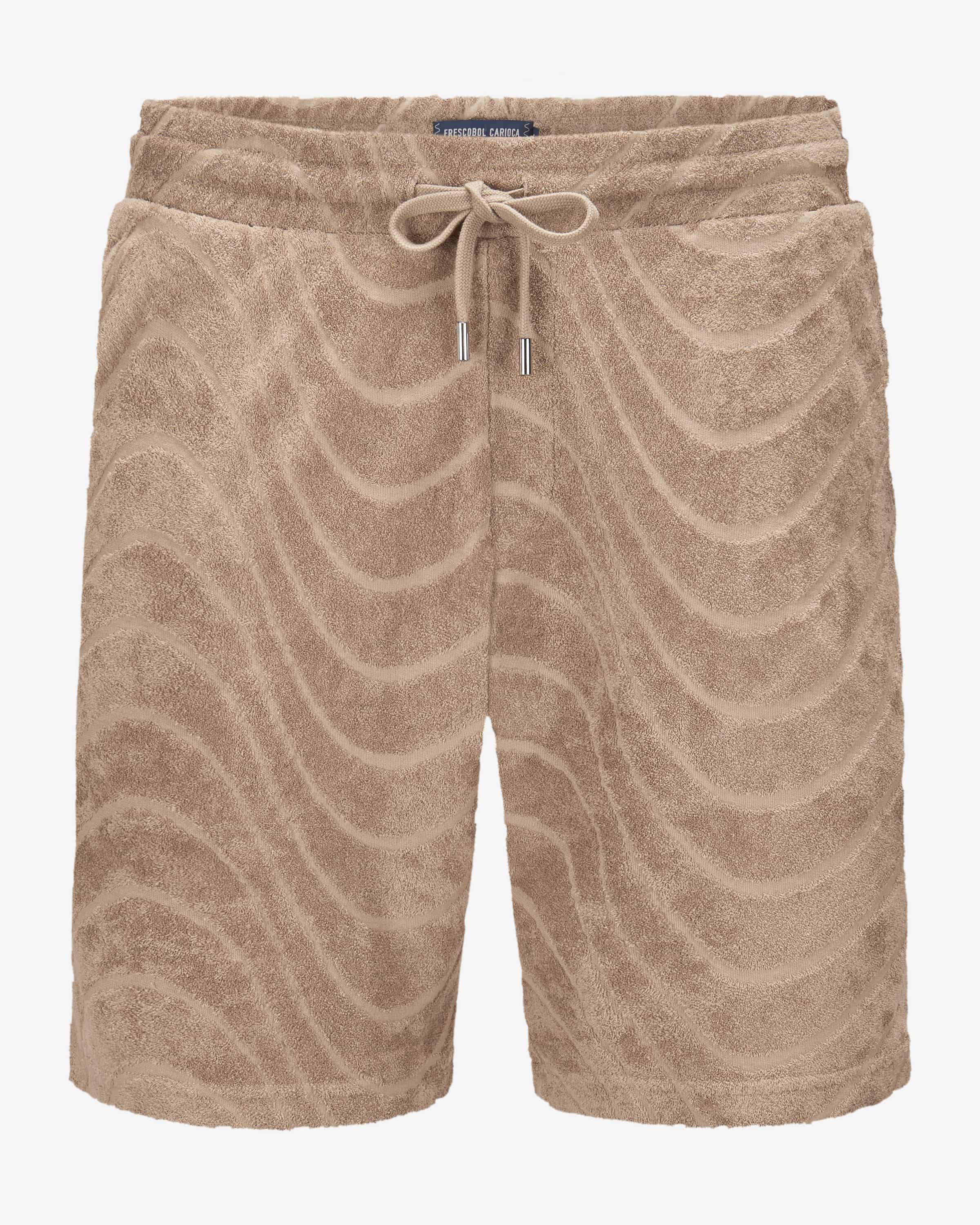 Augusto Sweatshorts für Herren von Frescobol Carioca in Khaki. Bei der Lifestyle-Brand aus Rio de Janeiro treffen grafische Prints auf Design-Ästhetik. Das legere Modell aus leichtem Baumwoll-Lyocell-Mix präsentiert sich dank dem Jacquard-Frottee in besonderer Aufmachung, während das Wellen-Muster eine Hommage an die berühmten Wellenformen der Copacabana-Promenade darstellt. Für einen sommerlichen Gesamt-Look können Sie das passende Hemd kombinieren.