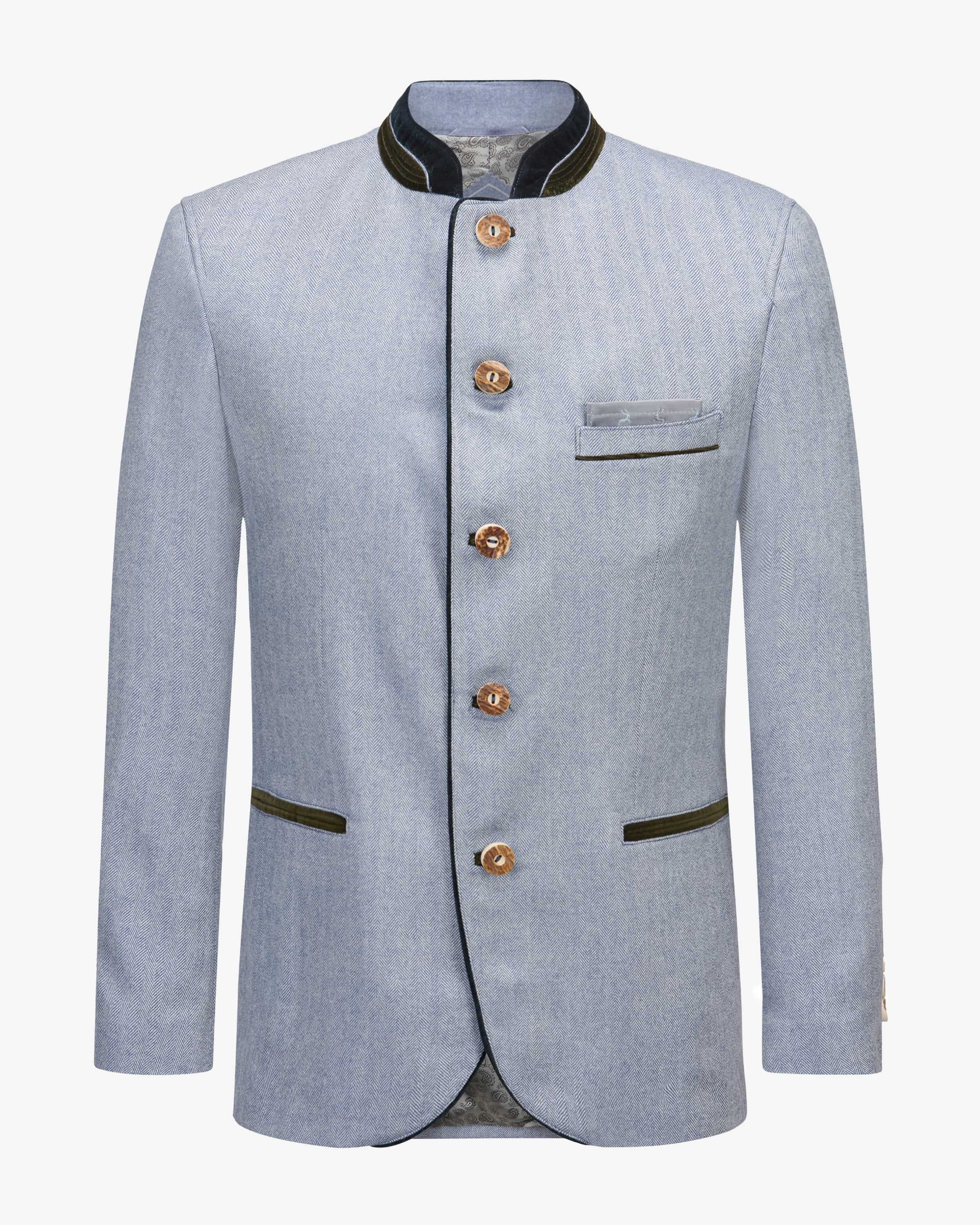Meilersdorf Trachten-Janker für Herren von Frey Erfunden in Blau, Weiß und Oliv. Das Modell aus hochwertigem Material-Mix überzeugt mit Fischgrät-Dessin und feinen Samt-Details als perfekter Partner für besondere Trachten-Looks. Rustikale Knöpfe vollenden das Gesamtbild harmonisch.