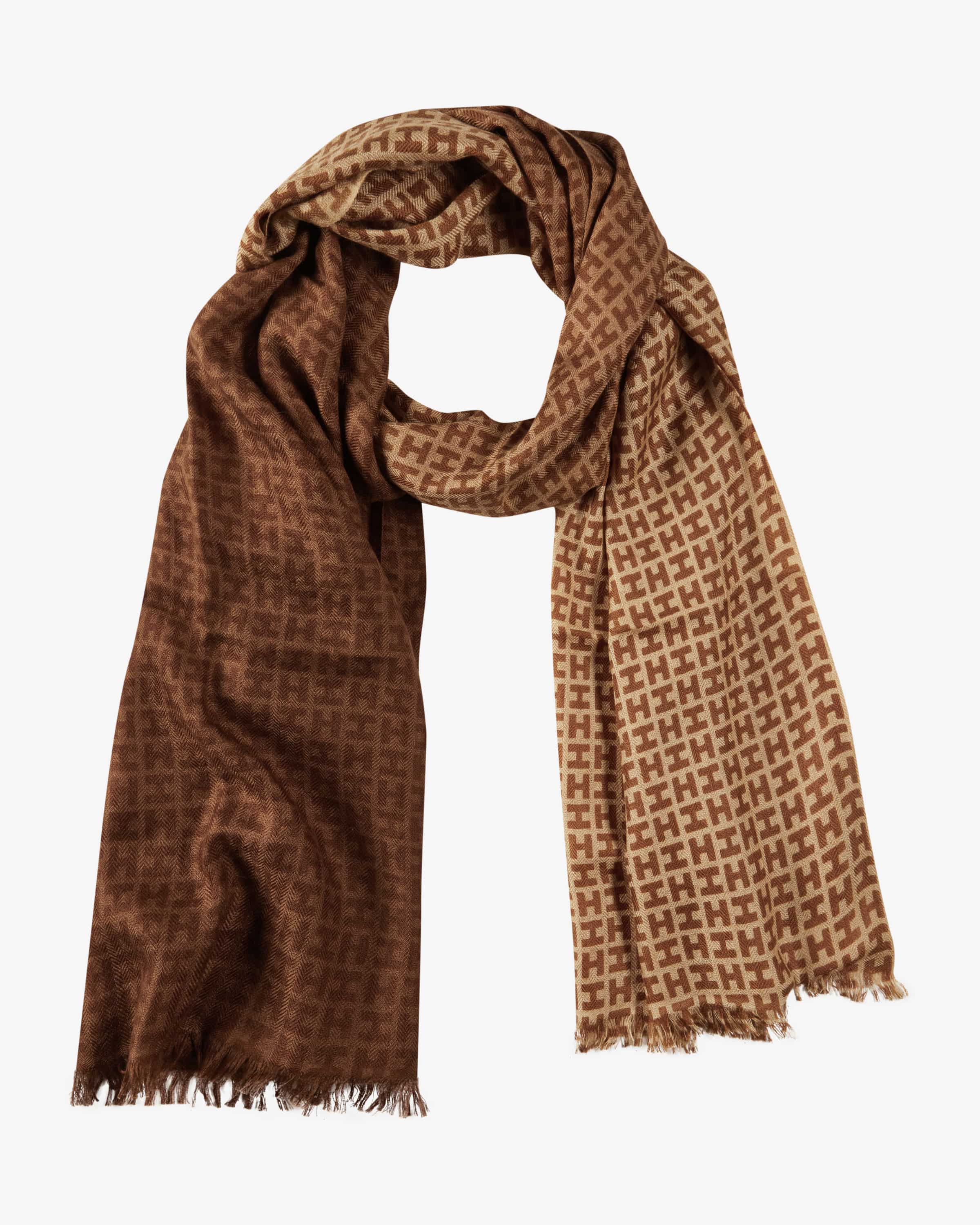 Cashmere-Schal Radeombre von Hemisphere in Grau und Hellbraun. Dank des Farbverlaufs und des charakteristischen Logo-Dessins entsteht ein stilvolles Gesamtbild, während der hochwertige Cashmere-Seiden-Mix in feinem Webdesign besonders angenehm auf der Haut liegt.