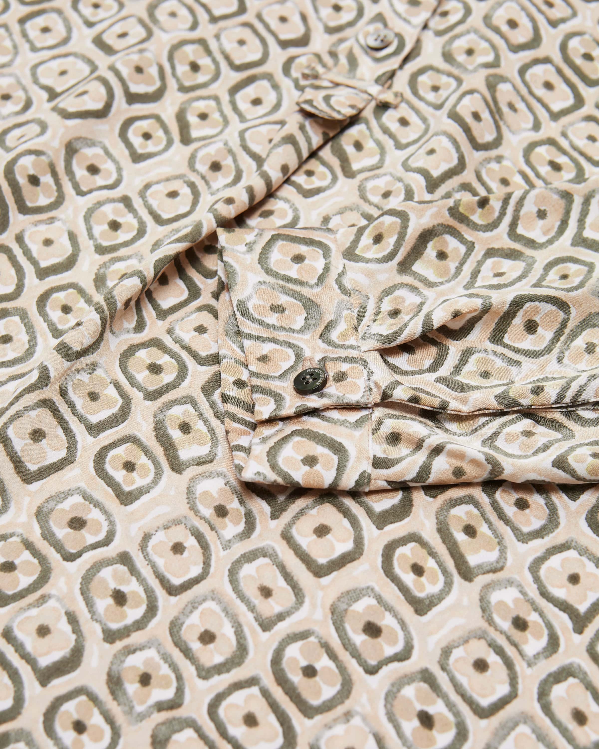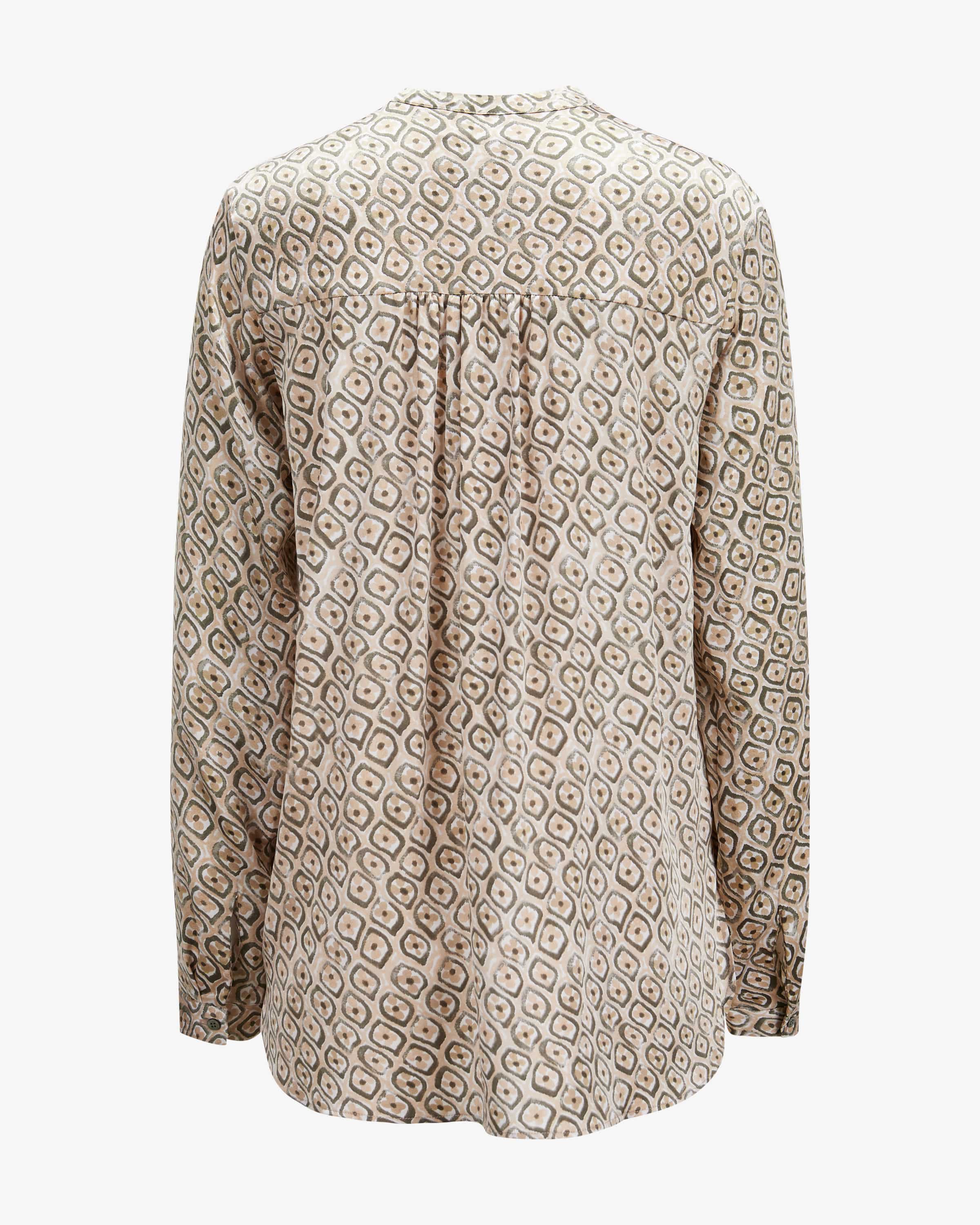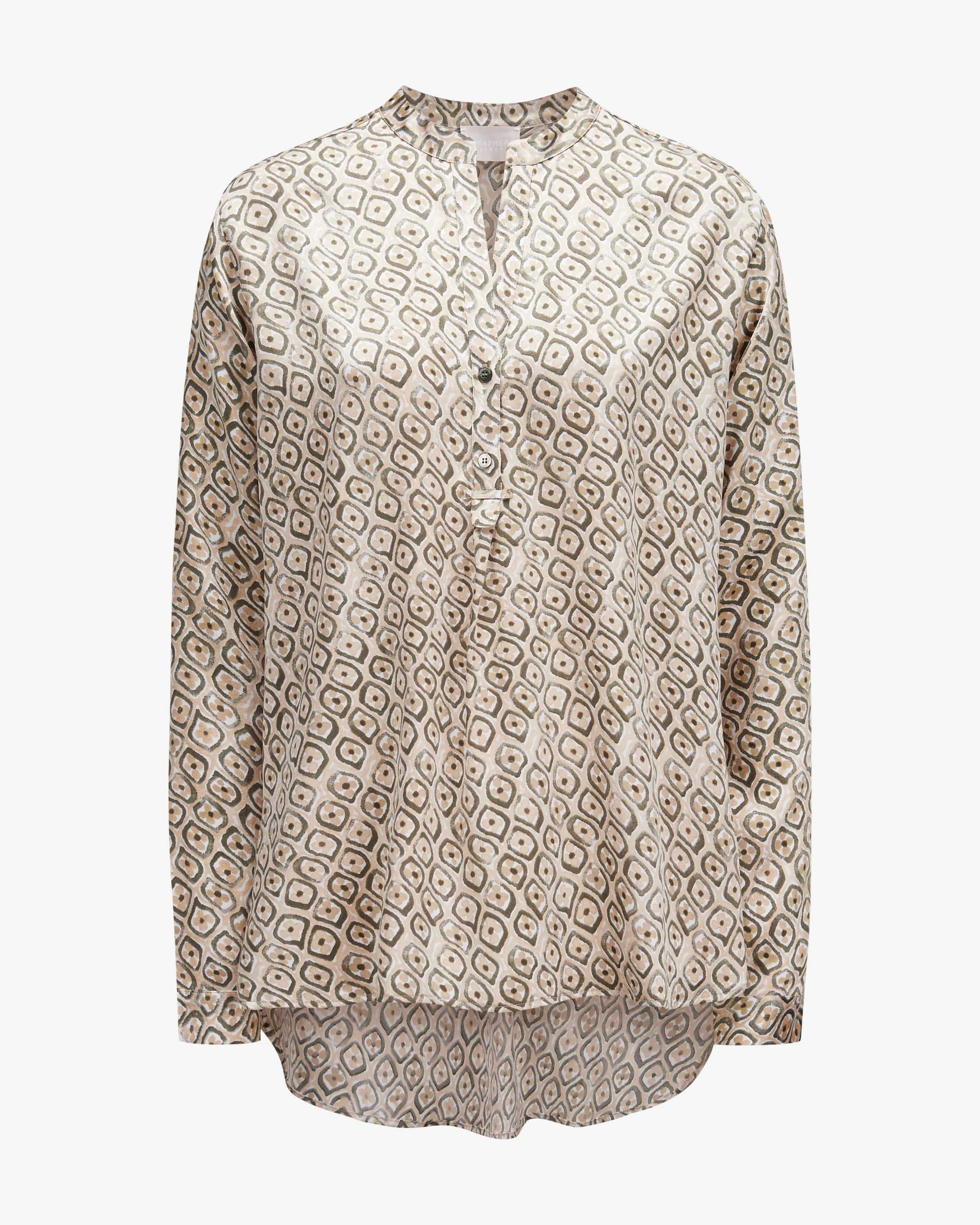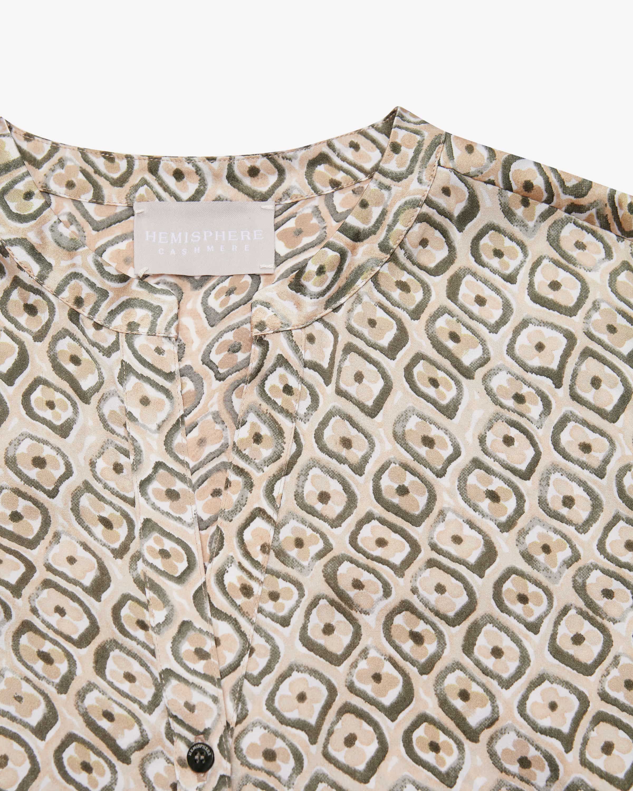 Ferita Seiden-Tunika für Damen von Hemisphere in Oliv, Weiß und Sand. Die deutsche Marke steht für luxuriöse Strick- und Kaschmirteile mit Fokus auf Qualität, Weichheit und zeitlose Farben. Auch dieses Modell avanciert dank der fließenden Seiden-Qualität zu einem besonderen Begleiter in moderner Schnittform, während das florale Design den Gesamtlook harmonisch abrundet.