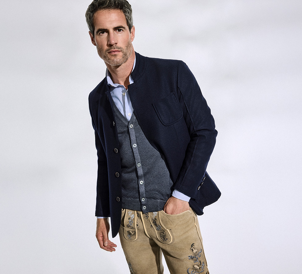 Moderne Eleganz und bayerische Authentizität gehen eine stilvolle Liaison ein: Die Hirschlederhose von Meindl wird mit einem klassischen Businesshemd und einer leichten Strickjacke kombiniert, dazu ein stilvoller Janker. Feine Loafer und hochwertige Kniestrümpfe runden den Look ab. Ob auf der Wiesn, beim Waldfest oder einem besonderen Anlass – der moderne Trachtenlook zeigt, dass Trend und Tradition bestens harmonieren.
