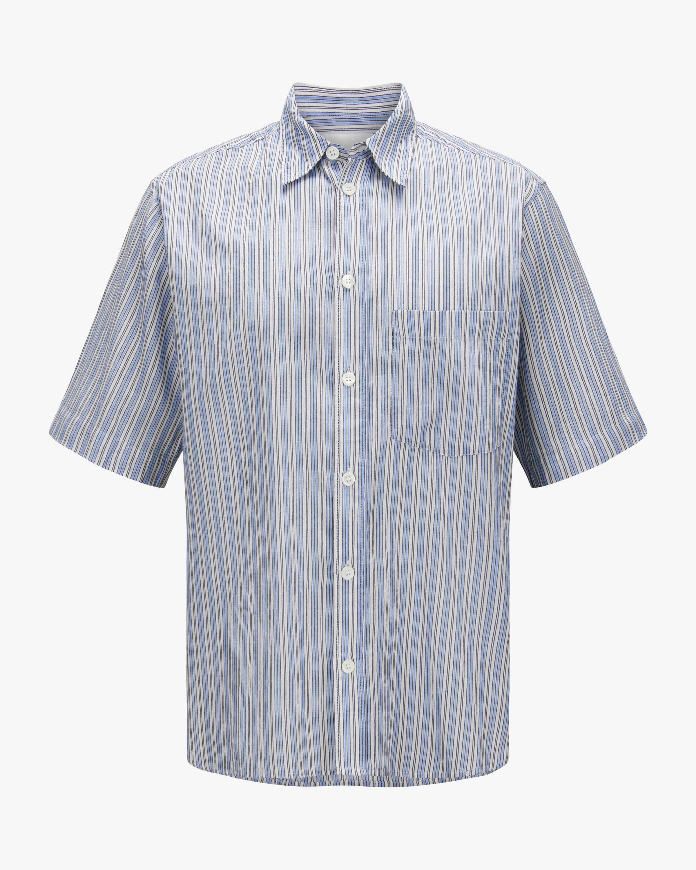 Casualhemd für Herren von Isabel Marant in Hellblau, Weiß und Navy. Das Label steht für lässige Pariser Eleganz mit bohemischem Einfluss. Das Modell in leichter Baumwoll-Qualität überzeugt mit legerer Schnittführung im Oversize- Look, während das strukturiertes Streifen-Muster einen modischen Sommer- Favoriten kreiert.