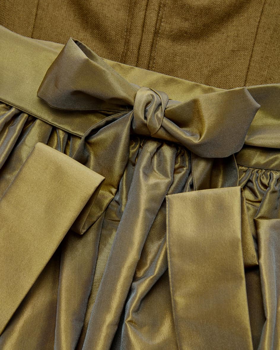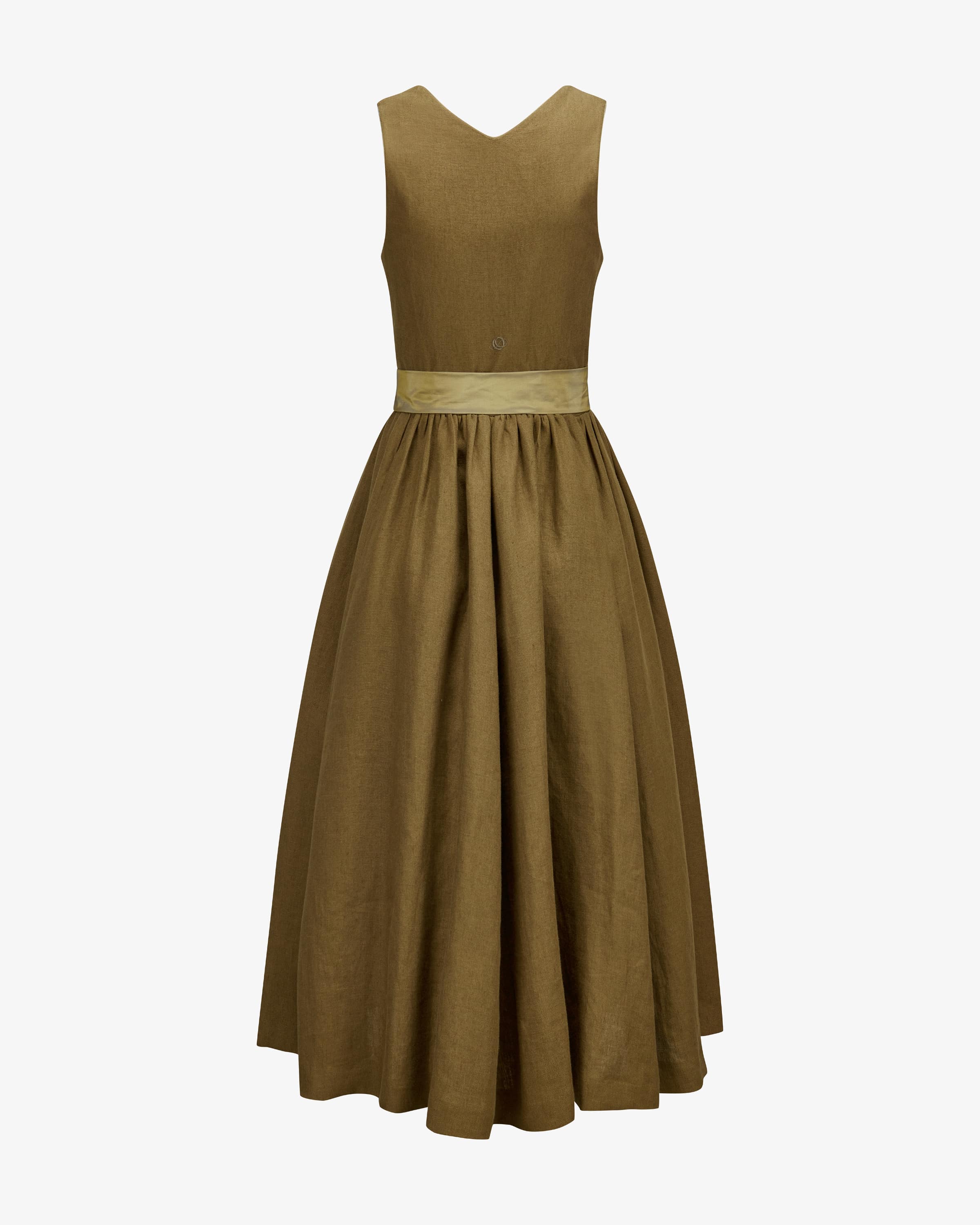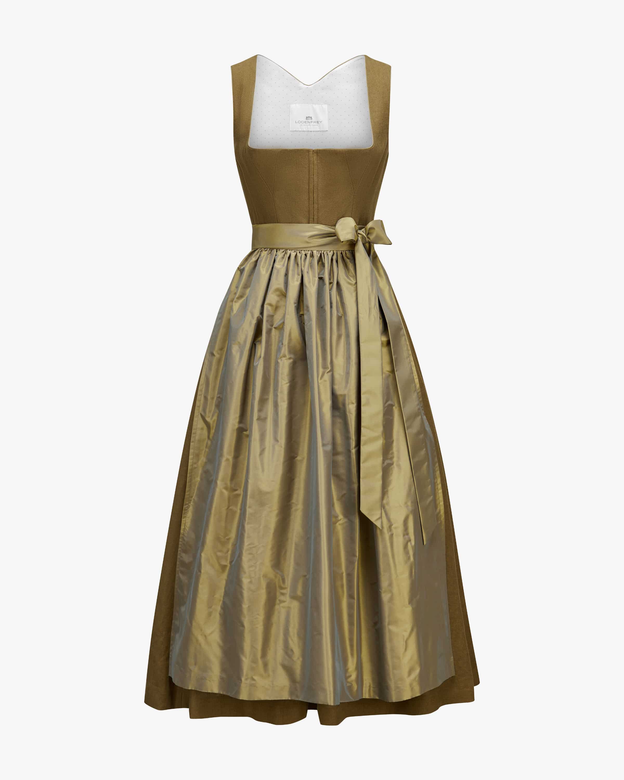 Leinen-Dirndl lang mit Schürze für Damen von LODENFREY München 1842 in Khaki und Gold. Dank der Verwendung von hochwertiger Leinen-Qualität und tonigen Paspelierungen wird ein traditioneller Favorit mit minimalistischem Charme kreiert. Die edel changierende Schürze rundet das Gesamtbild harmonisch ab.