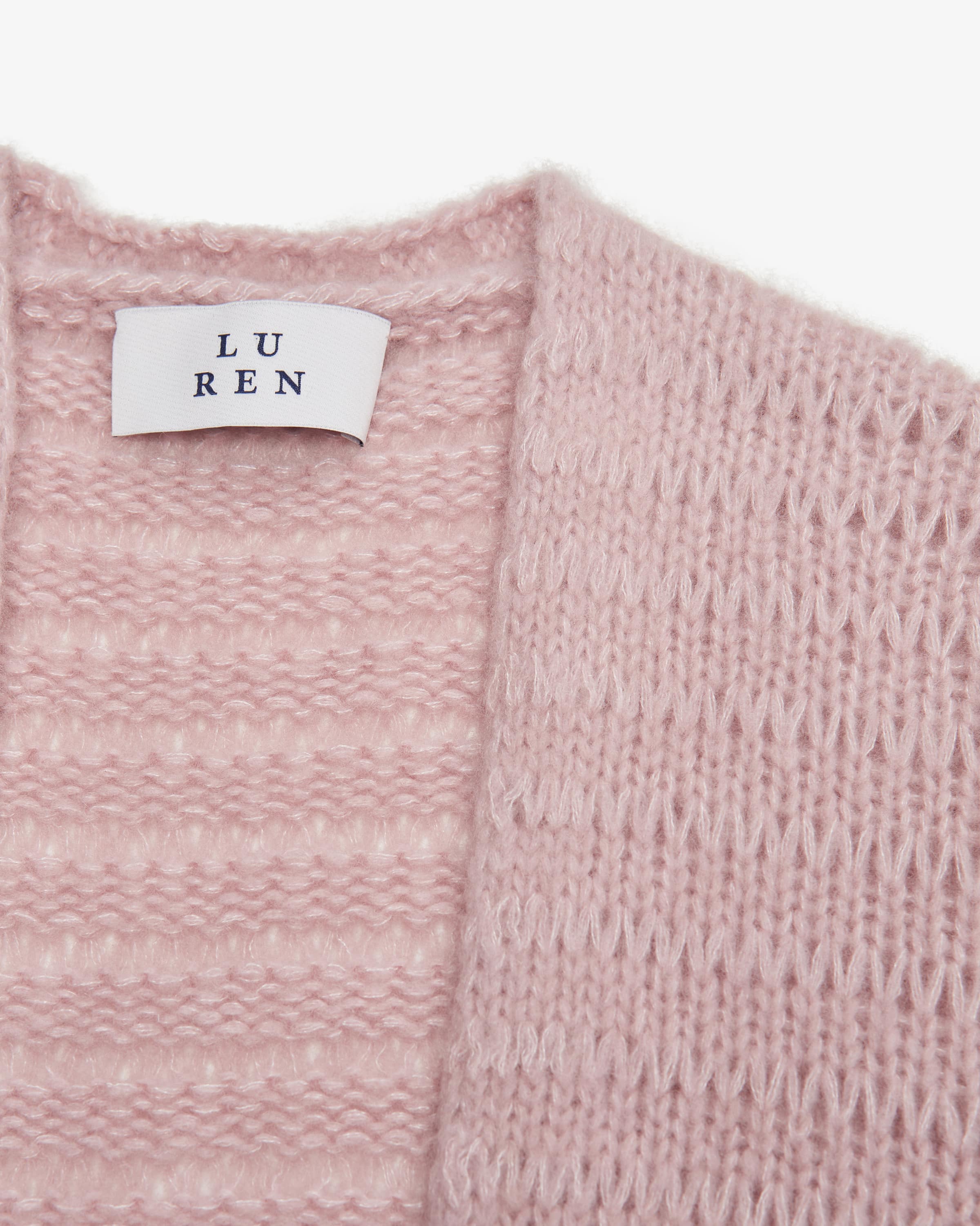 Cardigan Nasu für Damen von Lu Ren in Pinkish Grey. Das deutsche Label steht für hochwertige, minimalistische Mode mit Fokus auf edle Materialien und cleane Silhouetten. Dank der Verwendung von hochwertigem Cashmere-Seiden-Mix besticht das Modell mit besonders weichem Griff, während das Ajourstrick-Design einen komfortablen Casual-Favoriten mit Stil kreiert.
