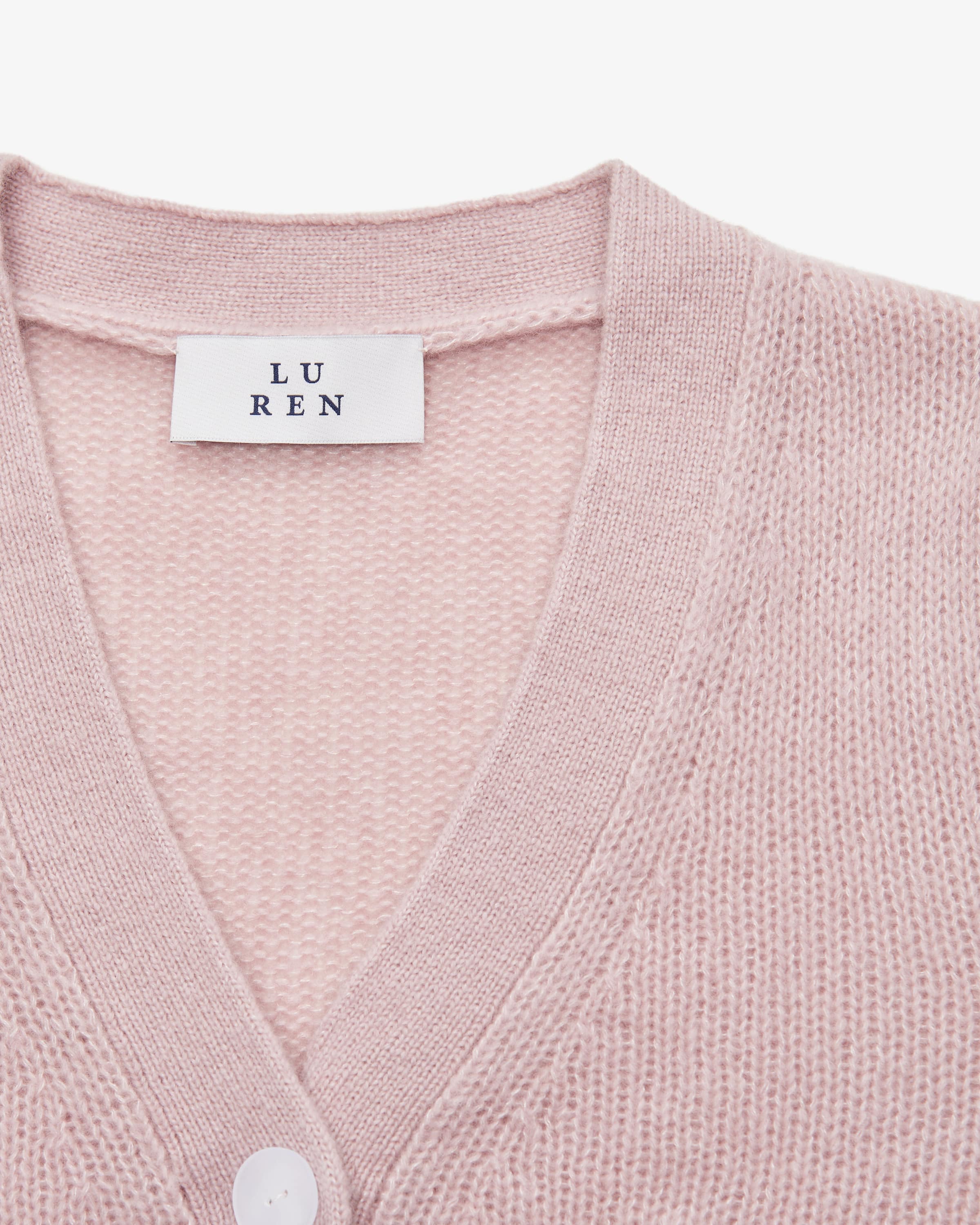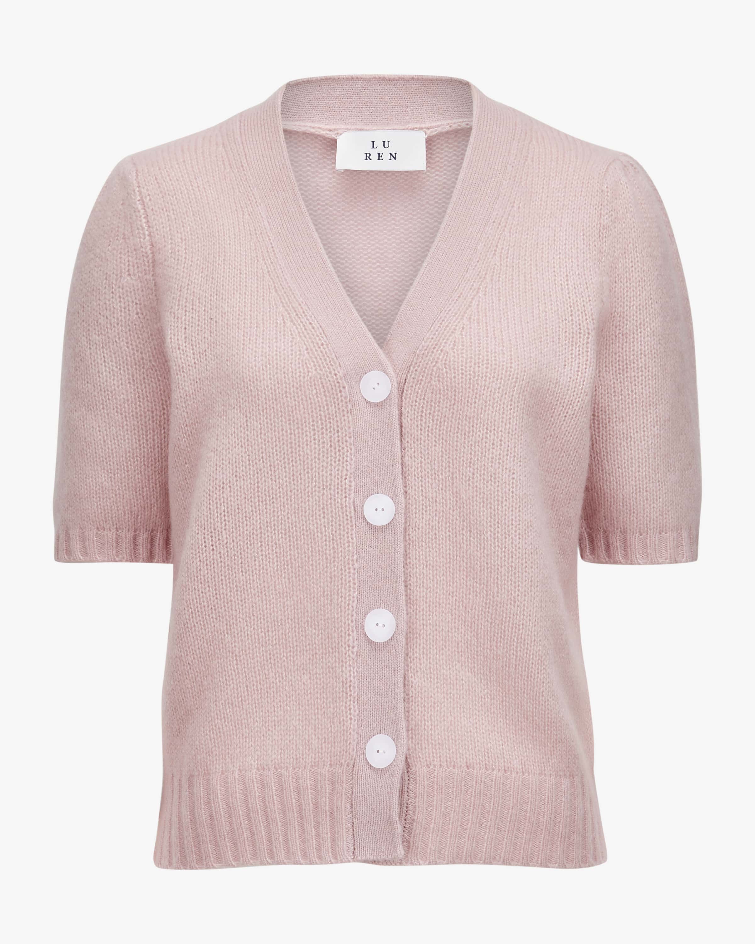Strickjacke Shiso für Damen von Lu Ren in Pinkish Grey. Das deutsche Label steht für hochwertige, minimalistische Mode mit Fokus auf edle Materialien und cleane Silhouetten. Dank der Verwendung von hochwertigem Cashmere-Seiden-Mix besticht das Kurzarm-Modell mit besonders weicher Haptik, während das klassische Strickdesign durch die organisch geformten Knöpfe sowie dezenten Puffärmel einen stilvollen Touch erhält.