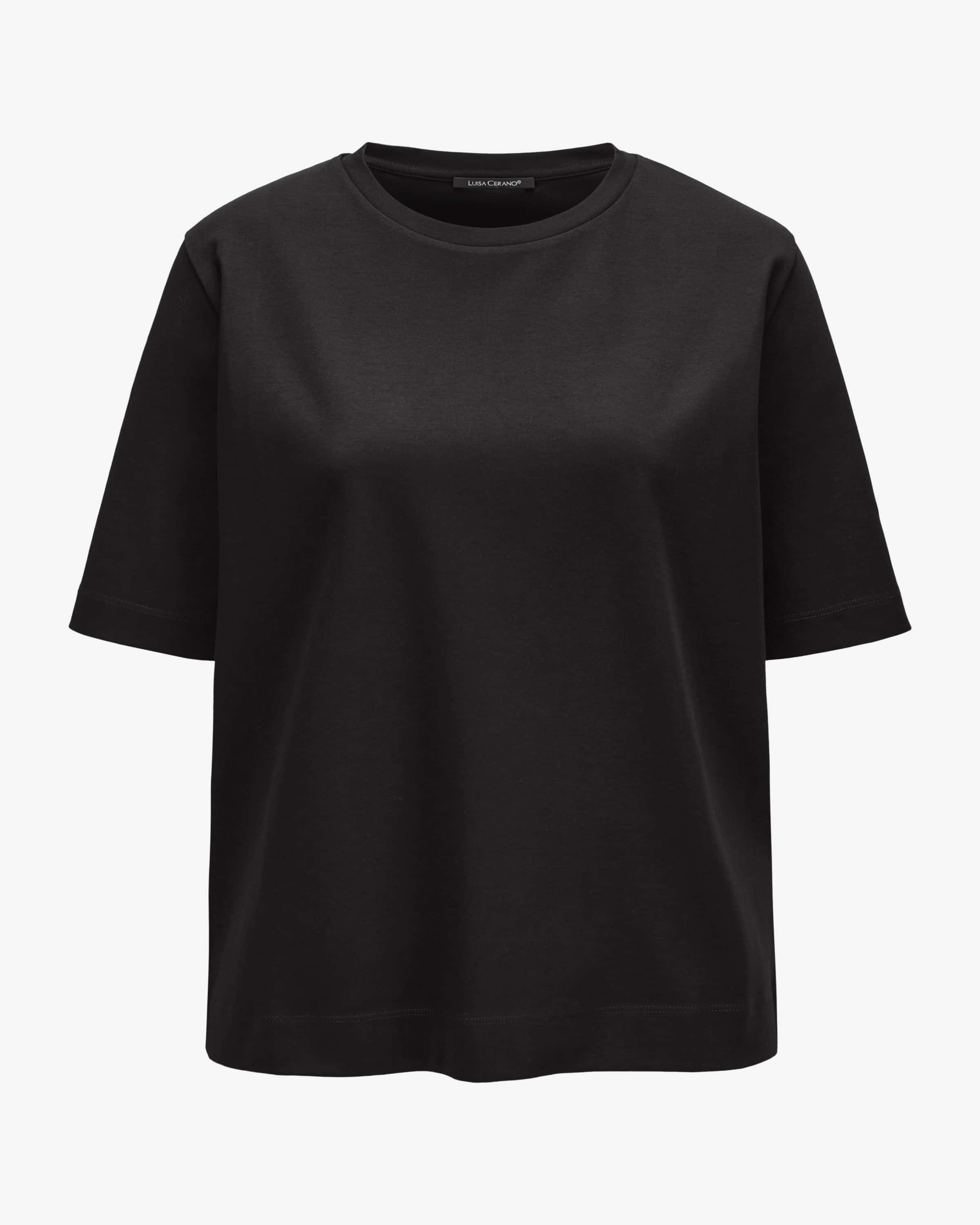 T-Shirt für Damen von Luisa Cerano in Schwarz. Das deutsche Label mit Fokus auf elegante Alltagstauglichkeit. Auch dieses Modell in cleanem Dessin, überzeugt mit fester Baumwoll-Qualität welche für angenehme Tragemomente sorgt, während klassische Details ein Basic Essential schaffen.