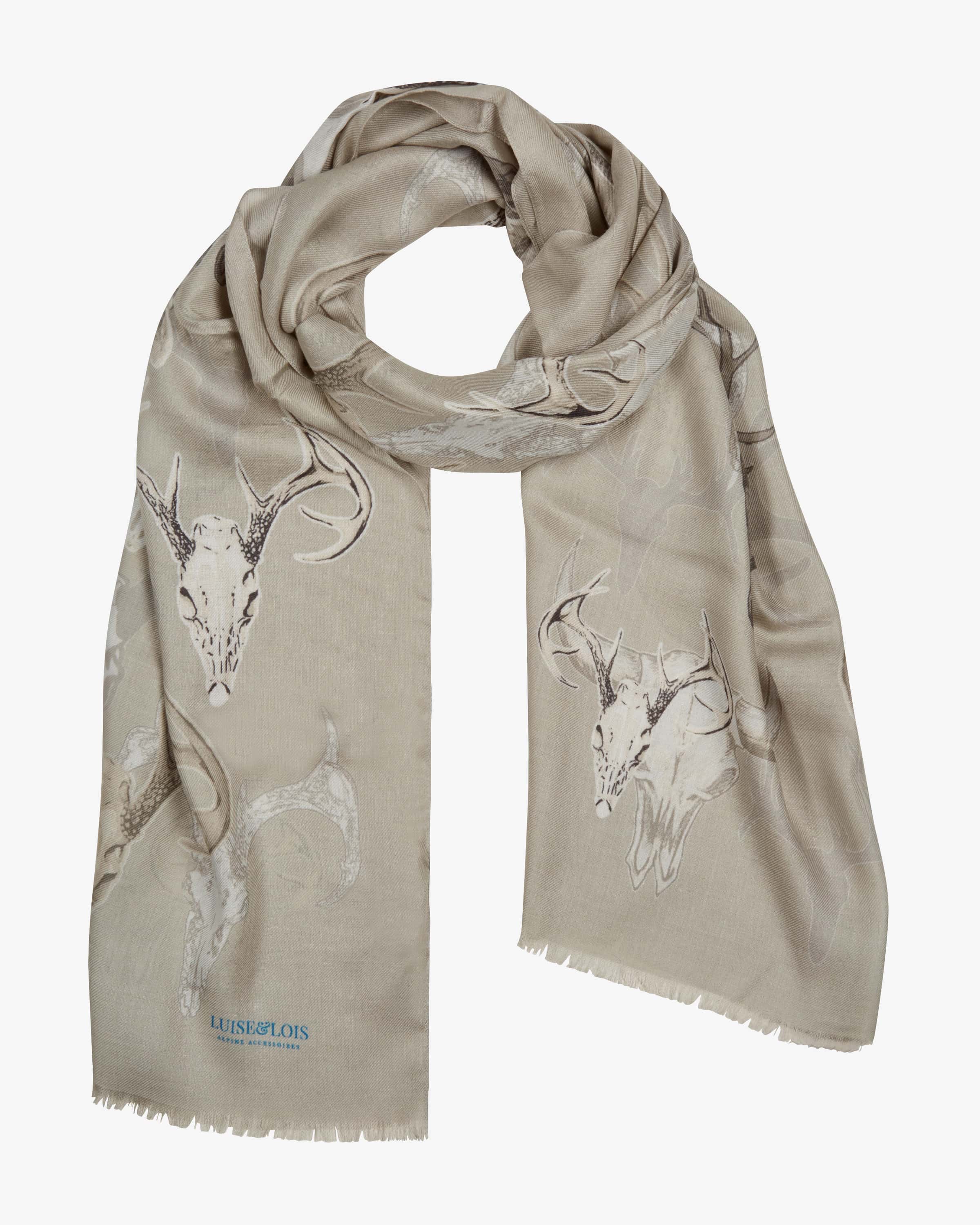 Trachten-Schal für Herren von Luise Steiner in Taupe und Hellgrau. Während die Material-Verarbeitung weichen Griff verspricht, wird durch das rustikale Hirsch-Dessin ein maskulines Accessoire für modische Trachten- Looks geschaffen.