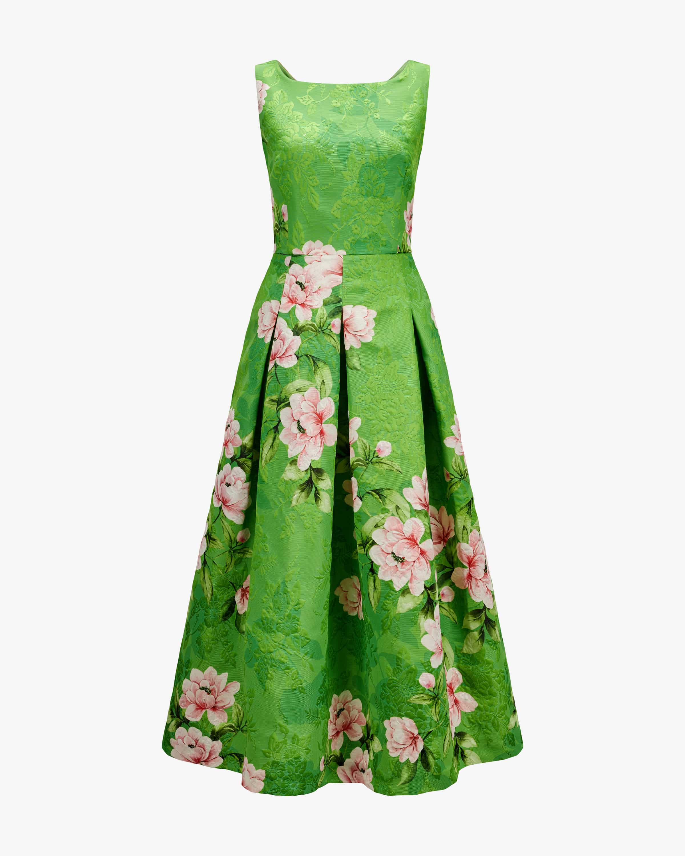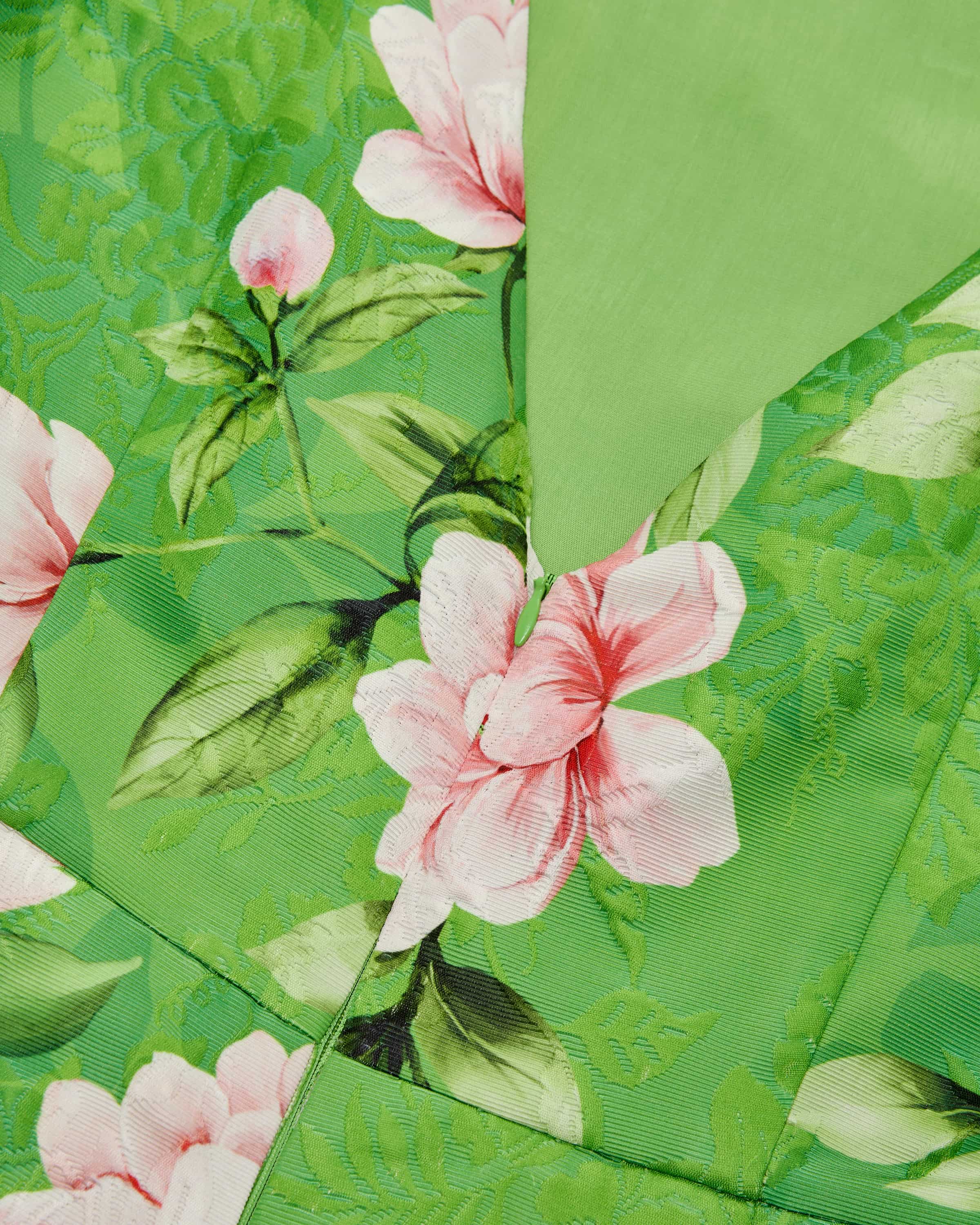 Kleid T Greta für Damen von Lunatica Milano in Grasgrün, Dunkelgrün und Rosa. Lunatica Milano steht für handgefertigte Röcke made in Italy – farbenfroh und voller La-Dolce-Vita-Charme. Auch dieses Modell aus modischem Jaquard-Dessin avanciert dank floralem Muster zum femininen Hingucker und verleiht jedem Outfit das gewisse Etwas.