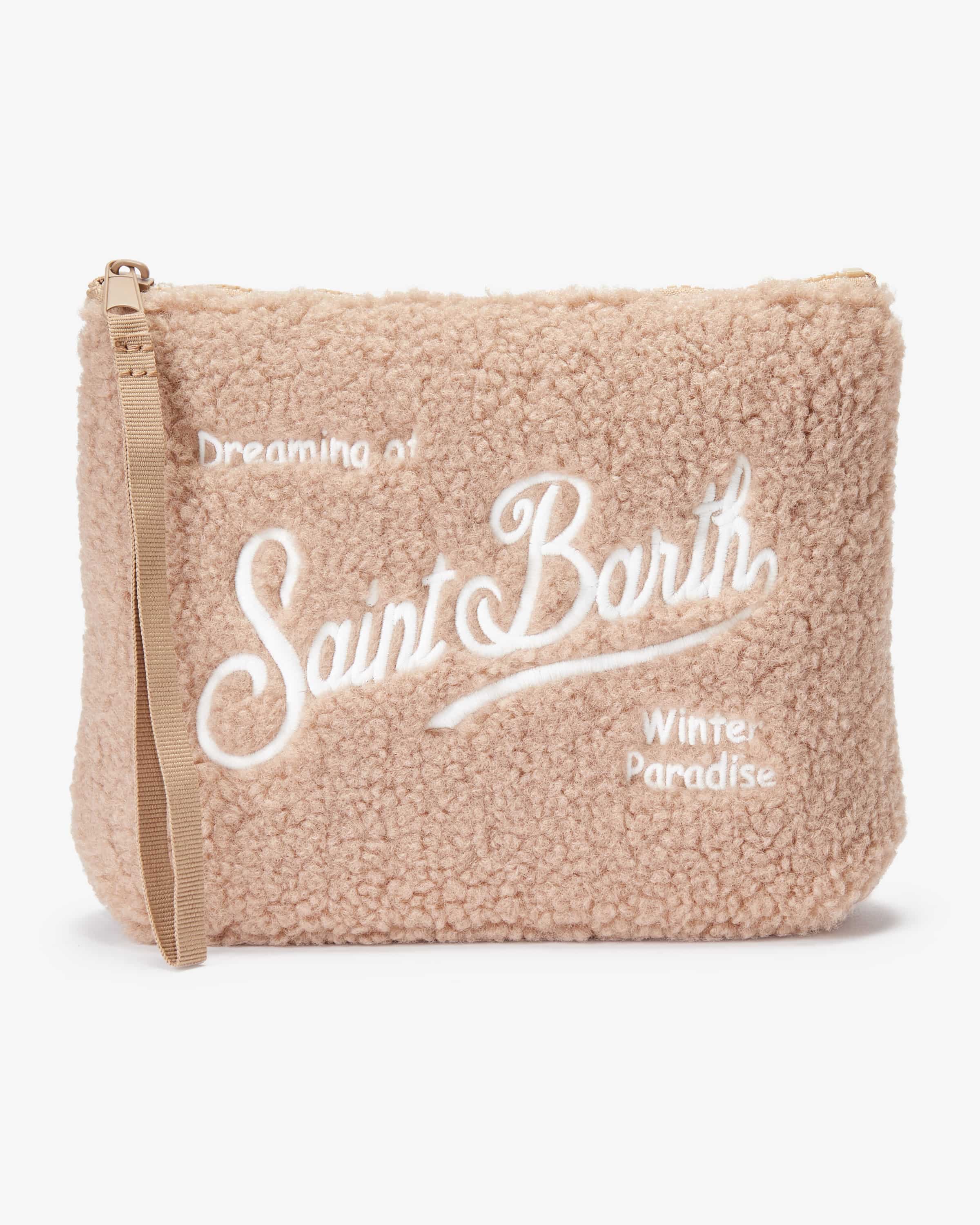 Aline Teddy Necessaire von MC2 Saint Barth in Beige und Weiß. Das Modell präsentiert sich im winterlichen Ski-Look dank der Teddyfell-Aufmachung und dem winterlichen Logo-Schriftzug in kontrastfarbiger Stickerei.