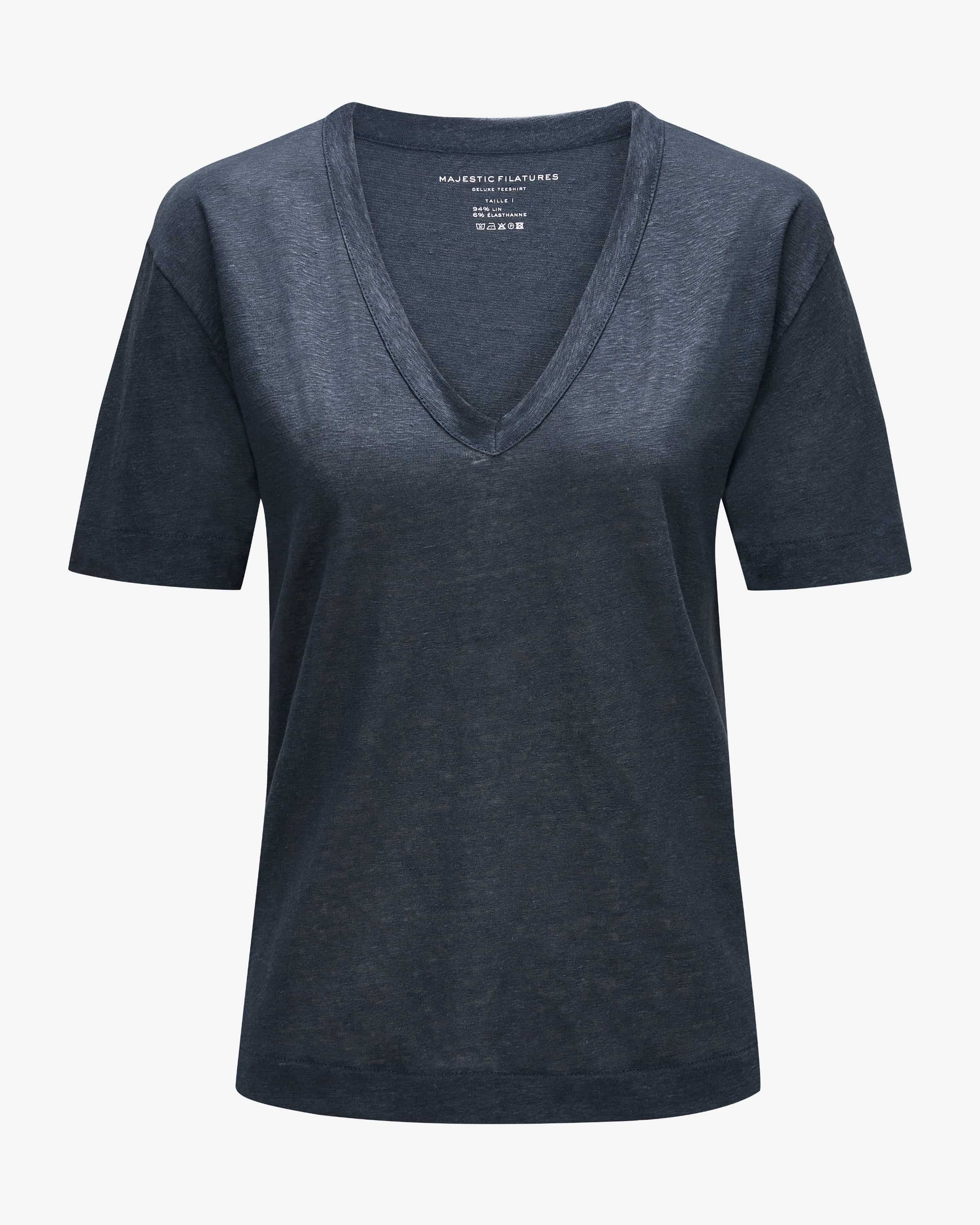 Leinen-T-Shirt für Damen von Majestic Filatures in Marine. Pariser Label für luxuriöse Basicwear. Gefertigt aus hochwertigem Leinen-Mix überzeugt das Modell in klassischer Form, während die Semi-Transparente Aufmachung für einen modischen Twist sorgt. Ein zeitloses Basic, das sich vielseitig kombinieren lässt.