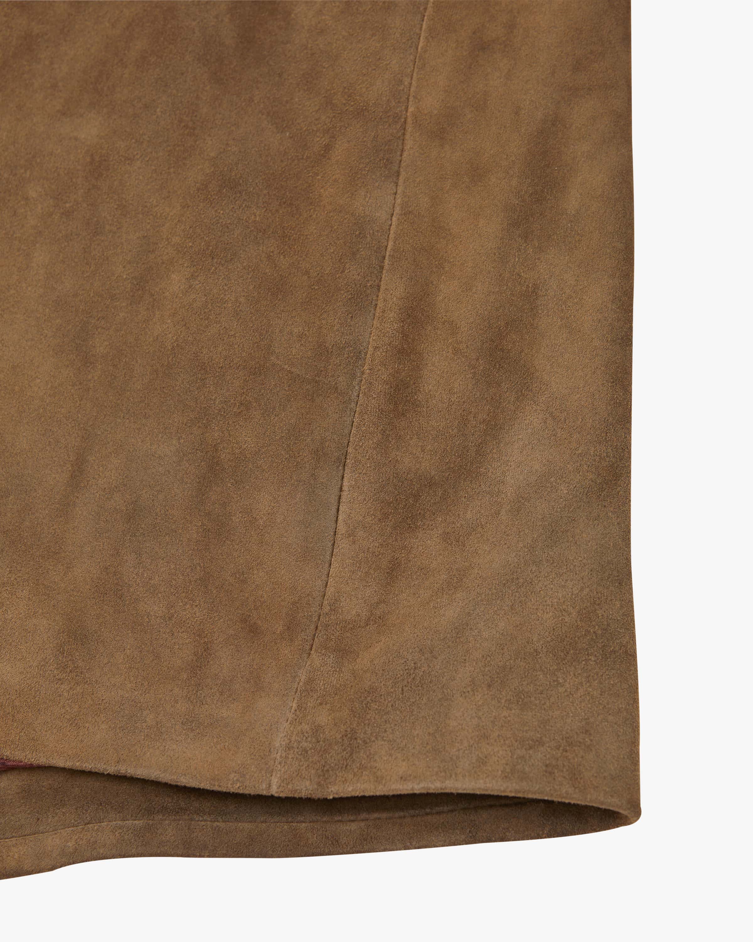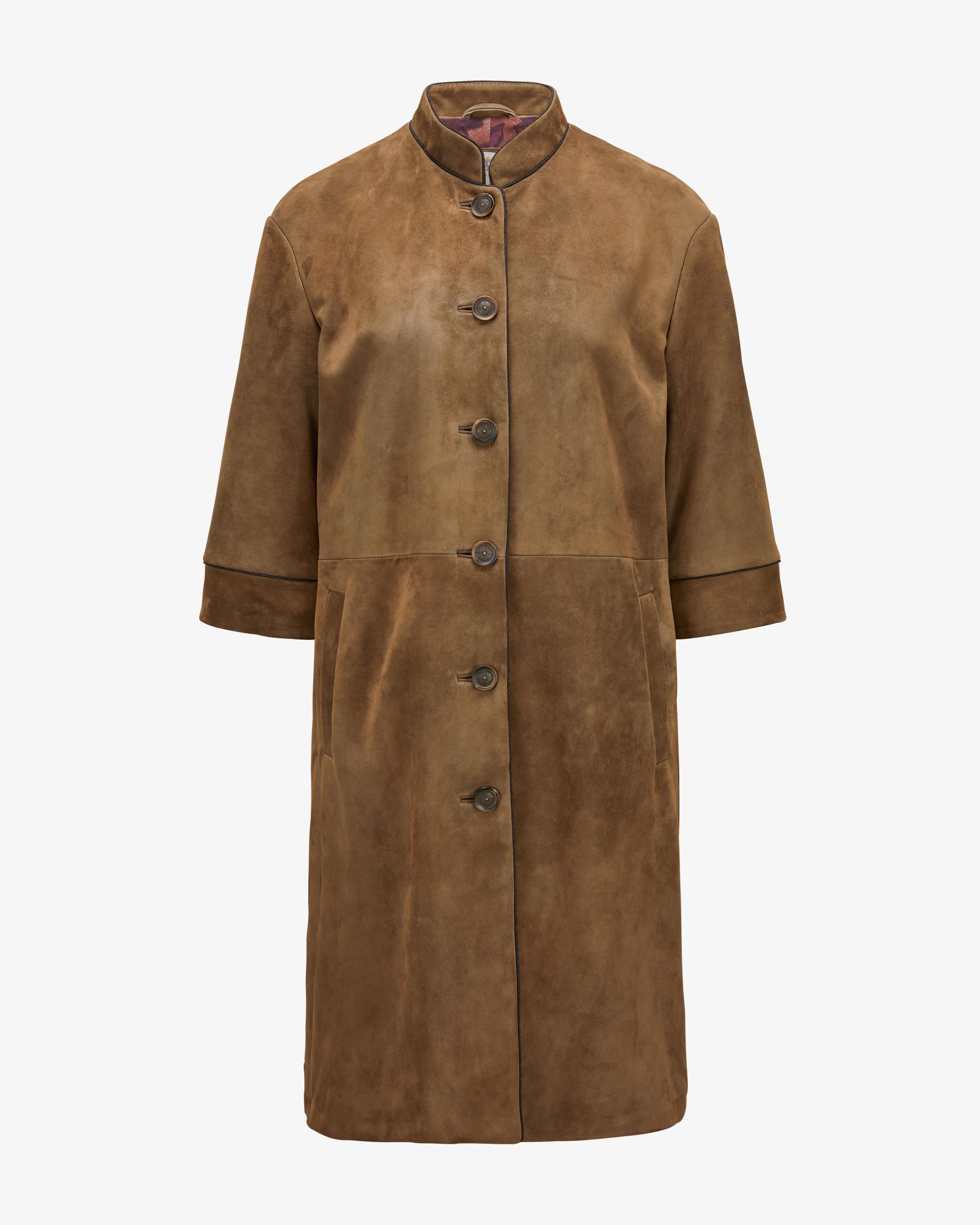 Audrey Trachten-Ledermantel für Damen von Meindl in Torf. Aus feinstem Ziegen- Veloursleder gefertigt, präsentiert sich das Modell mit verkürzten Ärmeln als modischer Hingucker mit weicher Haptik. Zugleich fügen die Schurwoll- Paspelierungen einen besonderen Akzent hinzu.