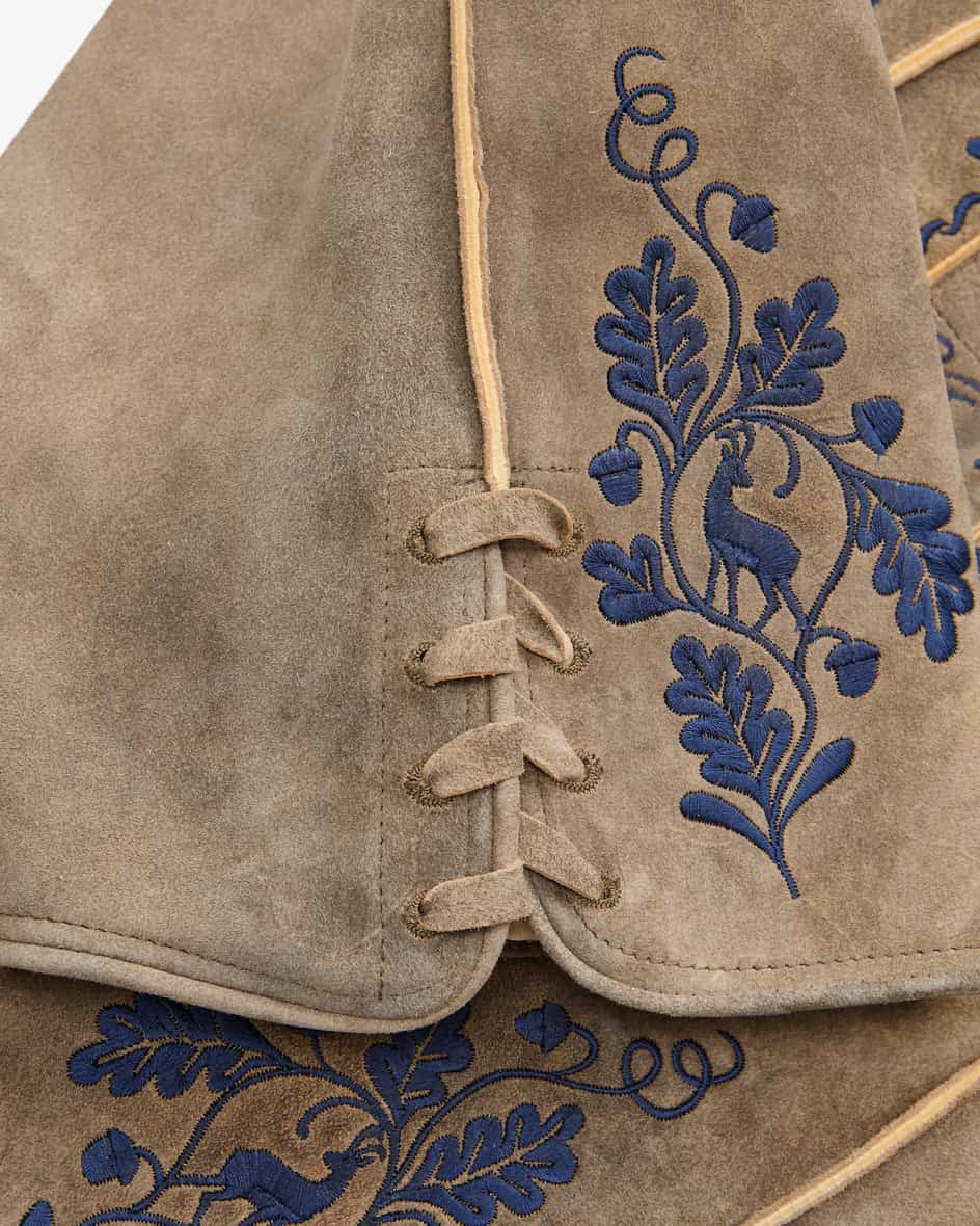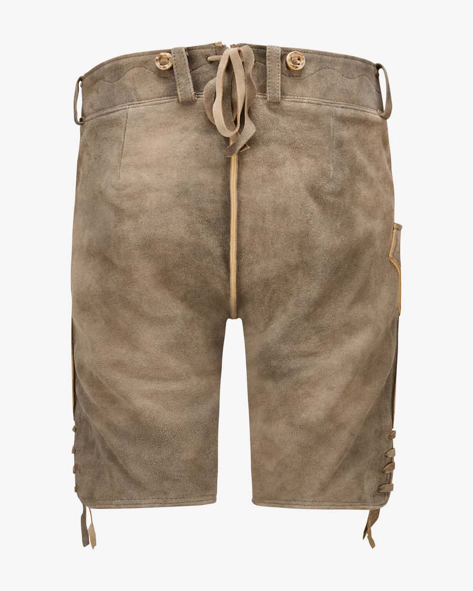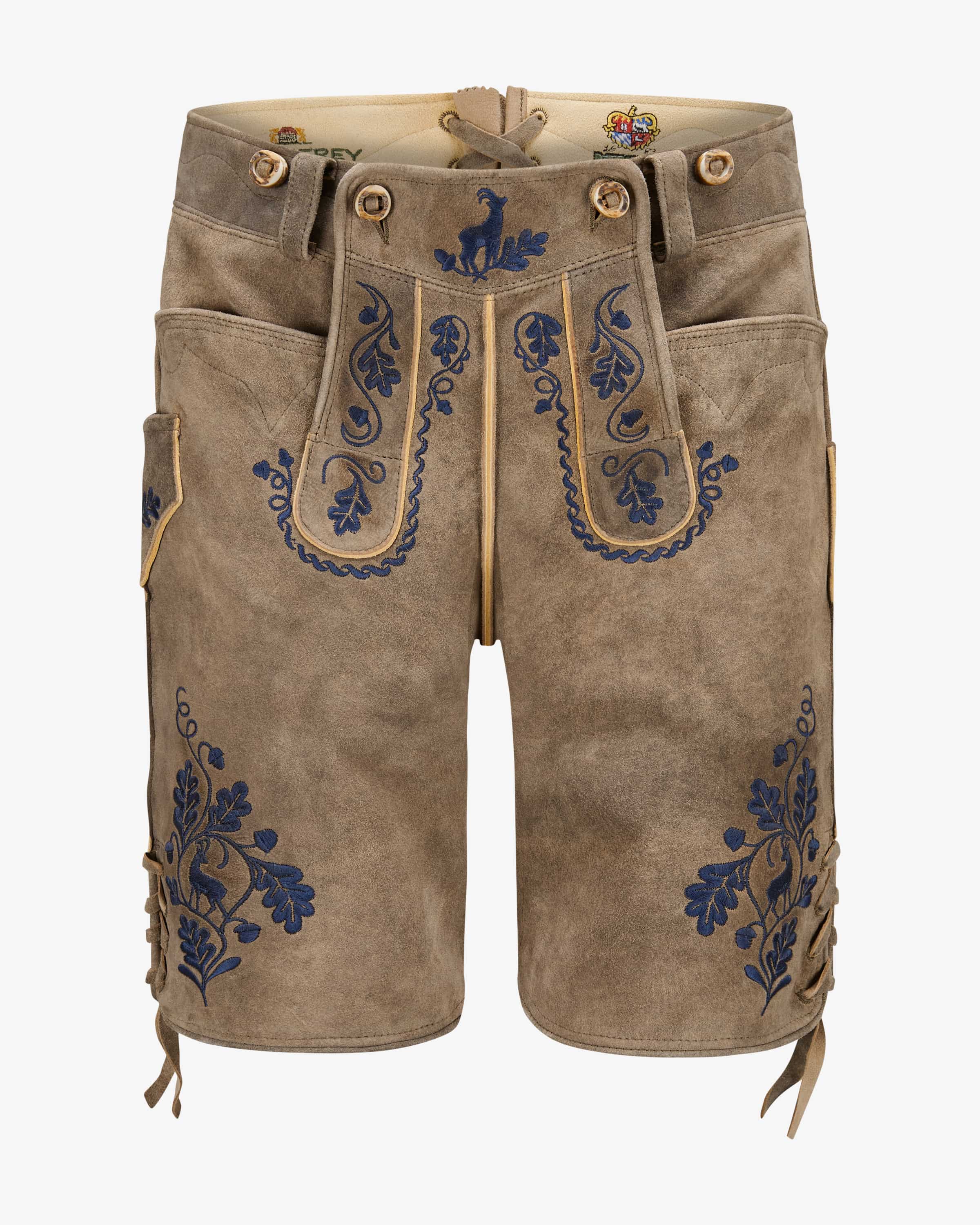 Freischütz Lederhose kurz für Herren von Meindl in Old Grey. Lederhandwerk aus Bayern - Bereits 1693 wurden bei Meindl die ersten Produkte aus Leder gefertigt und seit nun mehr als 70 Jahren fertigt das Traditionshaus hochwertige Lederhosen, die von Kennern meist ein Leben lang geschätzt werden. Dank jahrelanger Erfahrung und einer stetig-hochwertigen Qualität ist Meindl zum größten lederverarbeitenden Betrieb in Deutschland und Österreich geworden. Das traditionelle Modell Freischütz aus feinem Ziegenleder spiegelt dies gekonnt wider und wird durch die kontrastierenden Zierstickereien stilvoll ergänzt.