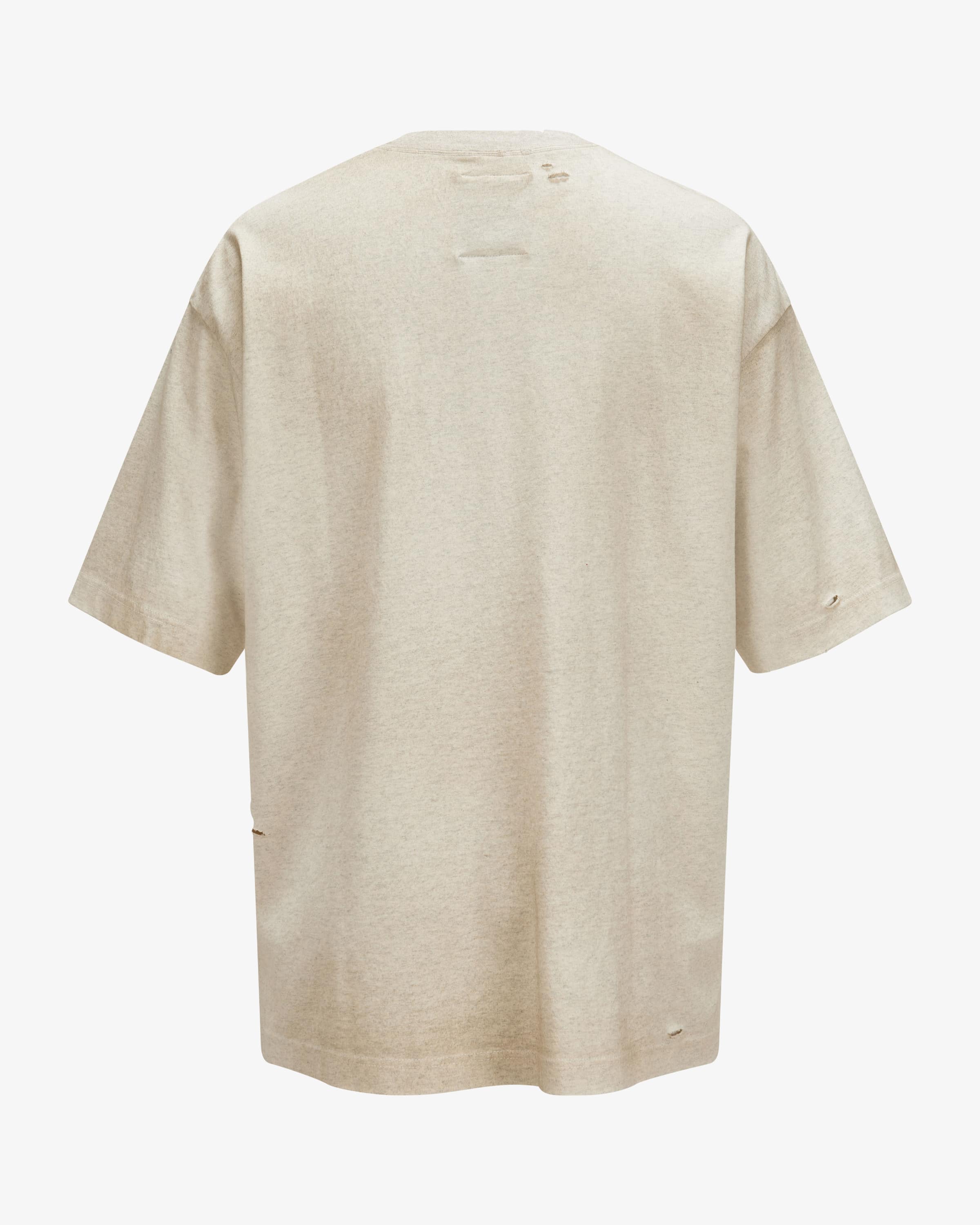 T-Shirt für Herren von Mihara Yasuhiro in Creme. Das Oversize Modell aus weicher Baumwoll-Qualität überzeugt dank Destroyed-Details und kreativem Front-Druck mit Katzenkopf mit Wording als angesagter Streetstyle-Favorit. Die Melange Optik unterstreicht zusätzlich den legeren Look.
