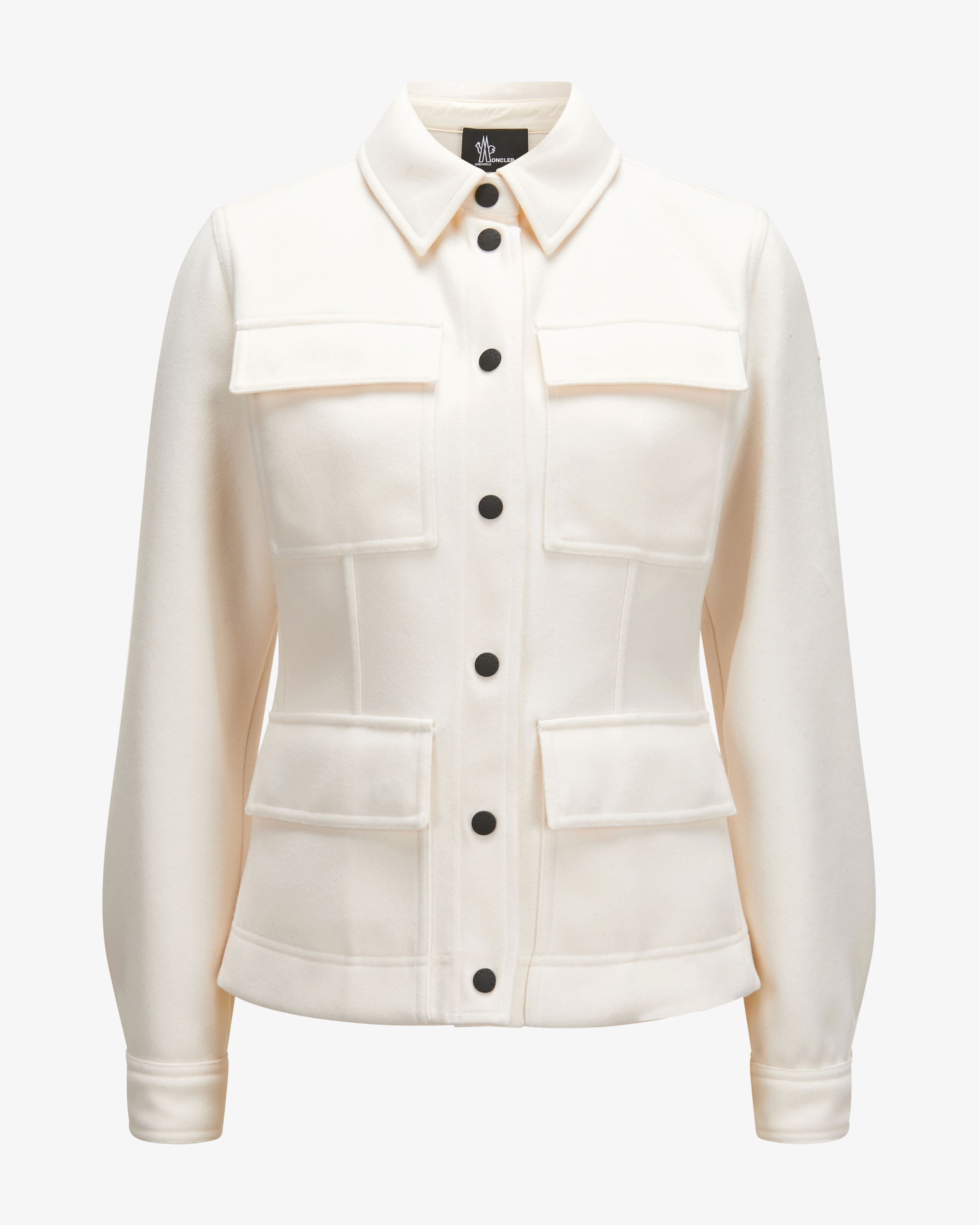 Daunenjacke für Damen von Moncler Grenoble in Creme. Das Modell besticht dank diverser Taschen als funktionaler Favorit mit Sinn für Stil, während Logo- Details sowie die antaillierte Schnittführung ein modisches Gesamtbild in femininer Silhouette kreieren.
