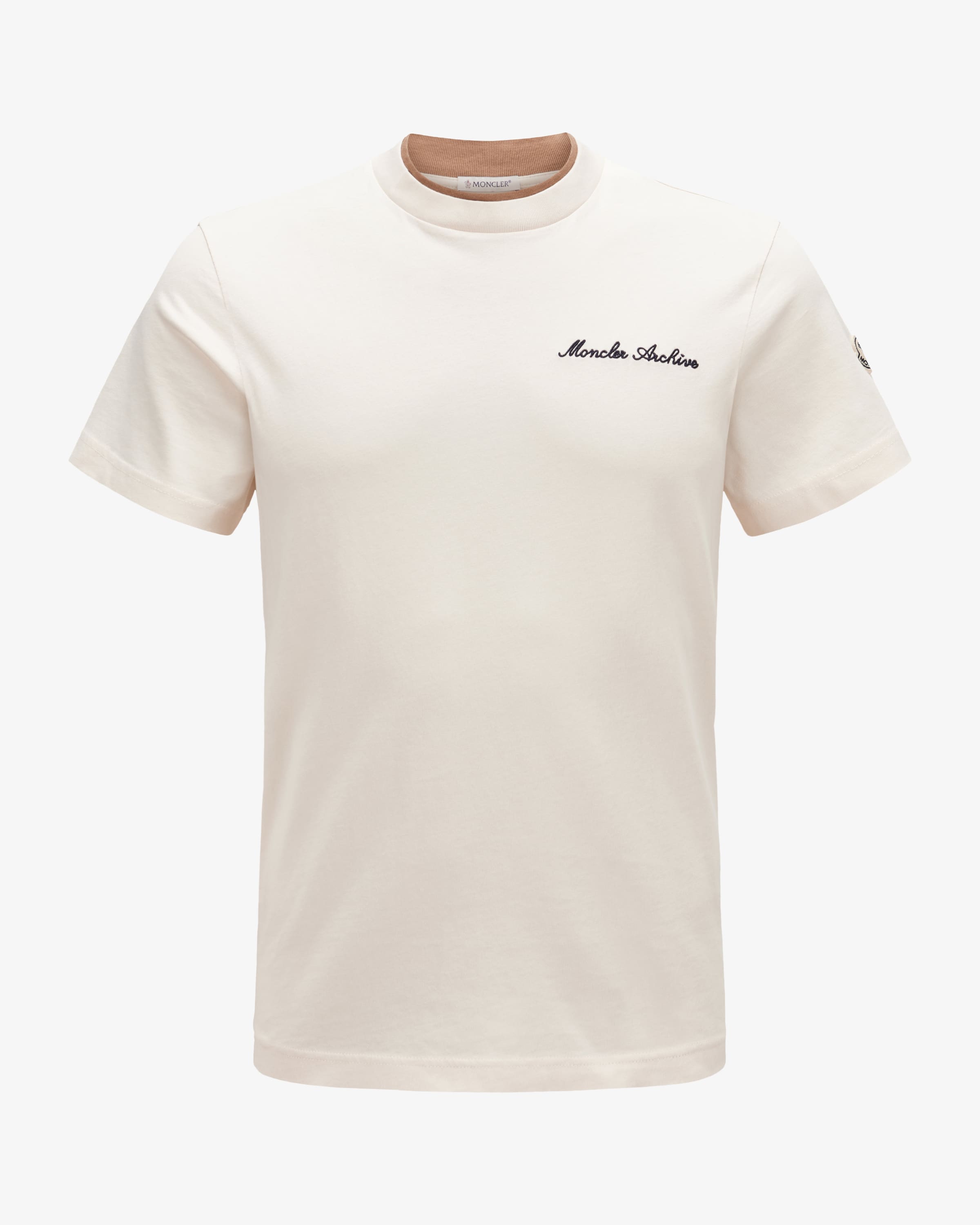 T-Shirt für Herren von Moncler in Beige. Mit diesem Modell präsentiert das italienische Traditionslabel einen legeren Alltagsbegleiter. Labeltypische Logo- Embleme akzentuieren das schlichte Design gekonnt.