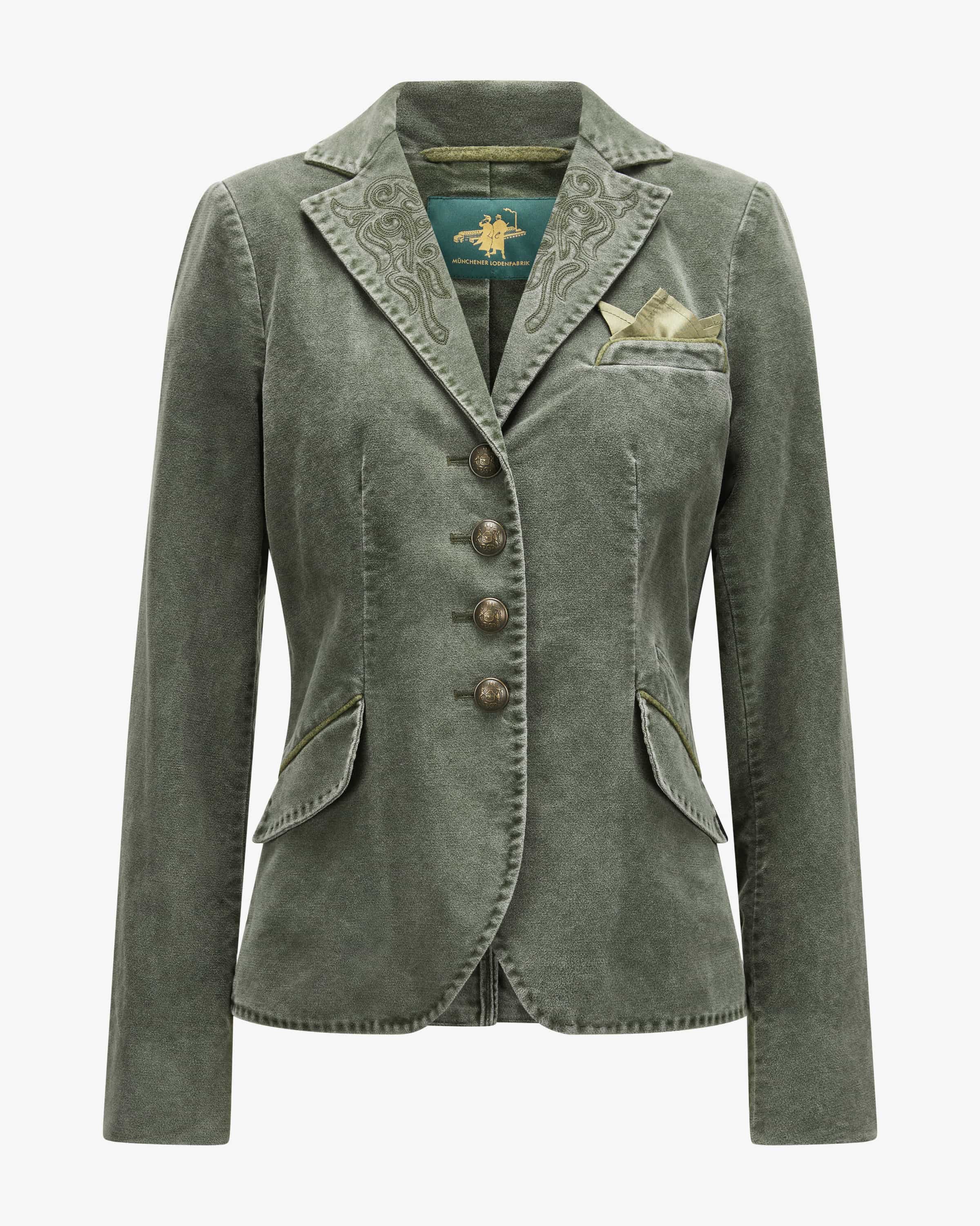 Trachtenblazer für Damen von Münchner Lodenfabrik in Oliv. Lodenmanufaktur mit tiefen Wurzeln in Bayern. Auch dieses Modell in Baumwoll-Qualität überzeugt mit angenehmen Tragemomenten, während die markanten Wappenknöpfe und Paspelierungen einen traditionellen Begleiter für vielseitige Looks kreieren.