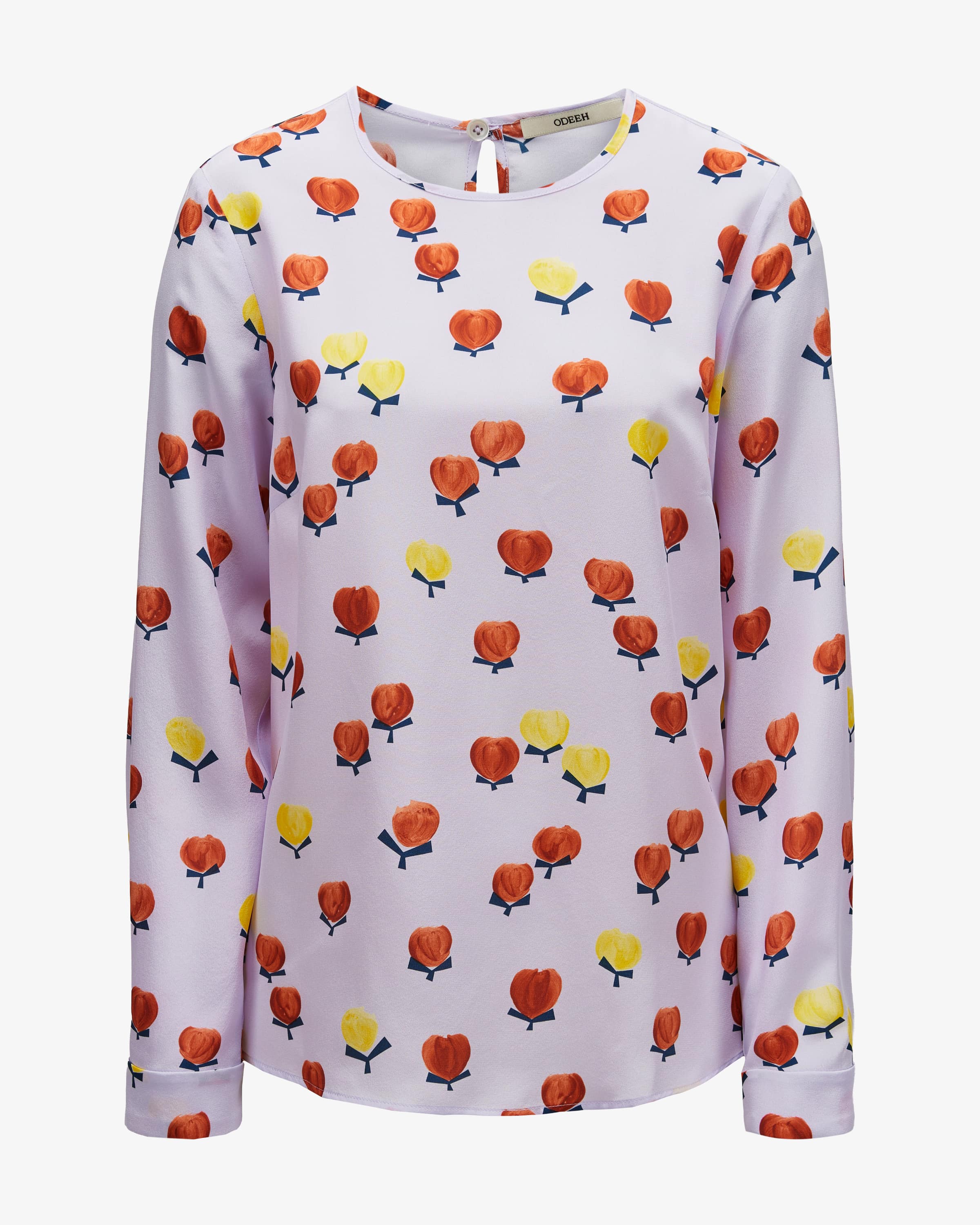 Seidenbluse für Damen von Odeeh in Flieder, Gelb und Orange. Das Modell präsentiert sich dank der fließenden Seiden-Qualität mit leichtem Tragegefühl und femininem Charme, während der geometrische Tulpen-Print einen besonderen Charakter verleiht.