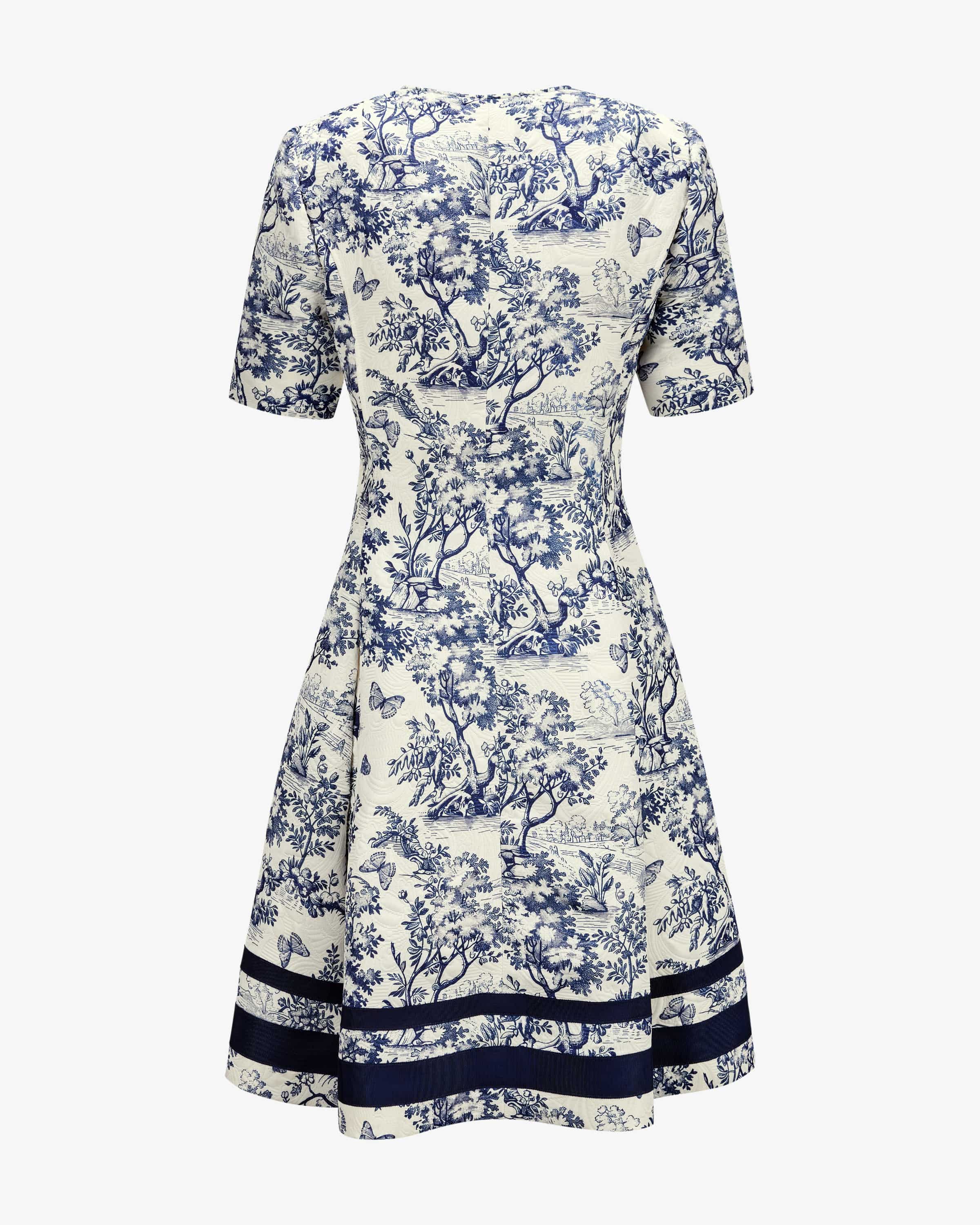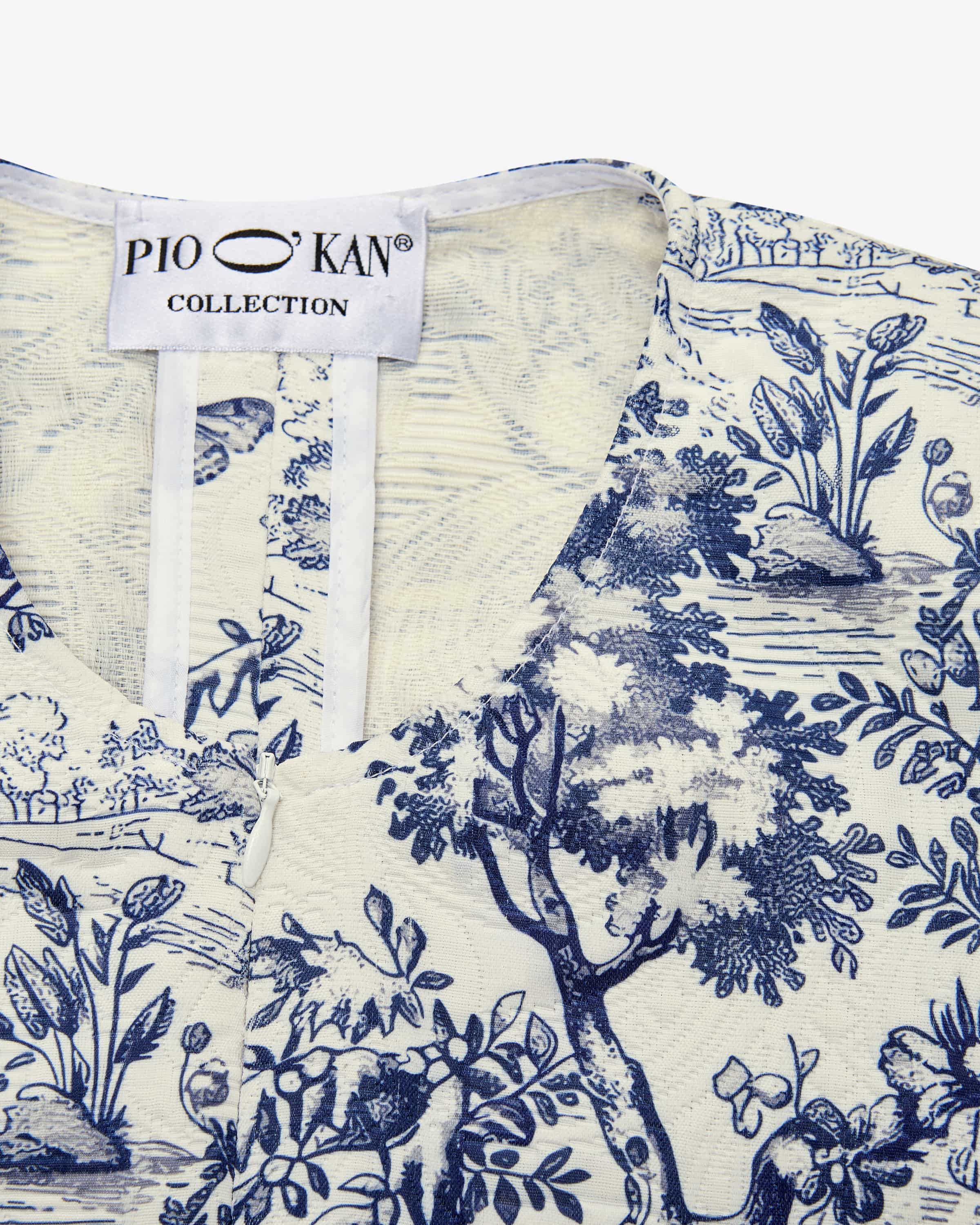 Kleid Communi für Damen von Pio O'Kan in Blau und Weiß. Das Modell in femininer Silhouette überzeugt mit fester Haptik, während die betonte Schulterpartie für besonderes Augenmerk sorgt und das detailreiche, botanische Design das Gesamtbild gekonnt abrundet.