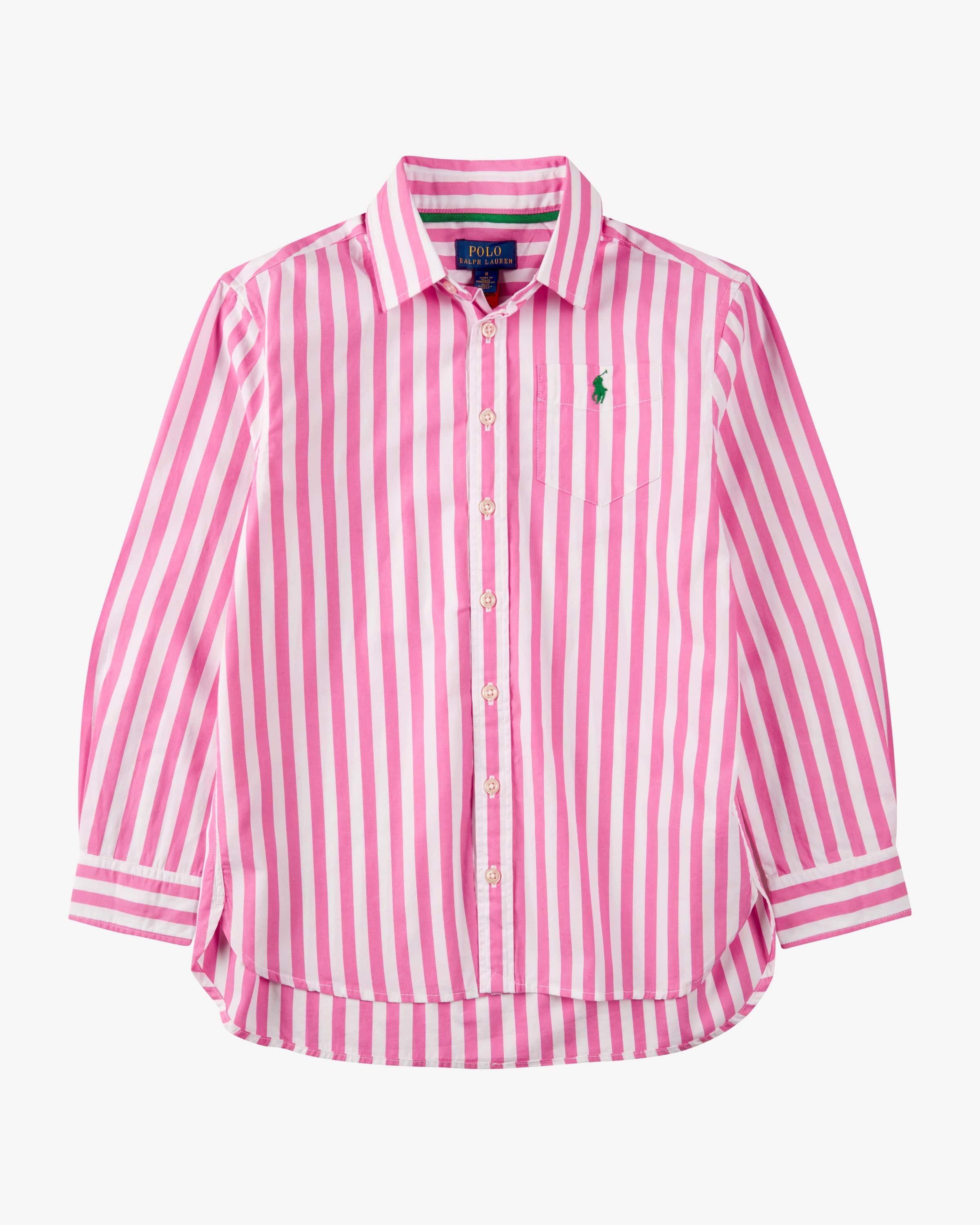 Bluse für Mädchen von Polo Ralph Lauren in Pink und Weiß. Das Modell überzeugt dank hochwertiger Baumwoll-Qualität mit angenehmem Tragekomfort, während die kontrastierende Polo-Stickerei und das modische Streifenmuster den Style gekonnt abrundet.